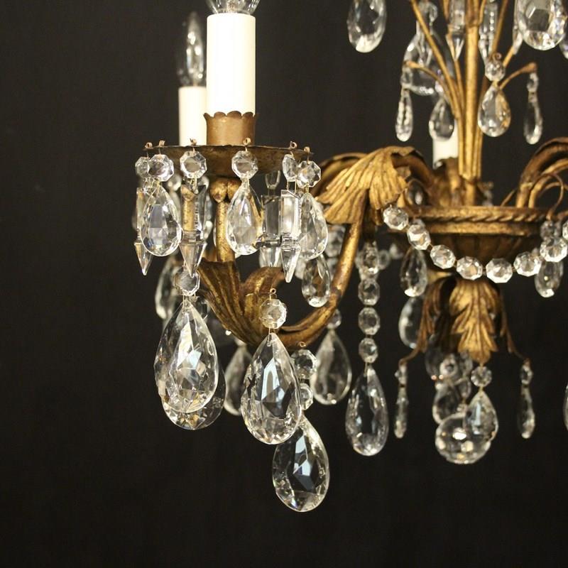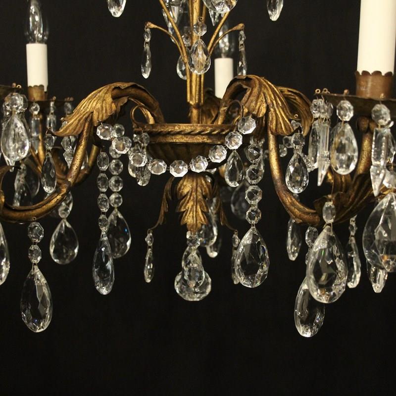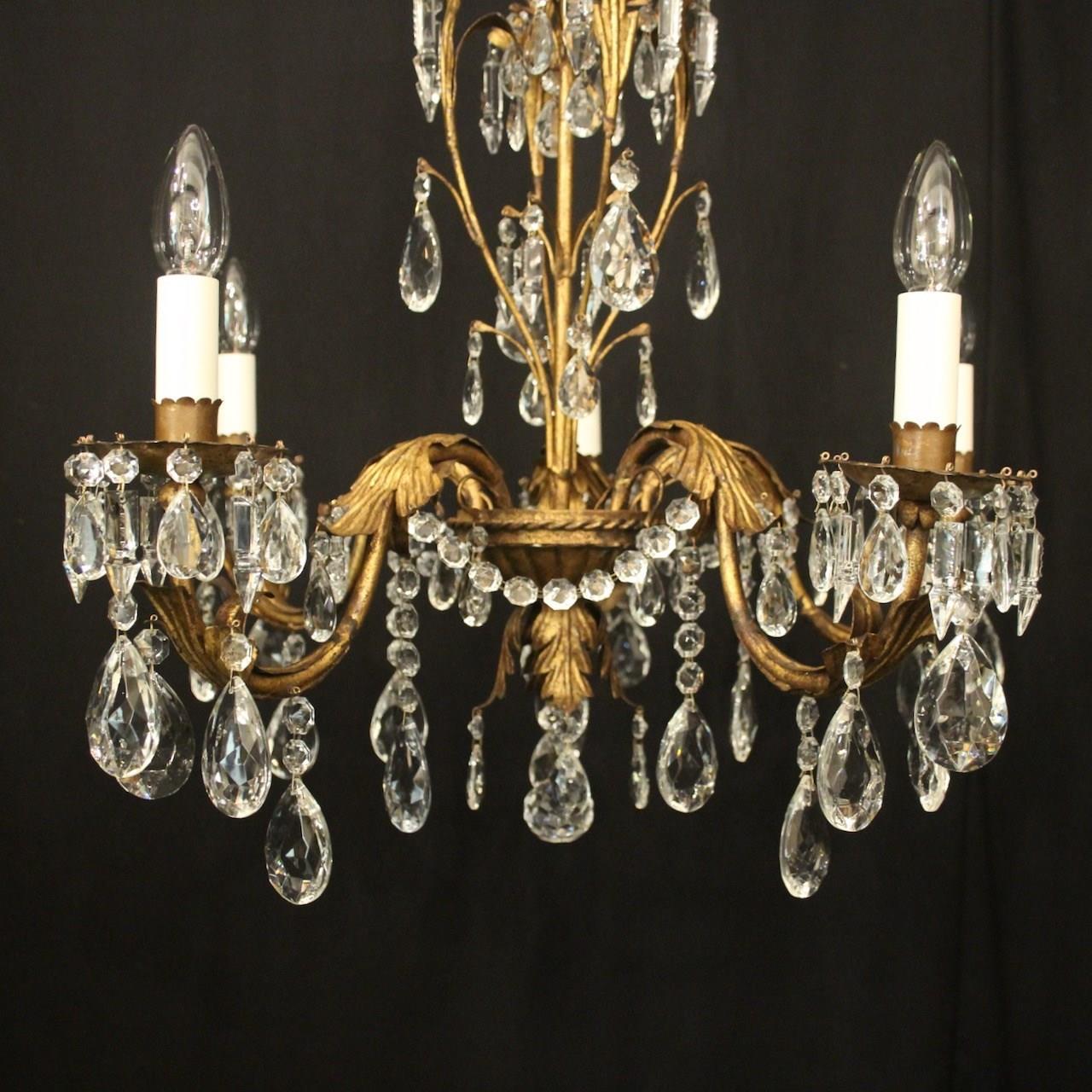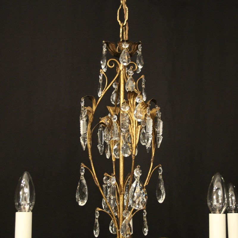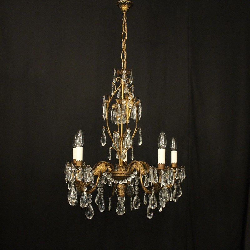 A decorative French gilded toleware 5 light chandelier, the metal leaf scrolling arms with foliated bobeche drip pans and sectional leaf candle sconces, issuing from an open cage centre with leaf canopy and decorated overall in faceted crystal pendants, having the original chain and ceiling rose, lovely patination. Fully rewired and PAT tested. All our chandeliers come with ceiling fixings and spare bulbs.