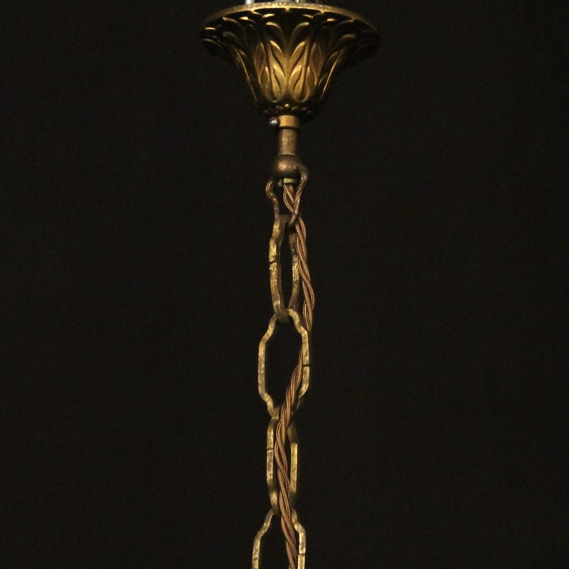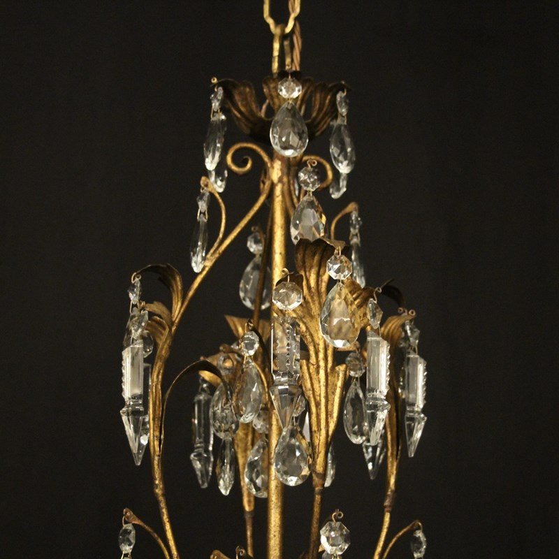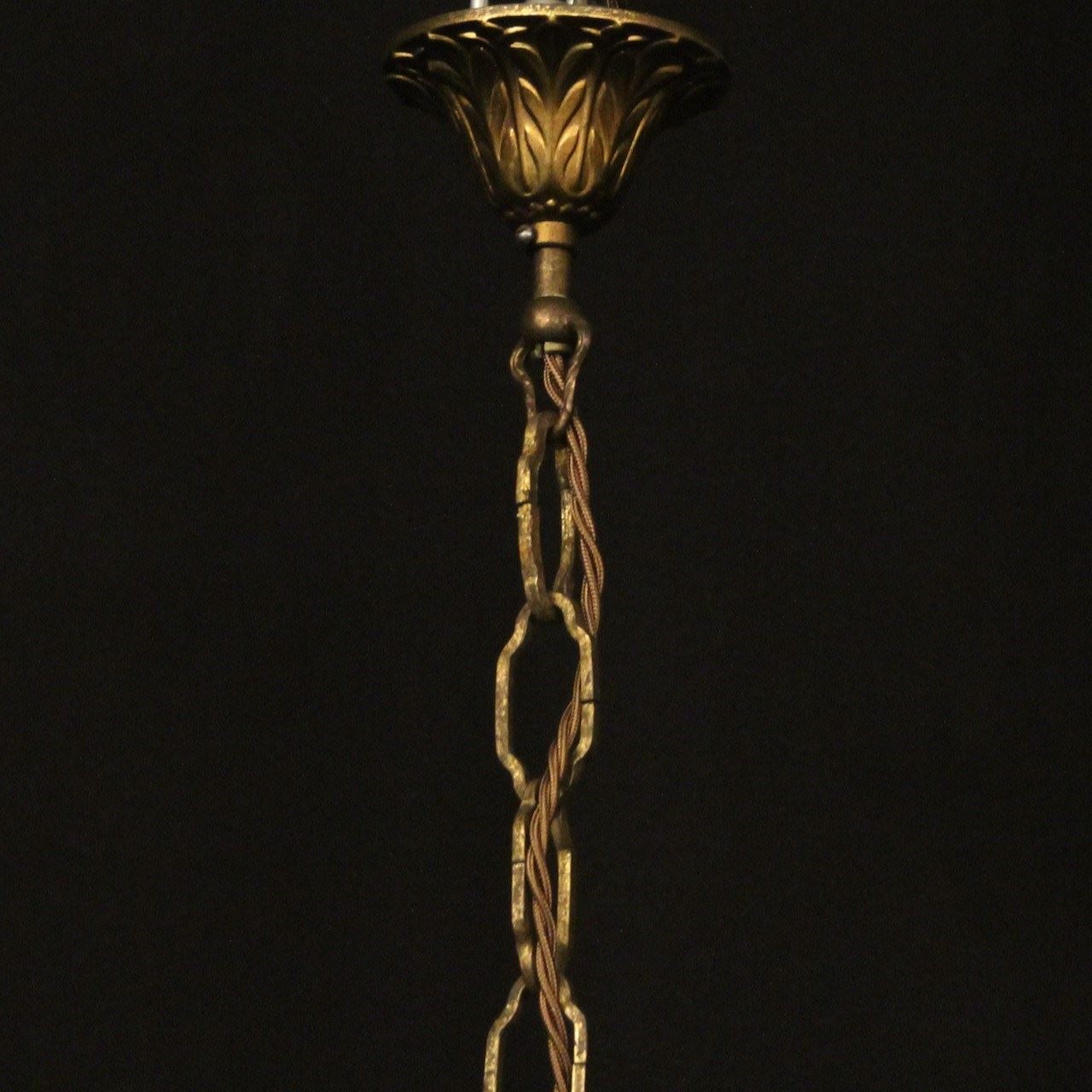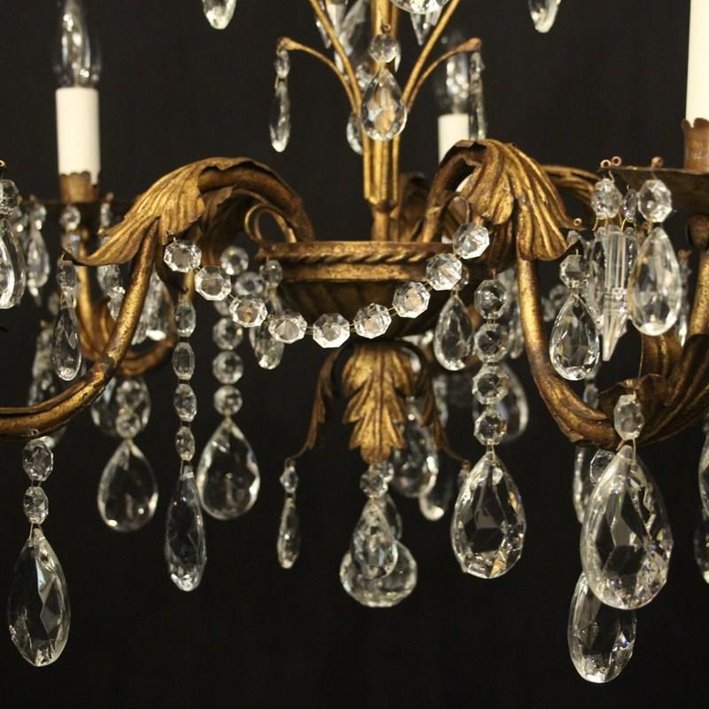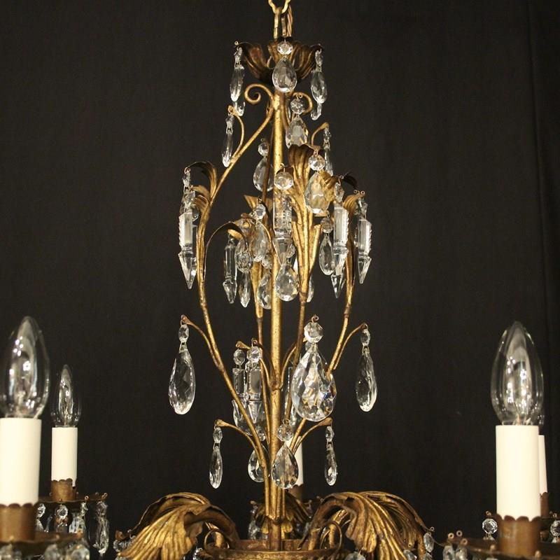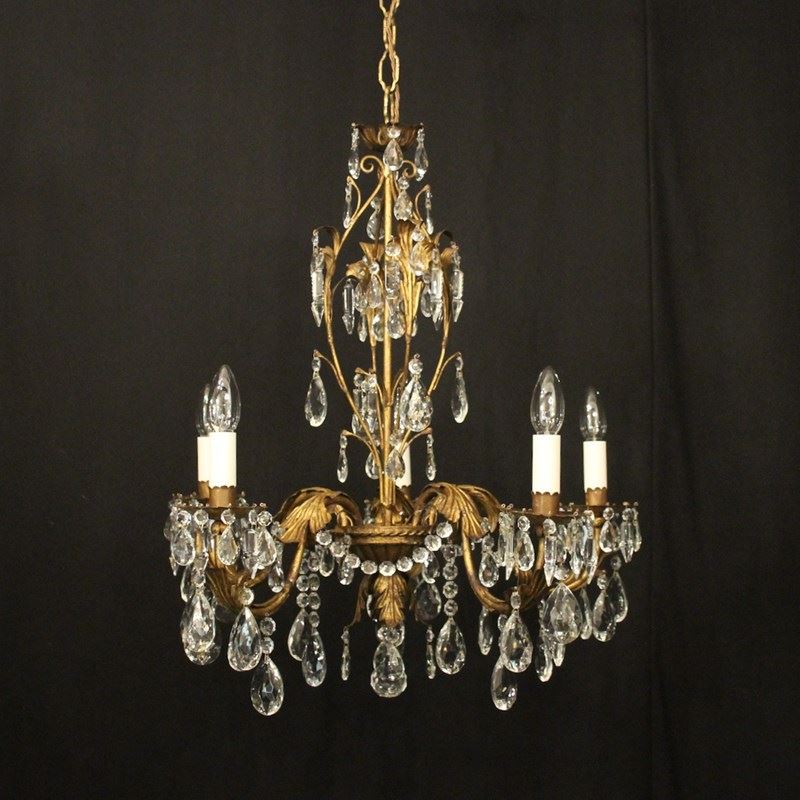 A decorative French gilded toleware 5 light chandelier, the metal leaf scrolling arms with foliated bobeche drip pans and sectional leaf candle sconces, issuing from an open cage centre with leaf canopy and decorated overall in faceted crystal pendants, having the original chain and ceiling rose, lovely patination. Fully rewired and PAT tested. All our chandeliers come with ceiling fixings and spare bulbs.