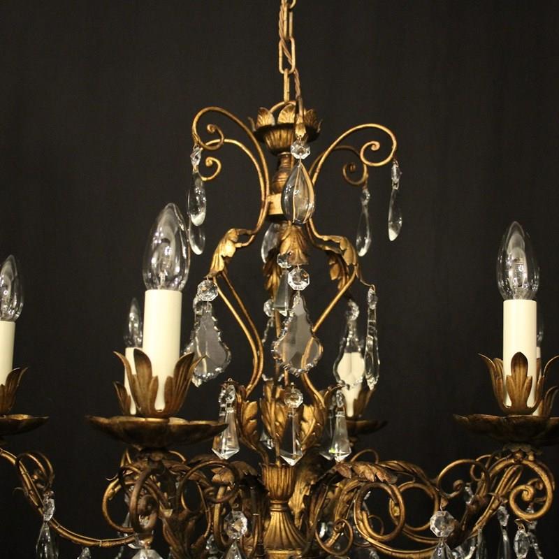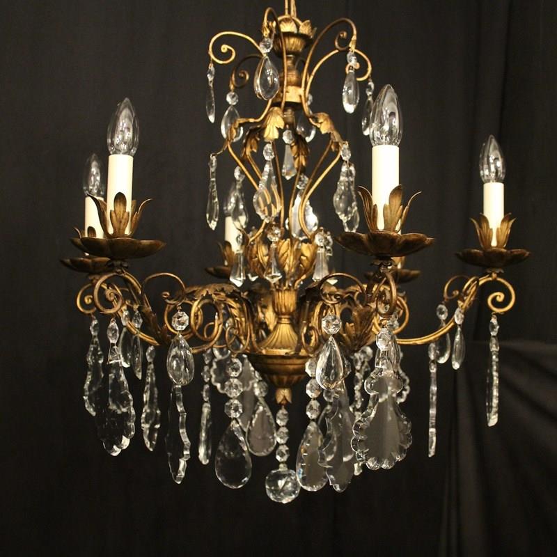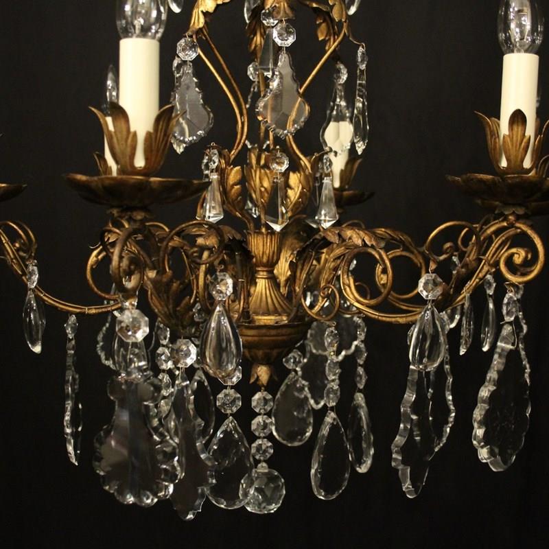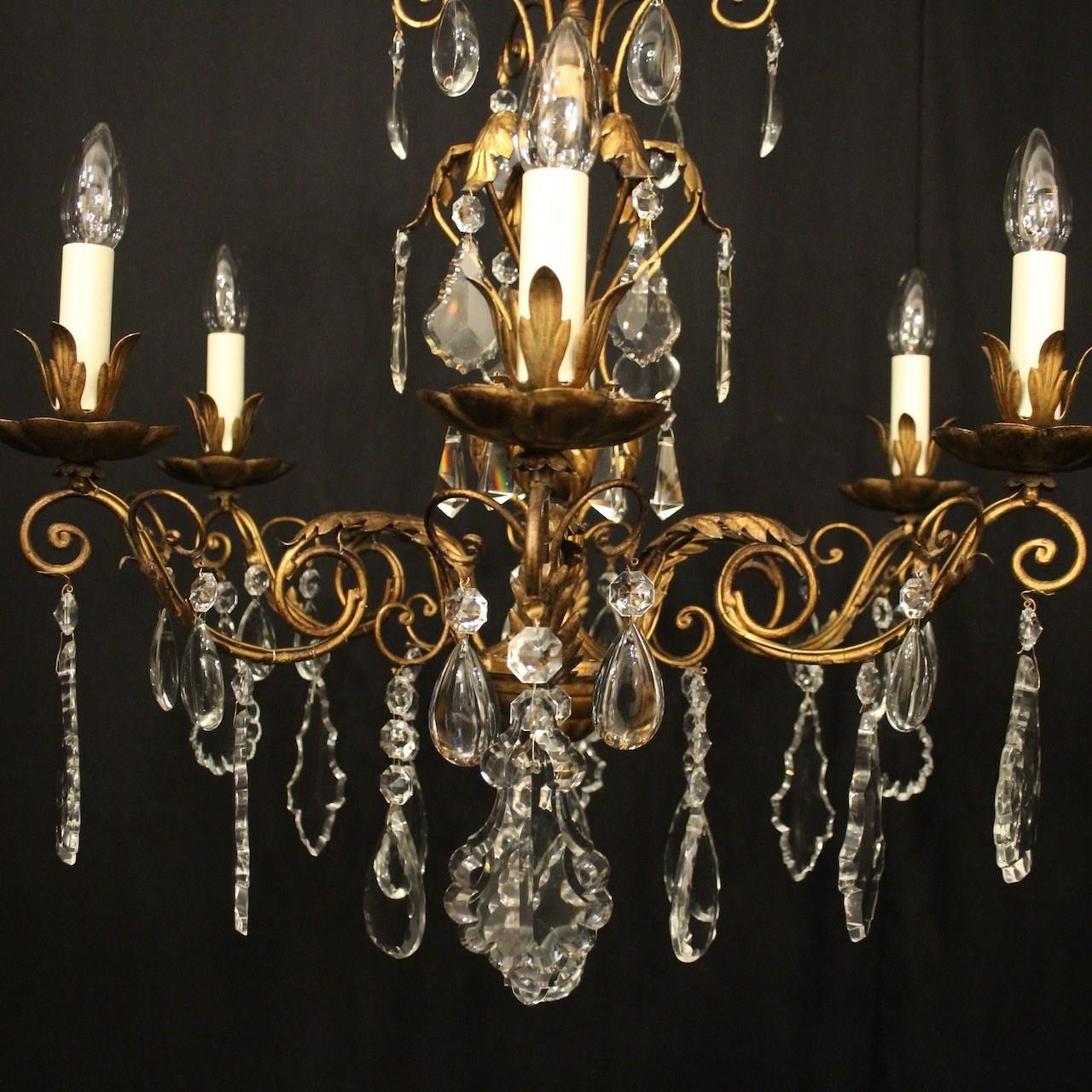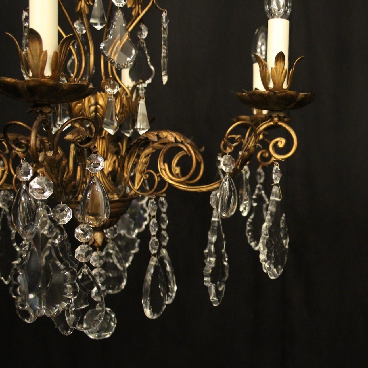 A pretty French gilded toleware 6 light chandelier, the metal leaf scrolling arms with foliated bobeche drip pans and sectional leaf candle sconces, issuing from an open cage centre with wire work canopy and decorated overall in faceted crystal pendants, having the original chain and ceiling rose, lovely patination with original colouration and good proportions. Fully rewired and PAT tested. All our chandeliers come with ceiling fixings and spare bulbs.
