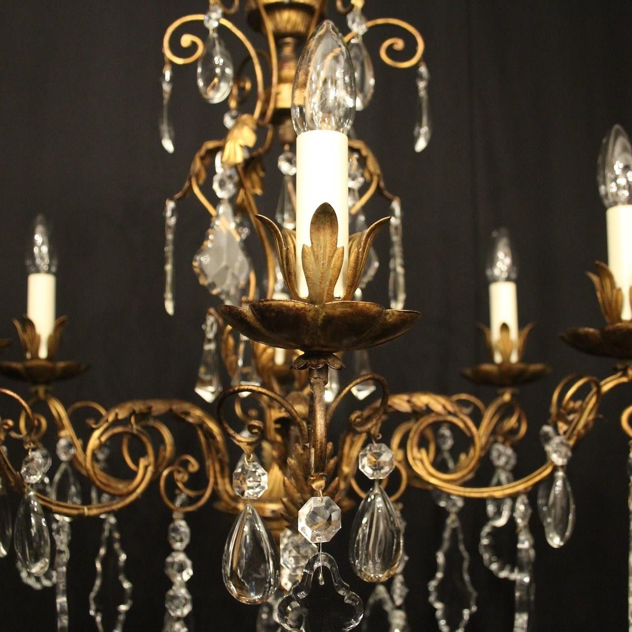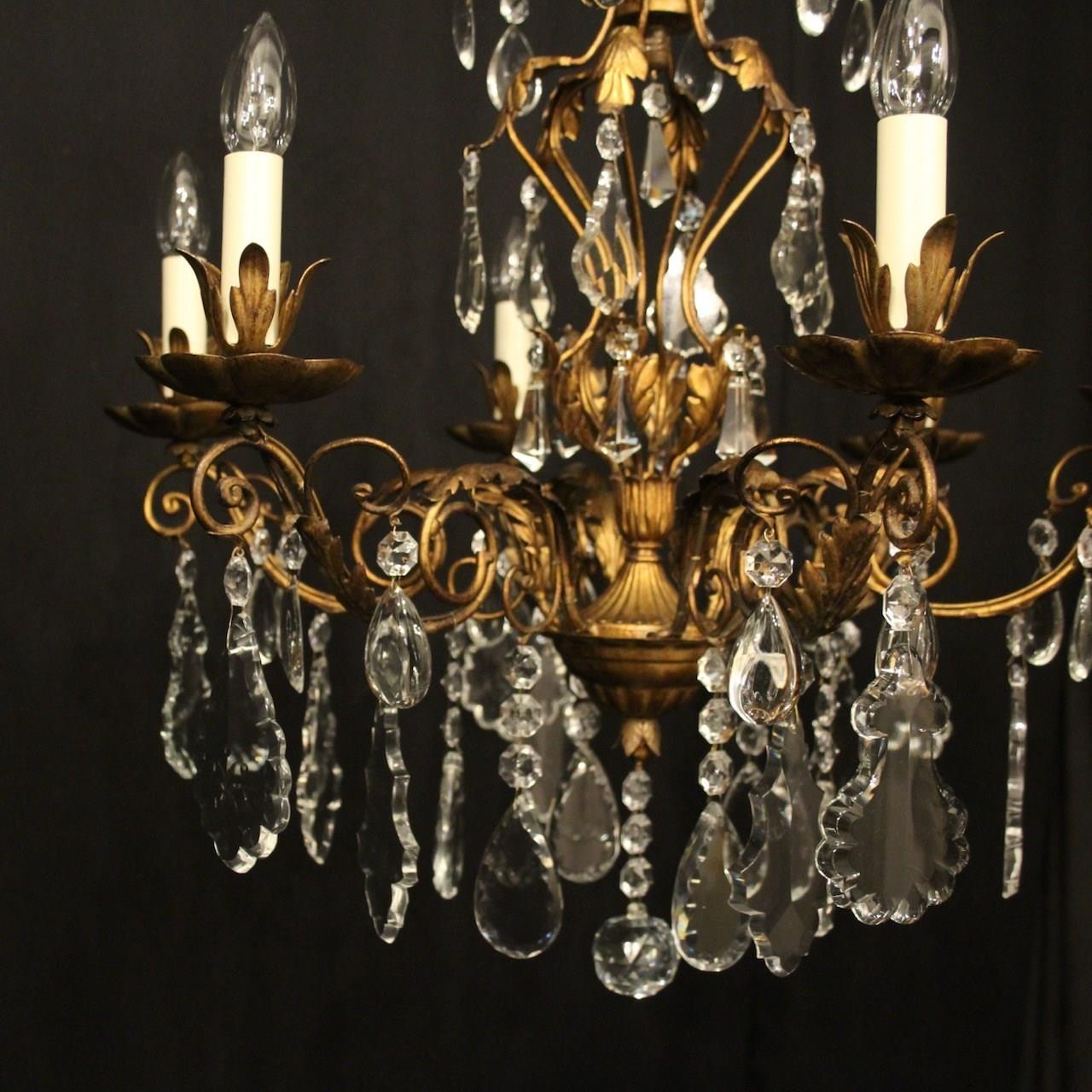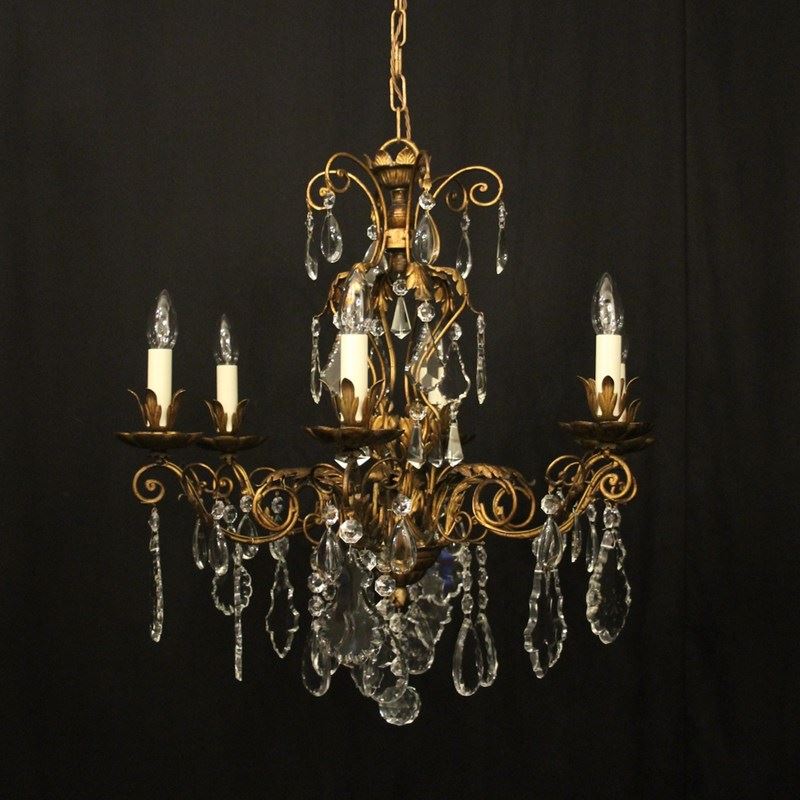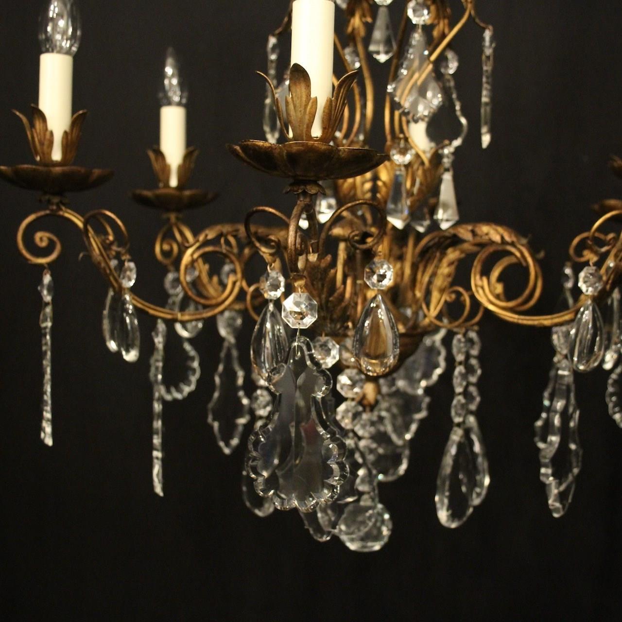 A pretty French gilded toleware 6 light chandelier, the metal leaf scrolling arms with foliated bobeche drip pans and sectional leaf candle sconces, issuing from an open cage centre with wire work canopy and decorated overall in faceted crystal pendants, having the original chain and ceiling rose, lovely patination with original colouration and good proportions. Fully rewired and PAT tested. All our chandeliers come with ceiling fixings and spare bulbs.