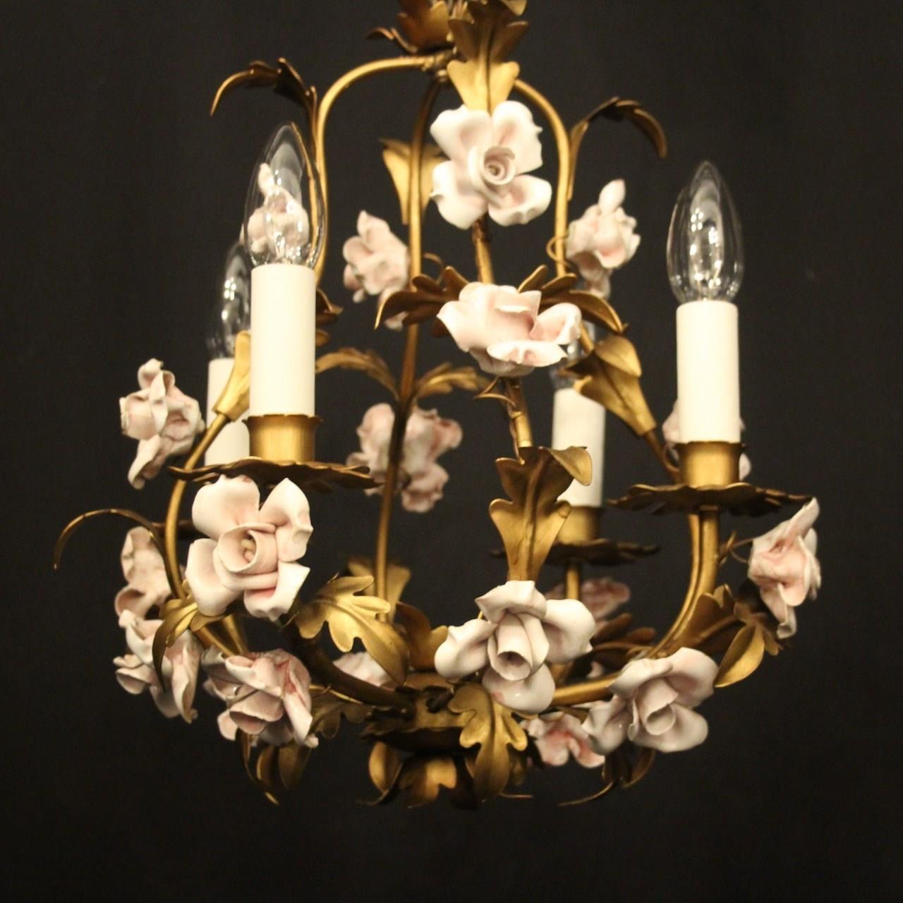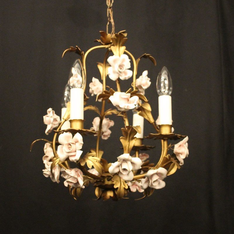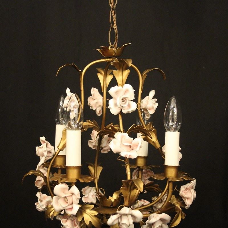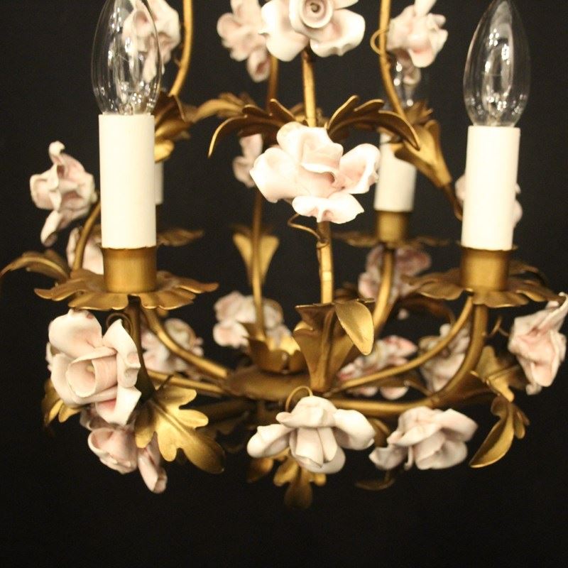 French Toleware & Porcelain 4 Light Flower Chandelier