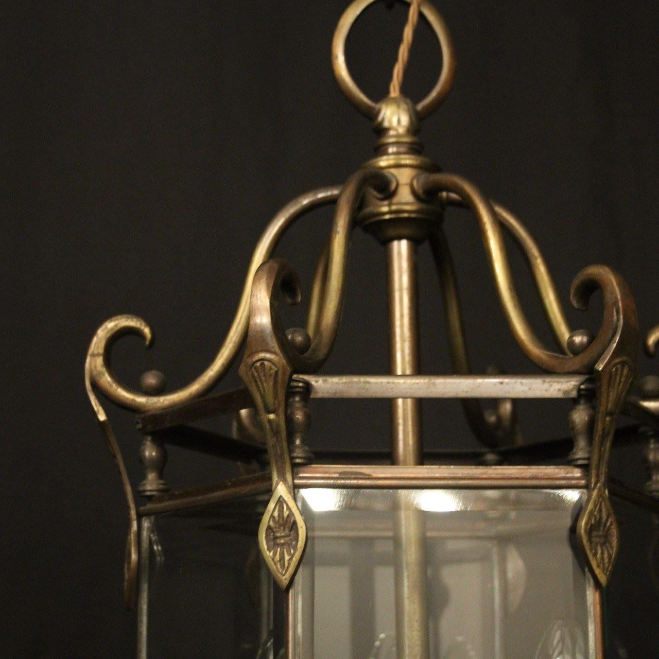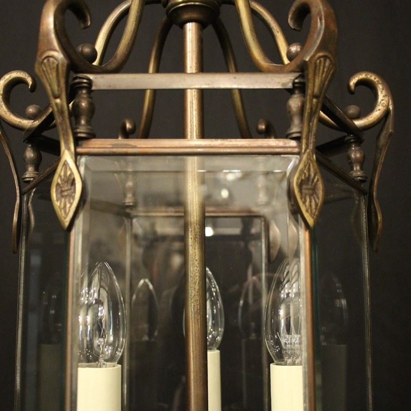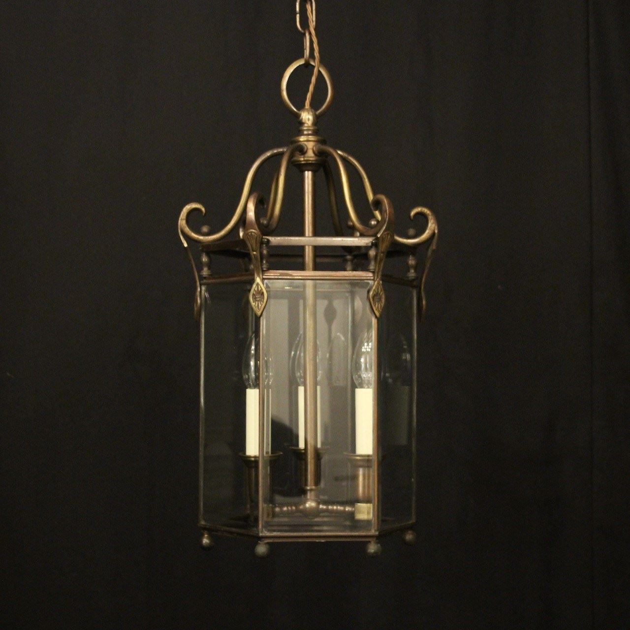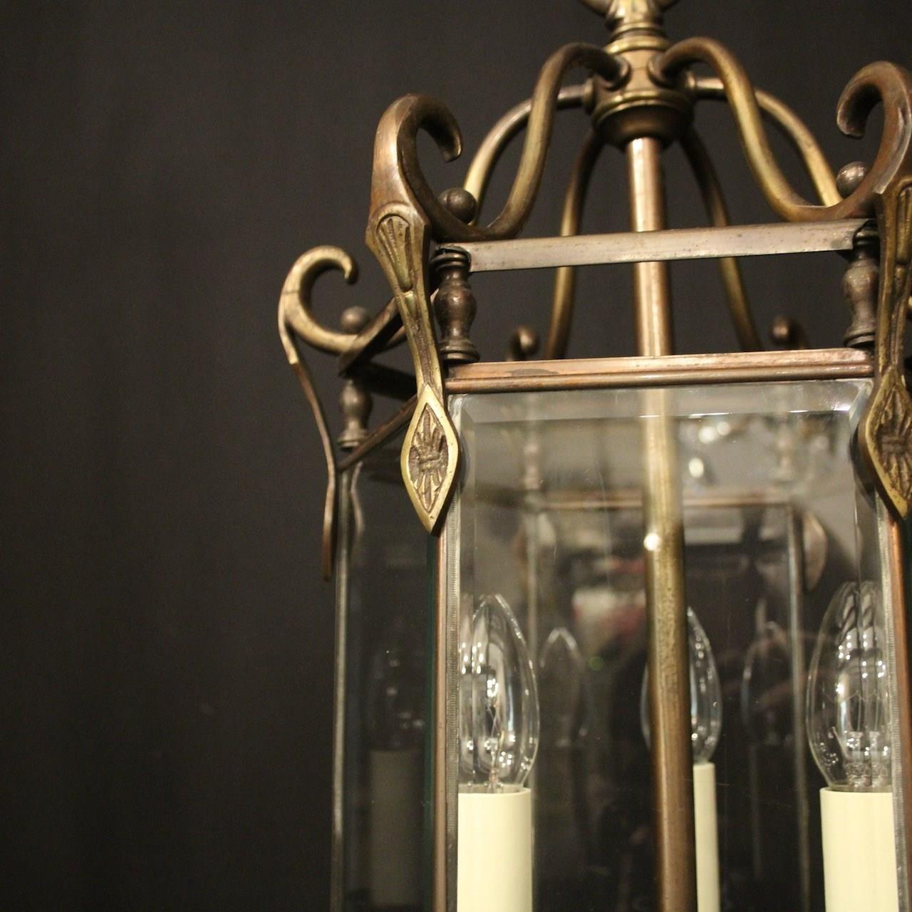 A French oxidized gilded brass triple light hexagonal antique hall lantern, the six bevelled glass panels held within a brass framework with decorative lozenge embellishments, the central column with three trumpet light fittings and scrolling canopy with decorative ball finials, having the original chain and ceiling rose. Fully rewired and PAT tested. All our lanterns come with bulbs and ceiling fixings.