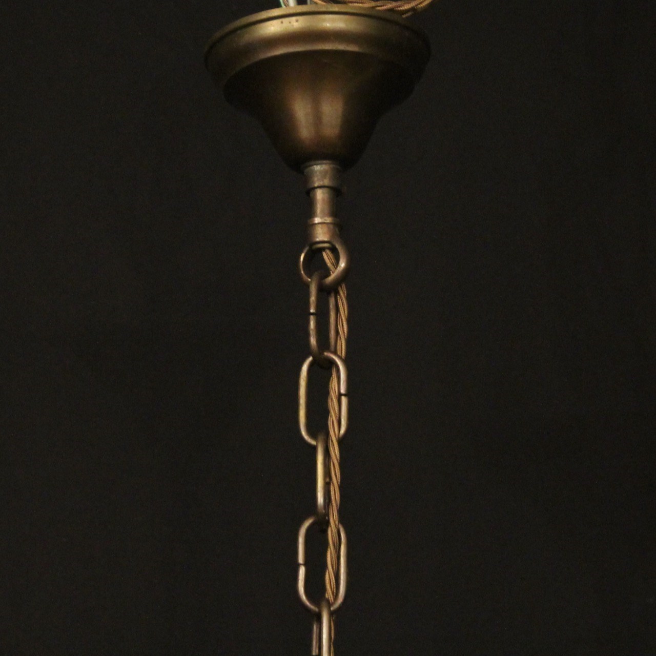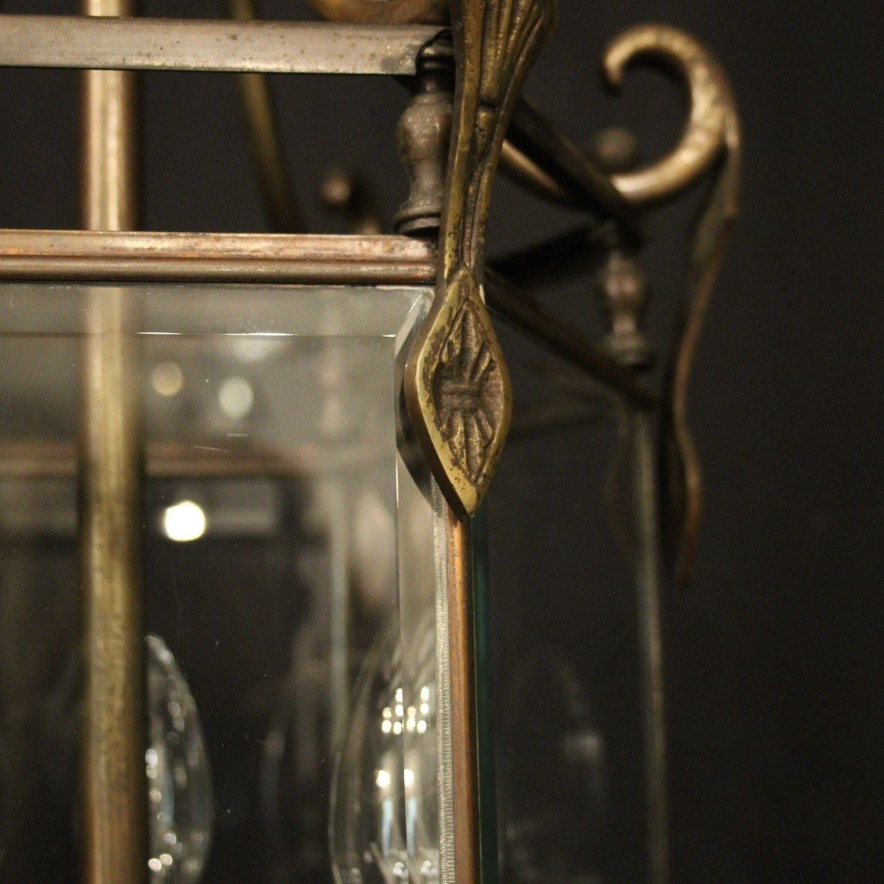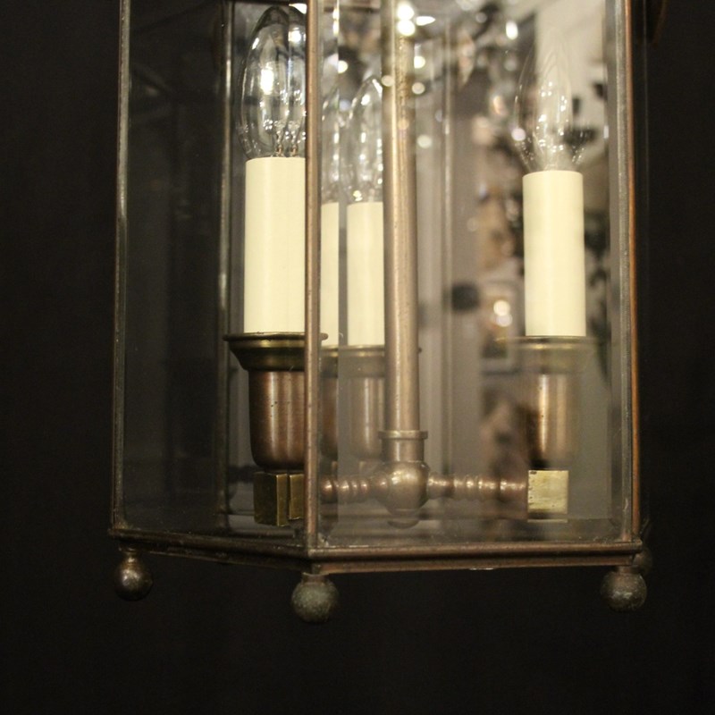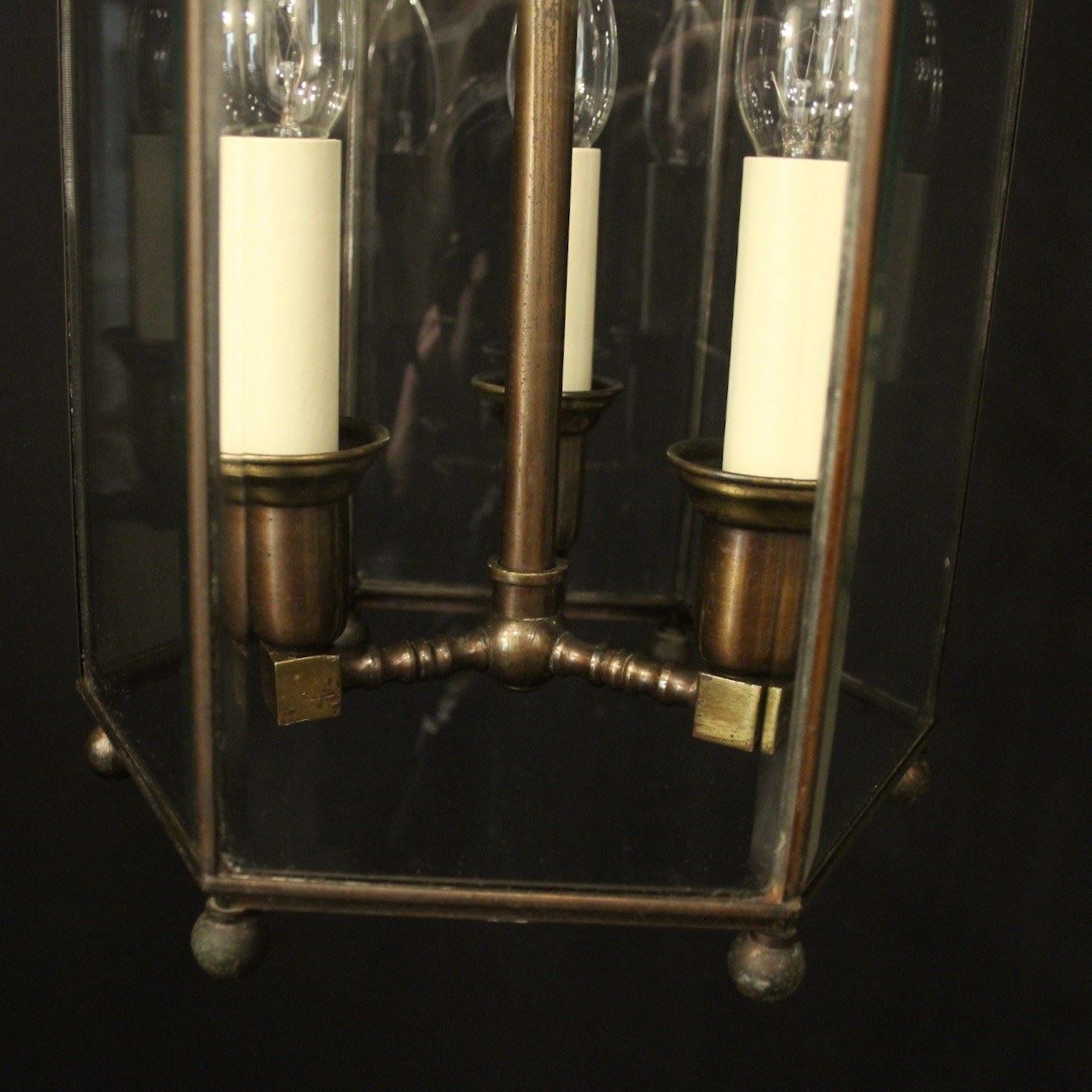 A French oxidized gilded brass triple light hexagonal antique hall lantern, the six bevelled glass panels held within a brass framework with decorative lozenge embellishments, the central column with three trumpet light fittings and scrolling canopy with decorative ball finials, having the original chain and ceiling rose. Fully rewired and PAT tested. All our lanterns come with bulbs and ceiling fixings.