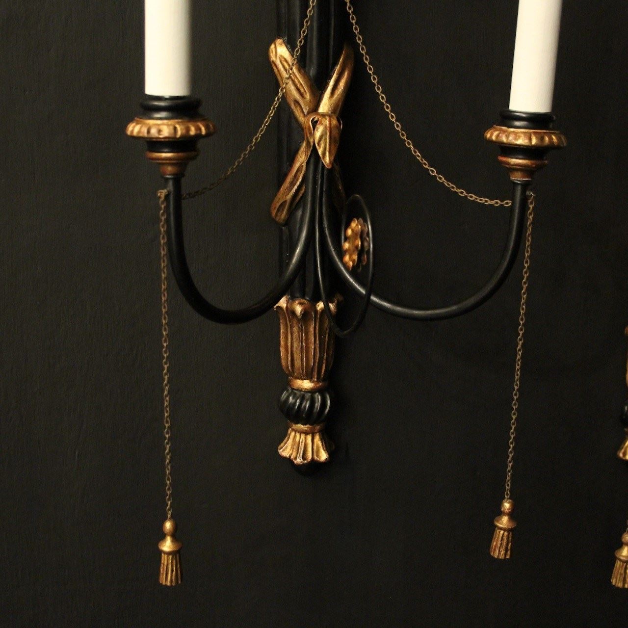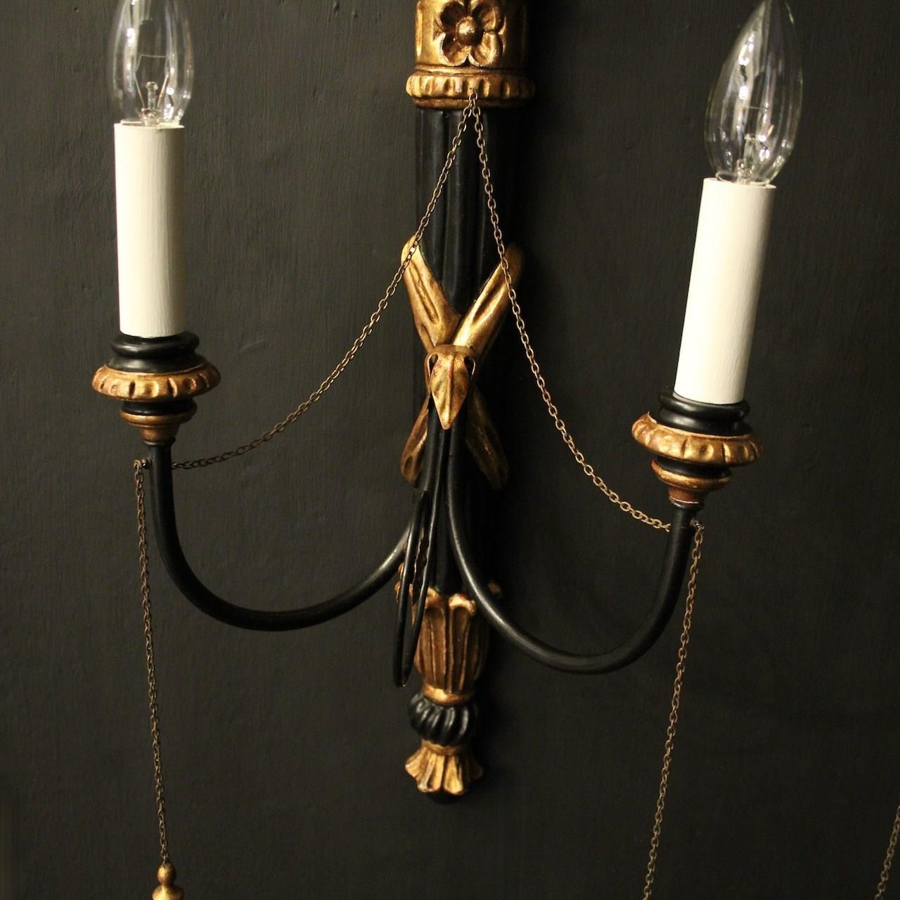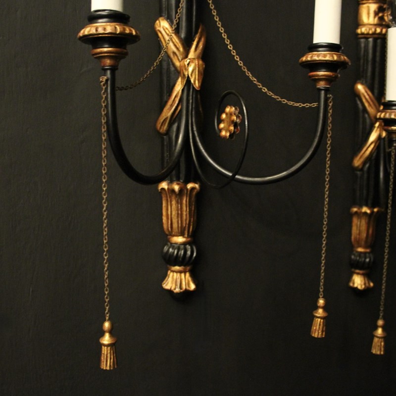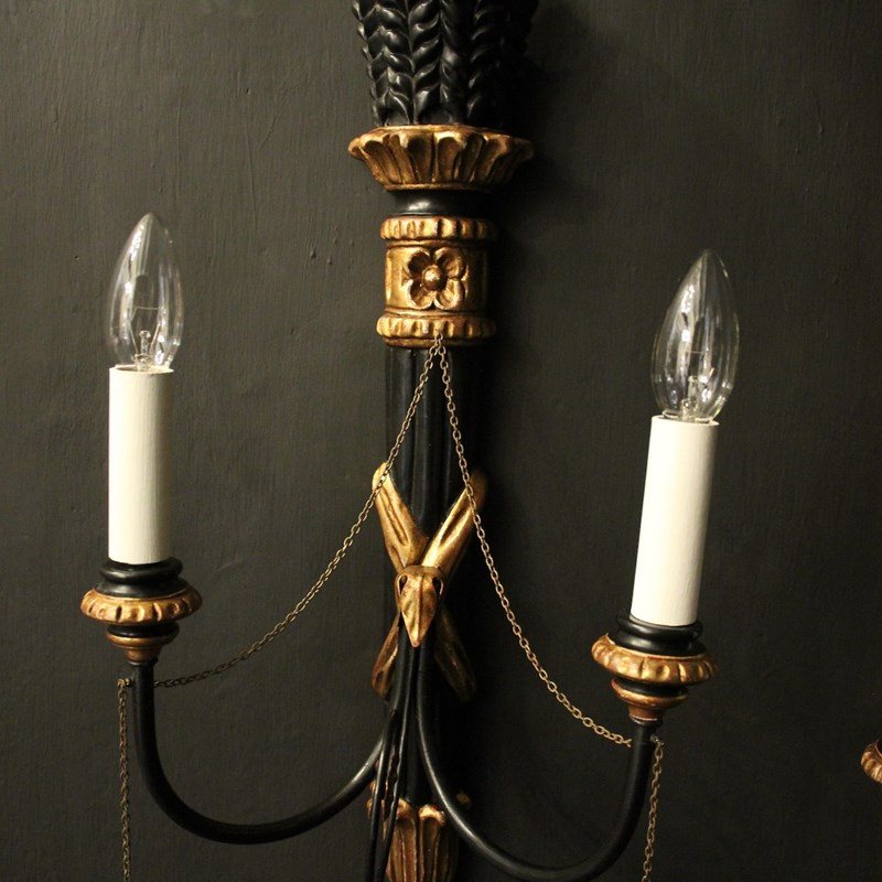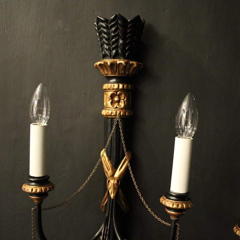 A decorative Italian ebonised, giltwood and toleware twin arm wall lights, the metal toleware scrolling arms with wooden leaf scalloped candle sconces, issuing from an ebonised reeded tapering central backplate with arrow head finial, nice original patination and well carved and gilded. Fully rewired and PAT tested. All our wall lights come with aged brass screws or brackets for fixing and spare bulbs. With matching chandeliers