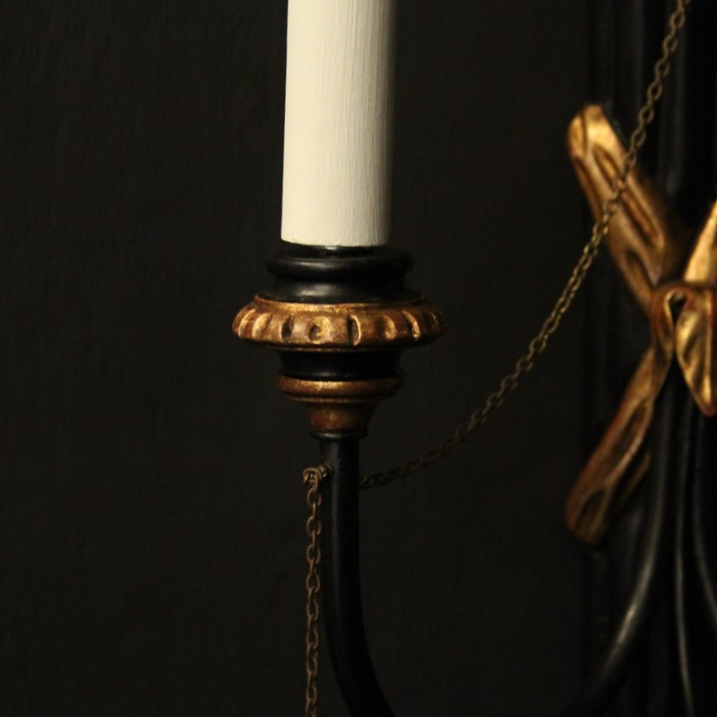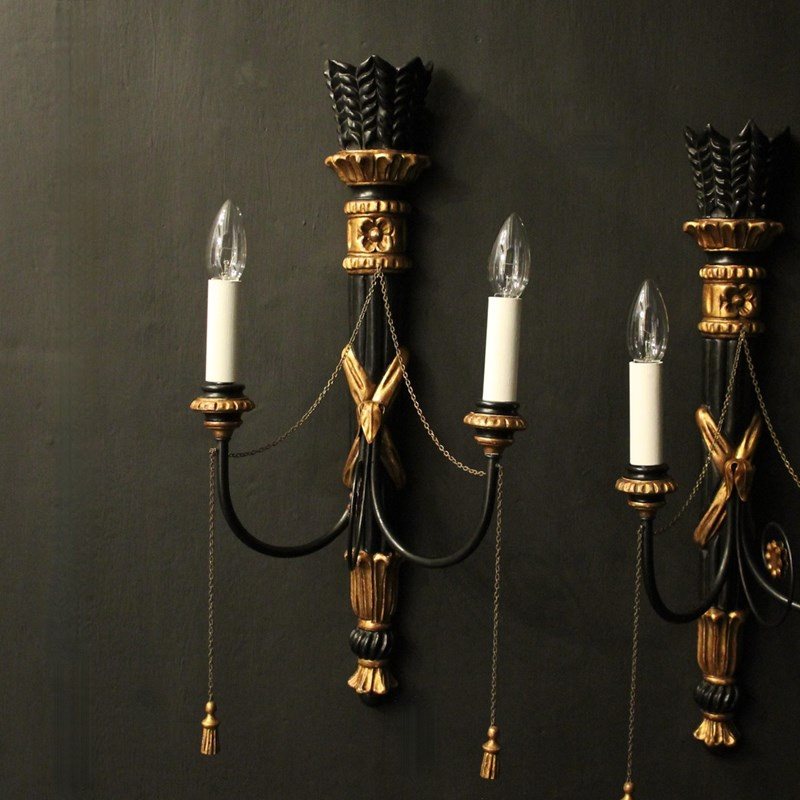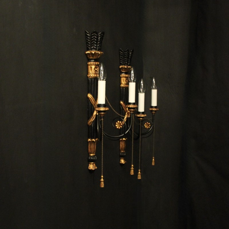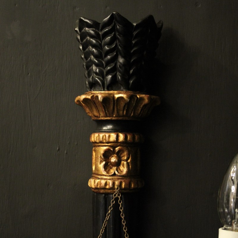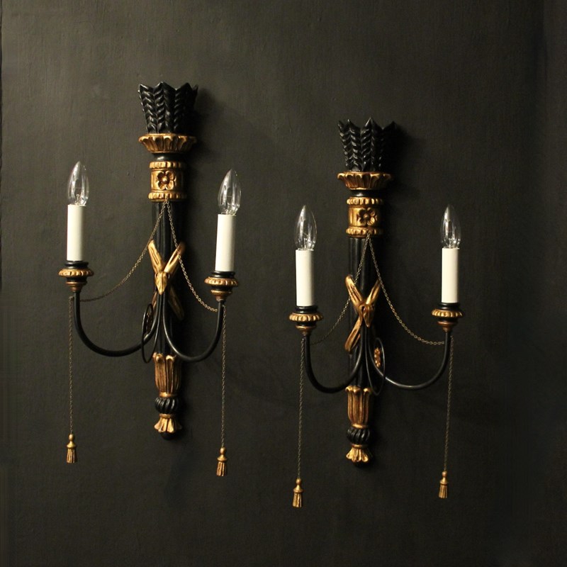 A decorative Italian ebonised, giltwood and toleware twin arm wall lights, the metal toleware scrolling arms with wooden leaf scalloped candle sconces, issuing from an ebonised reeded tapering central backplate with arrow head finial, nice original patination and well carved and gilded. Fully rewired and PAT tested. All our wall lights come with aged brass screws or brackets for fixing and spare bulbs. With matching chandeliers