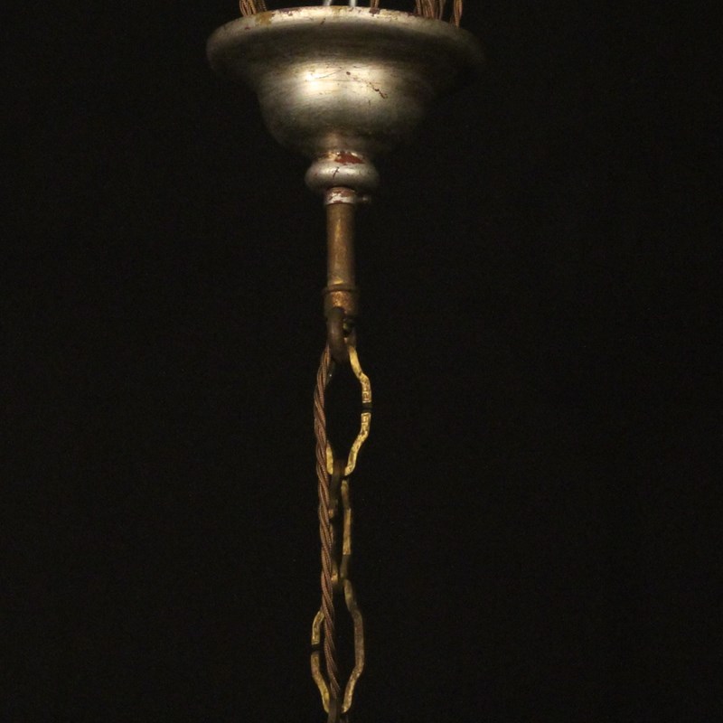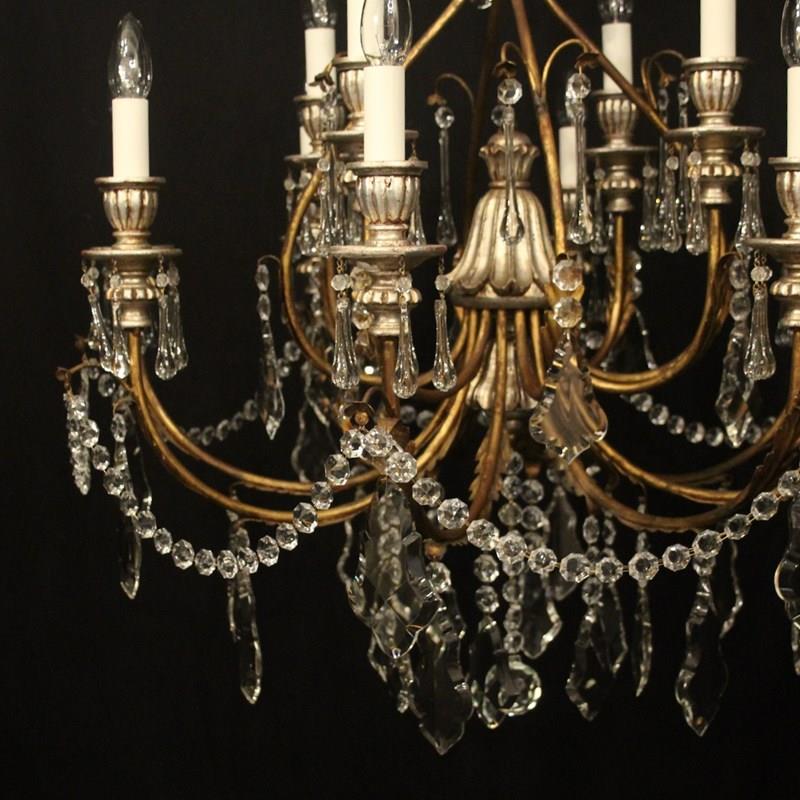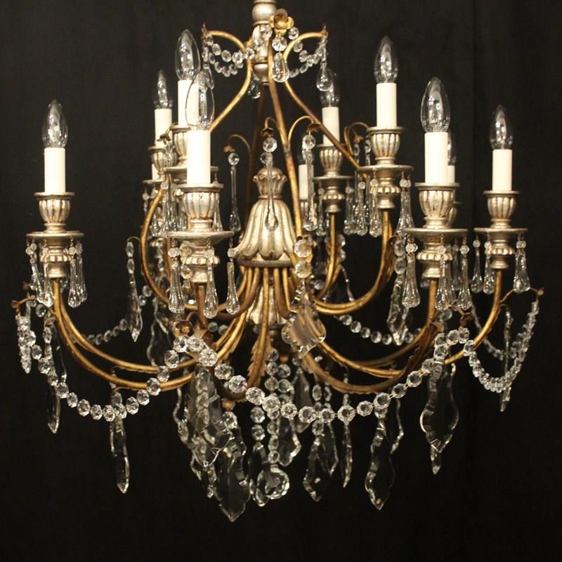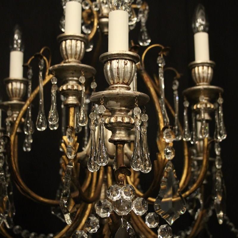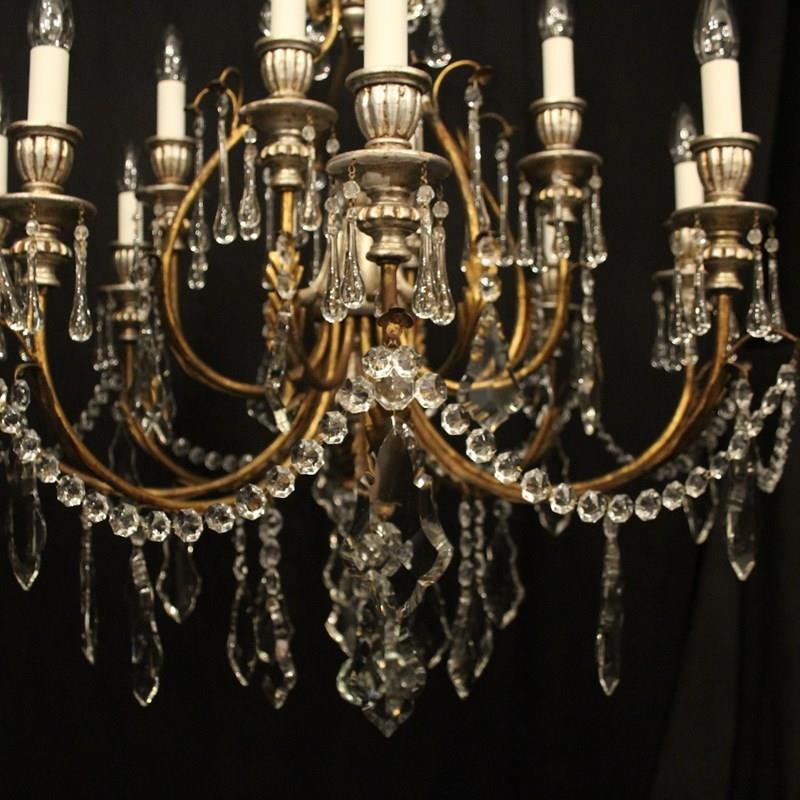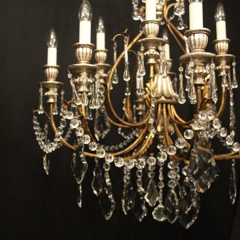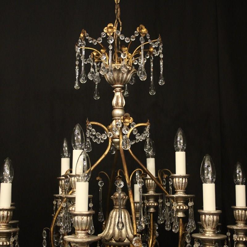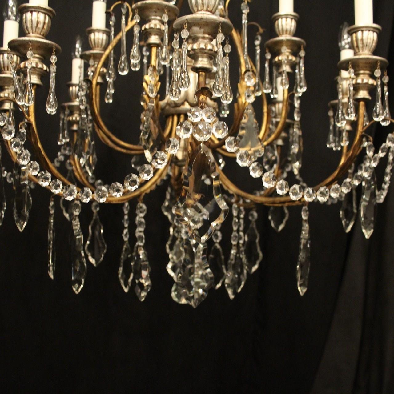 A large Italian Florentine decorative wooden silver polychrome and crystal 12 light double tiered chandelier, the gilded metal leaf Acanthus scrolling arms with wooden reeded bulbous candle sconces, issuing from an elaborate cage central column with ornate leaf decorative embellishments, decorated overall in faceted crystal pendants and having the original chain and ceiling rose, nice original silvered coloration and great large scale. Fully rewired and PAT tested. All our chandeliers come with ceiling fixings and spare bulbs.