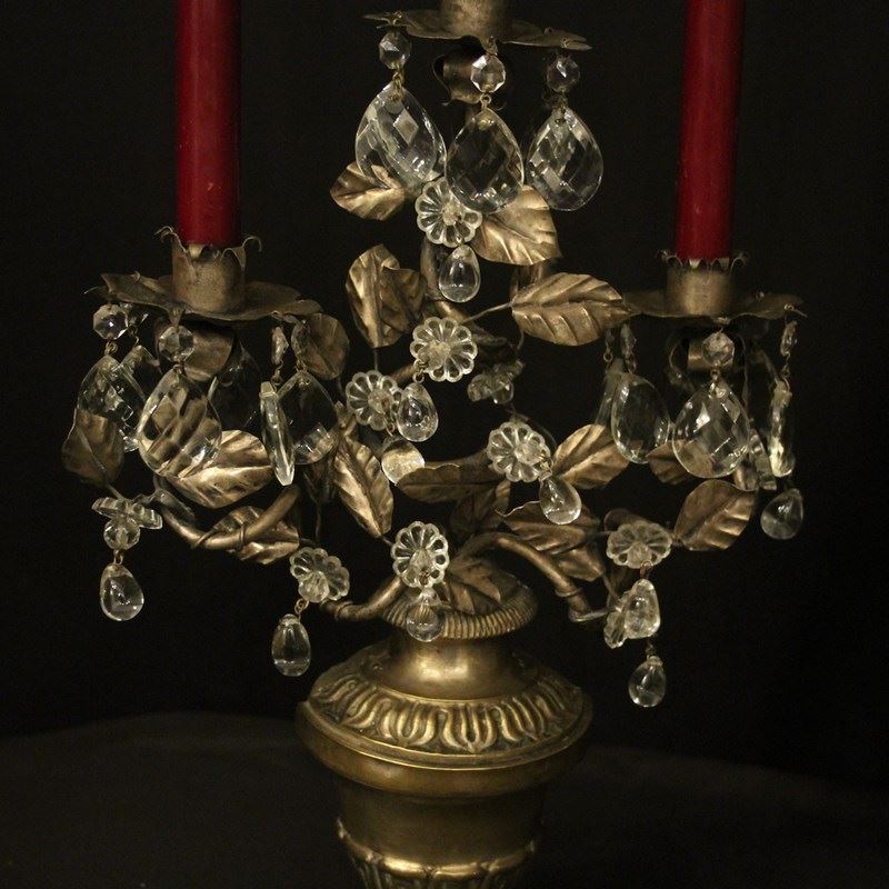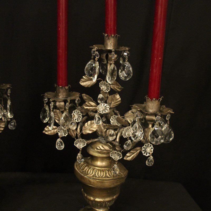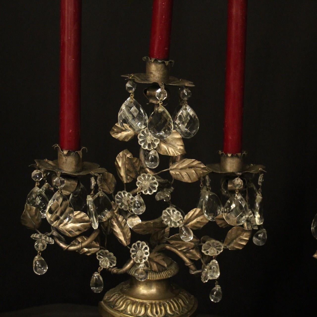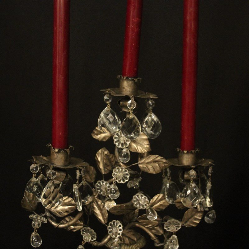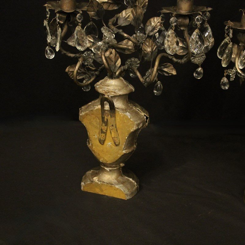 An Italian Genoa silvered and cut glass triple light antique candelabra, the three silvered leaf scrolling arms with leaf bobeche drip pans and candle sconces, issuing from a repousse silver and giltwood column with reeded base, decorated overall with faceted cut glass pendants, nice original patination. They can also sit of the wall as wall lights. For candle use only.