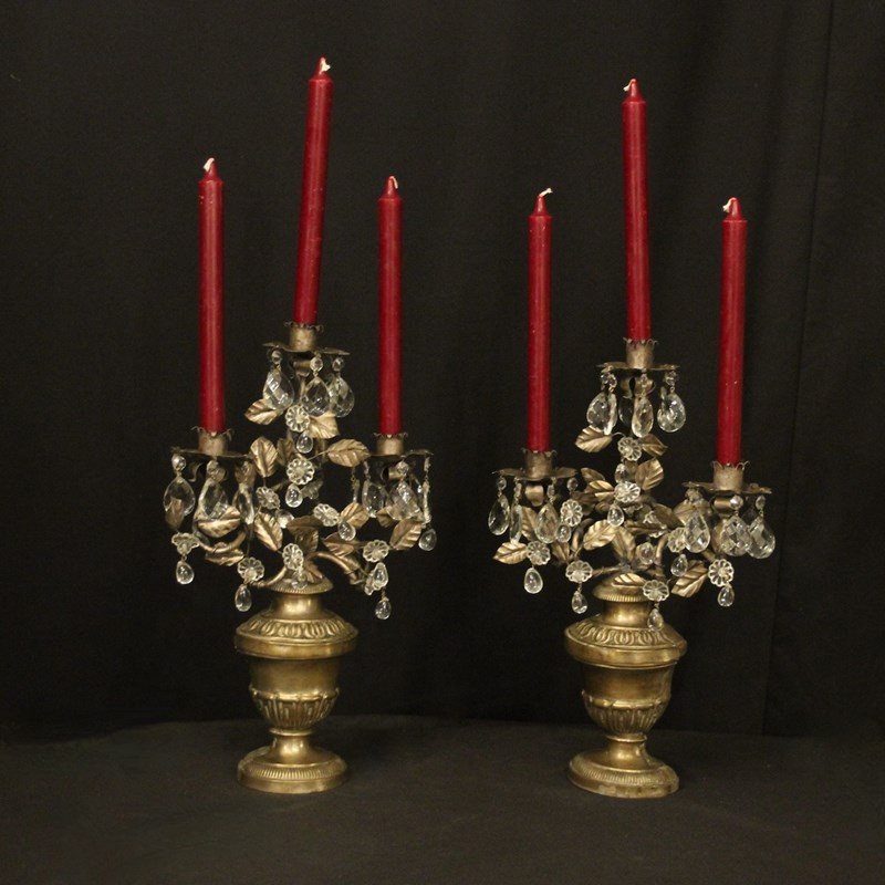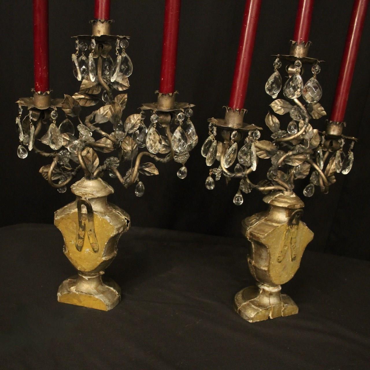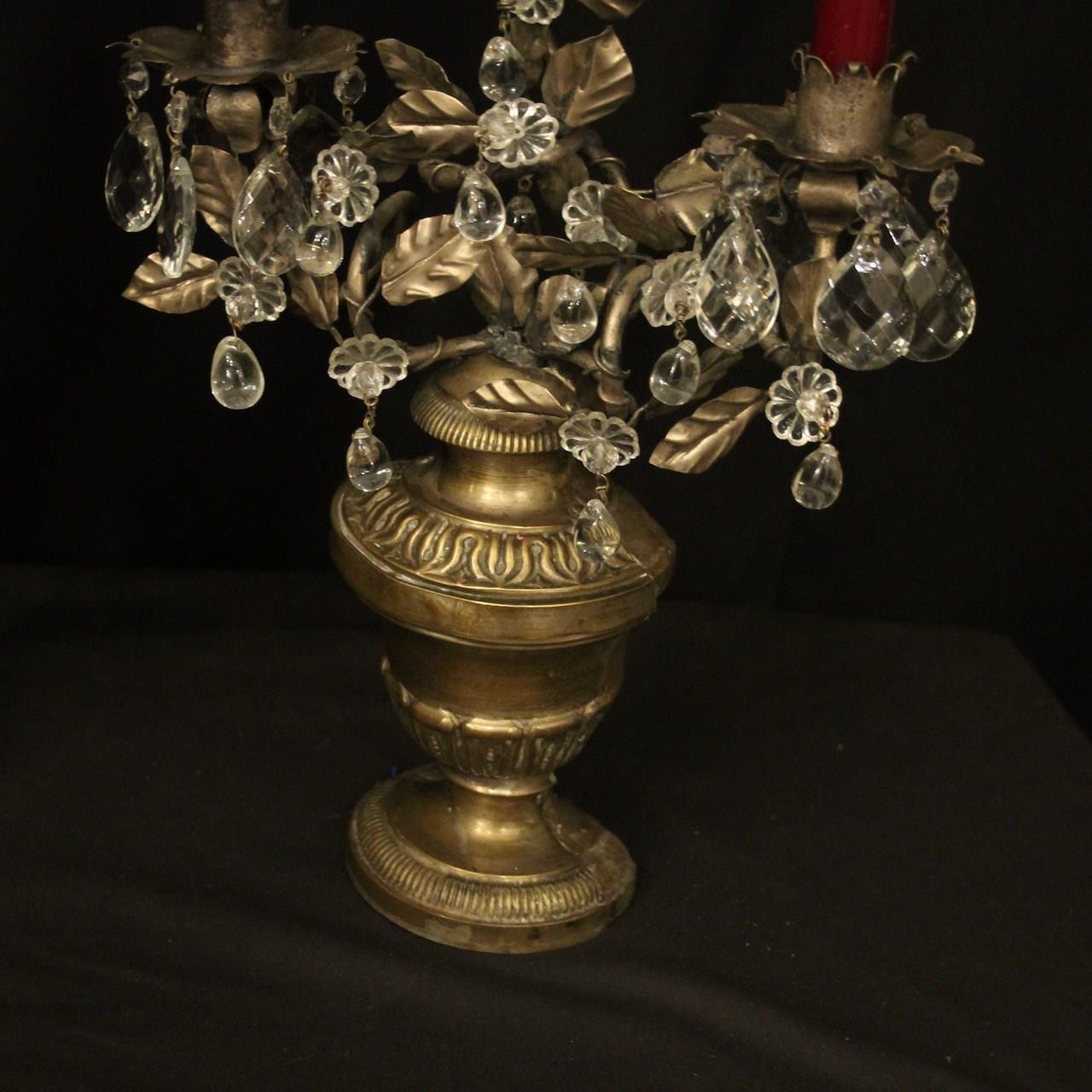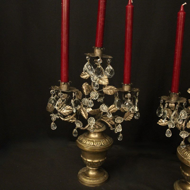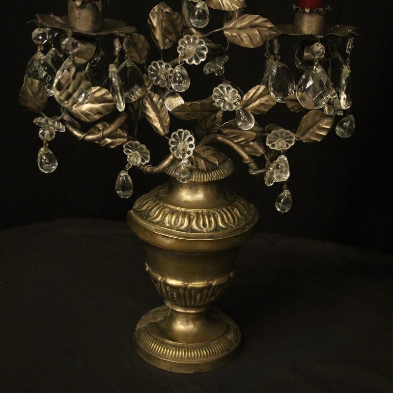 An Italian Genoa silvered and cut glass triple light antique candelabra, the three silvered leaf scrolling arms with leaf bobeche drip pans and candle sconces, issuing from a repousse silver and giltwood column with reeded base, decorated overall with faceted cut glass pendants, nice original patination. They can also sit of the wall as wall lights. For candle use only.