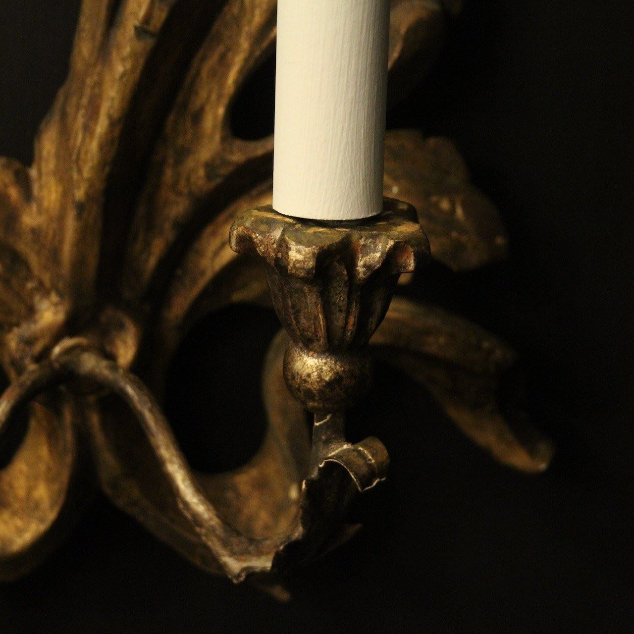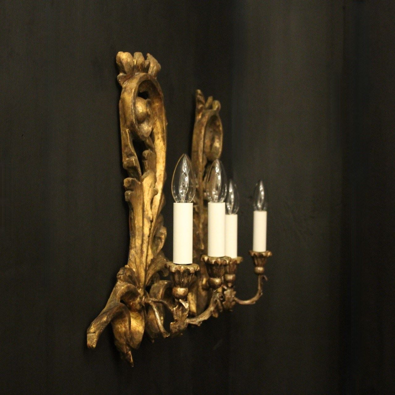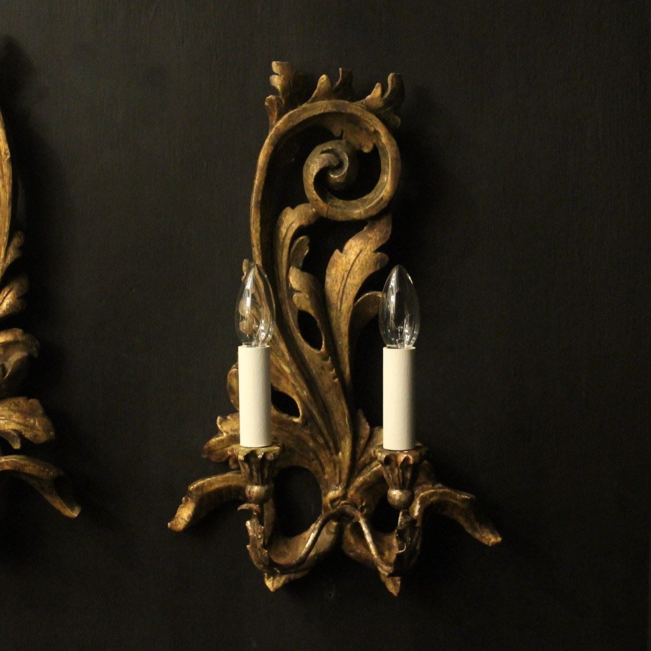 A decorative Italian pair of Florentine carved giltwood and Toleware opposing twin arm antique wall lights, the toleware scrolling arms with wooden bulbous leaf candle sconces, issuing from an ornate pierced Acanthus leaf wooden opposing backplate, very decorative with nice faded patination. Fully rewired and PAT tested. All our wall lights come with aged brass screws for fixing and spare bulbs.