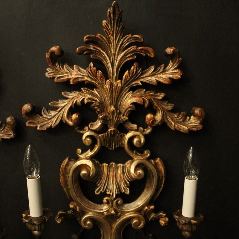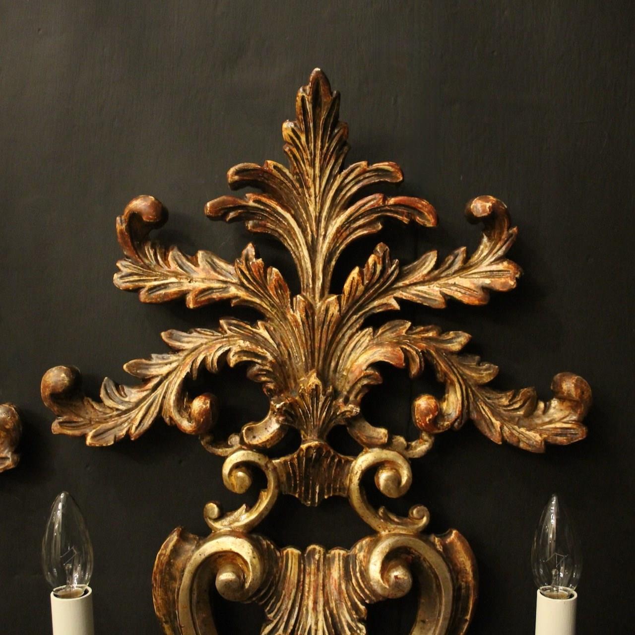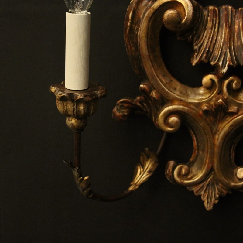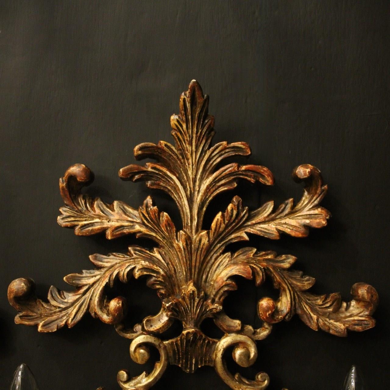 An ornate Italian Florentine carved giltwood and Toleware twin arm antique wall lights, the toleware leaf scrolling arms with wooden leaf candle sconces, issuing from a large Acanthus leaf giltwood foliated backplate, nice original patination and great large scale. Fully rewired and PAT tested. All our wall lights come with aged brass screws or brackets for fixing and spare bulbs.
