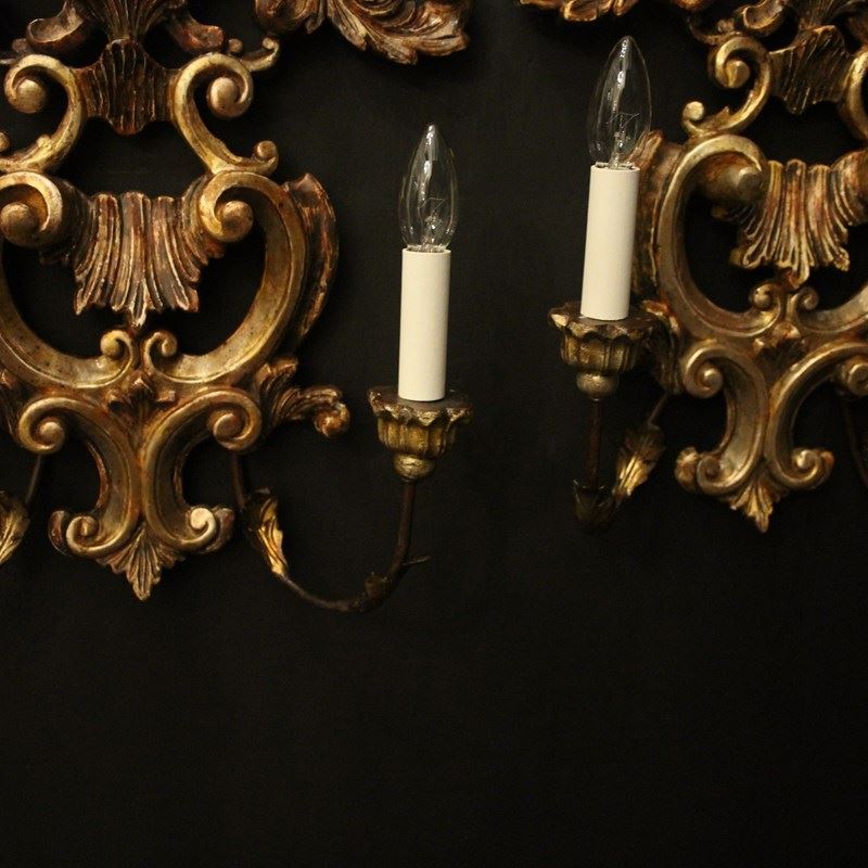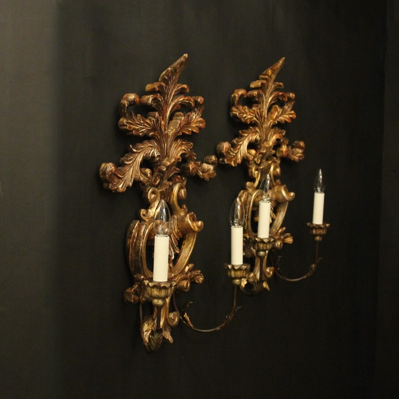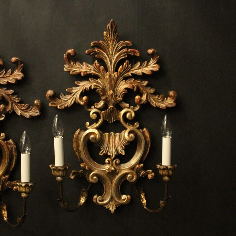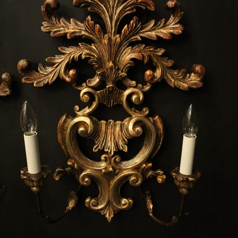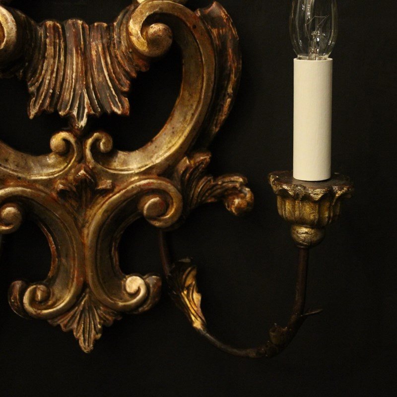 An ornate Italian Florentine carved giltwood and Toleware twin arm antique wall lights, the toleware leaf scrolling arms with wooden leaf candle sconces, issuing from a large Acanthus leaf giltwood foliated backplate, nice original patination and great large scale. Fully rewired and PAT tested. All our wall lights come with aged brass screws or brackets for fixing and spare bulbs.