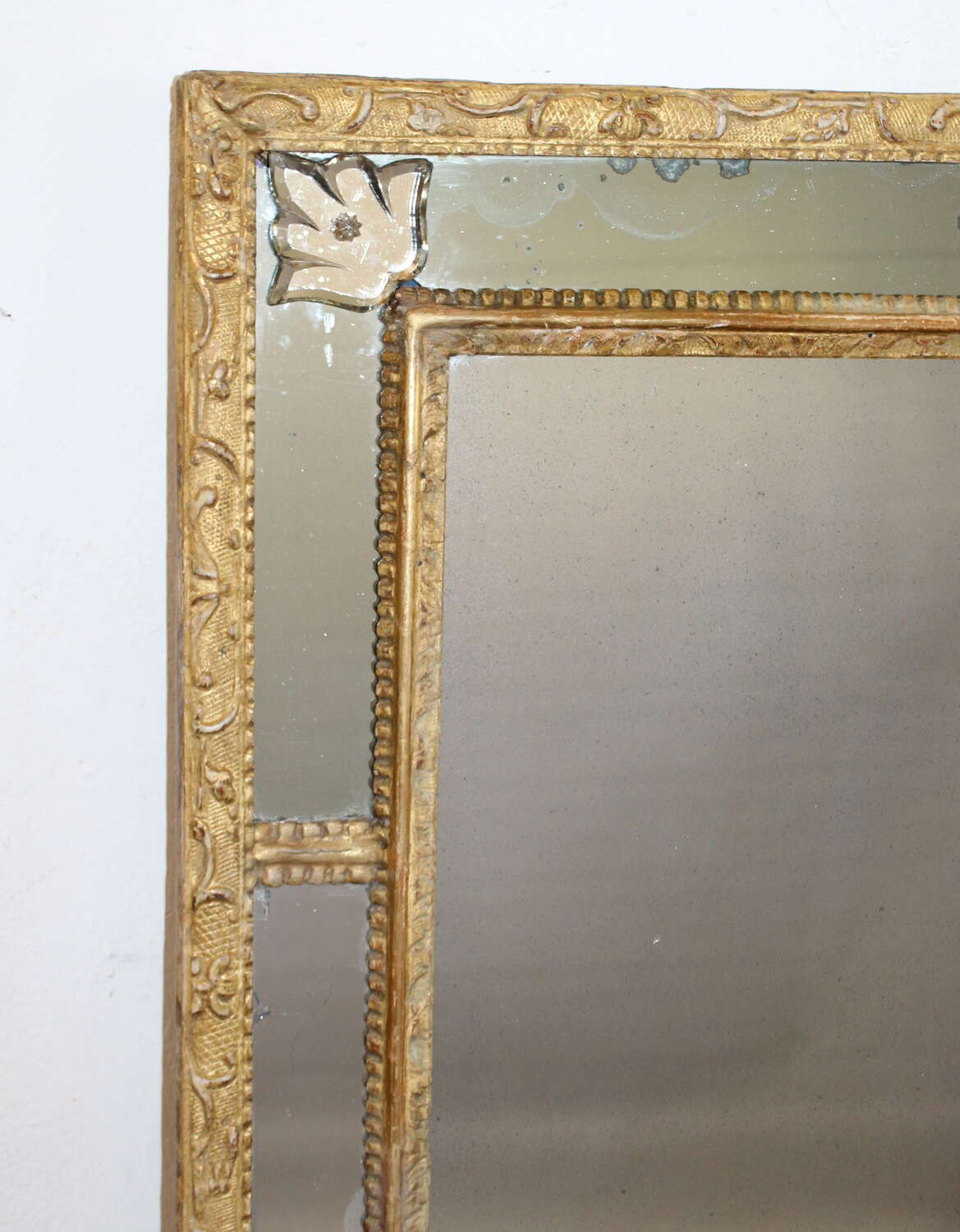 Late 18th century French margin mirror with narrow, carved and gilded "baguette de berain" wooden outer frame with a delicate cross-hatched design decorated with curling stems, little flowers and leaves. The inner frame has a carved row of beading and fanned leaves either side of a raised band and the two frames are linked with a double row of beading between the frames and a glass leaf at each corner. There is age in the original mercury glass sections and in the central mercury glass mirror plate but the mirror still gives a good reflection and can be hung portrait or landscape.