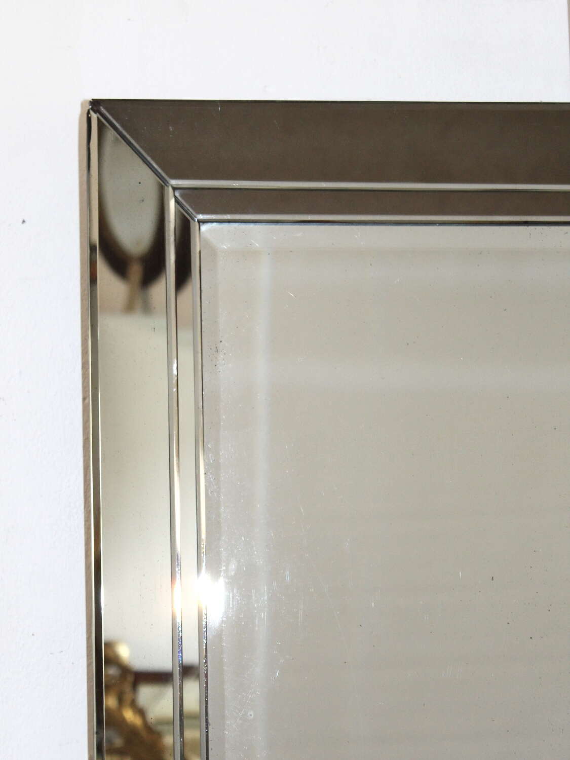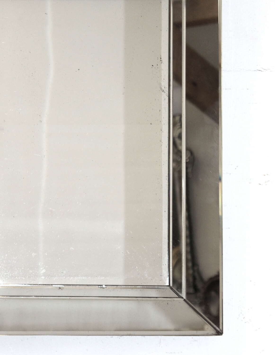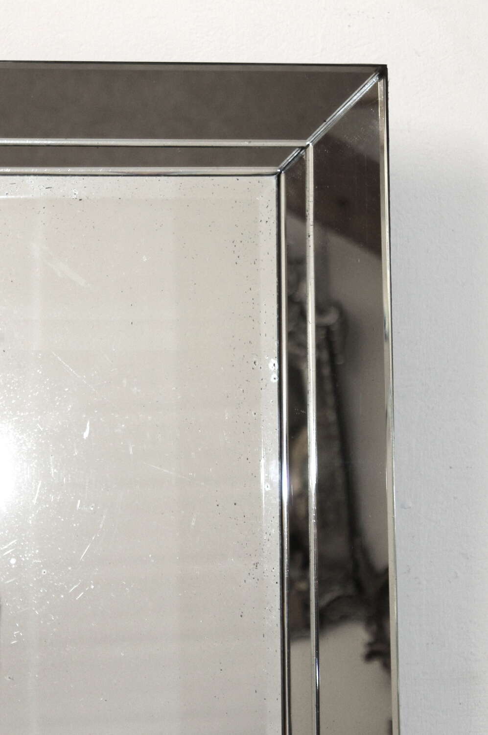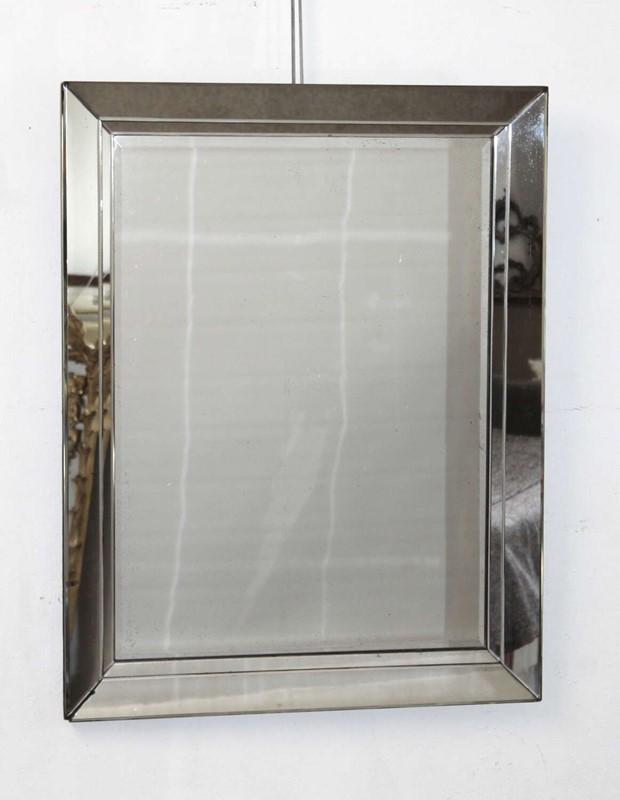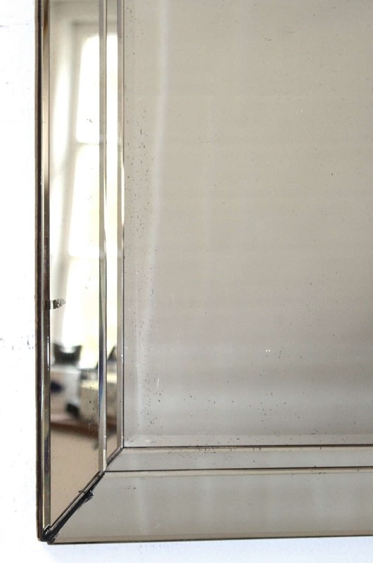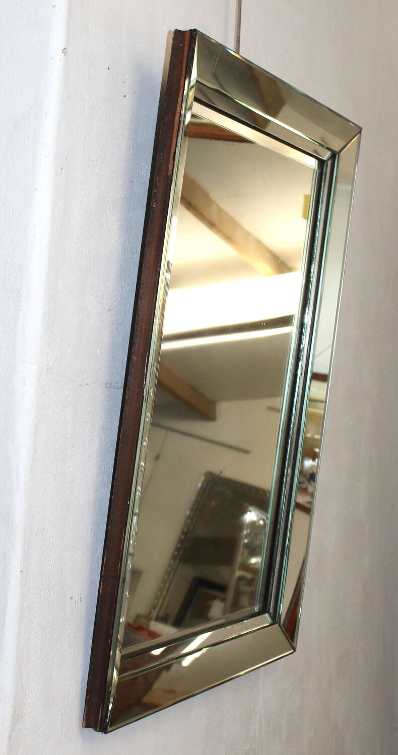 1940s Belgian mirror with angled, layered glass frame and central bevelled glass. Despite there being some age in the glass in the form of dots and freckles, this mirror gives a very good reflection and is a mirror that has not photographed well but, in fact, looks smart and stylish when you see it!