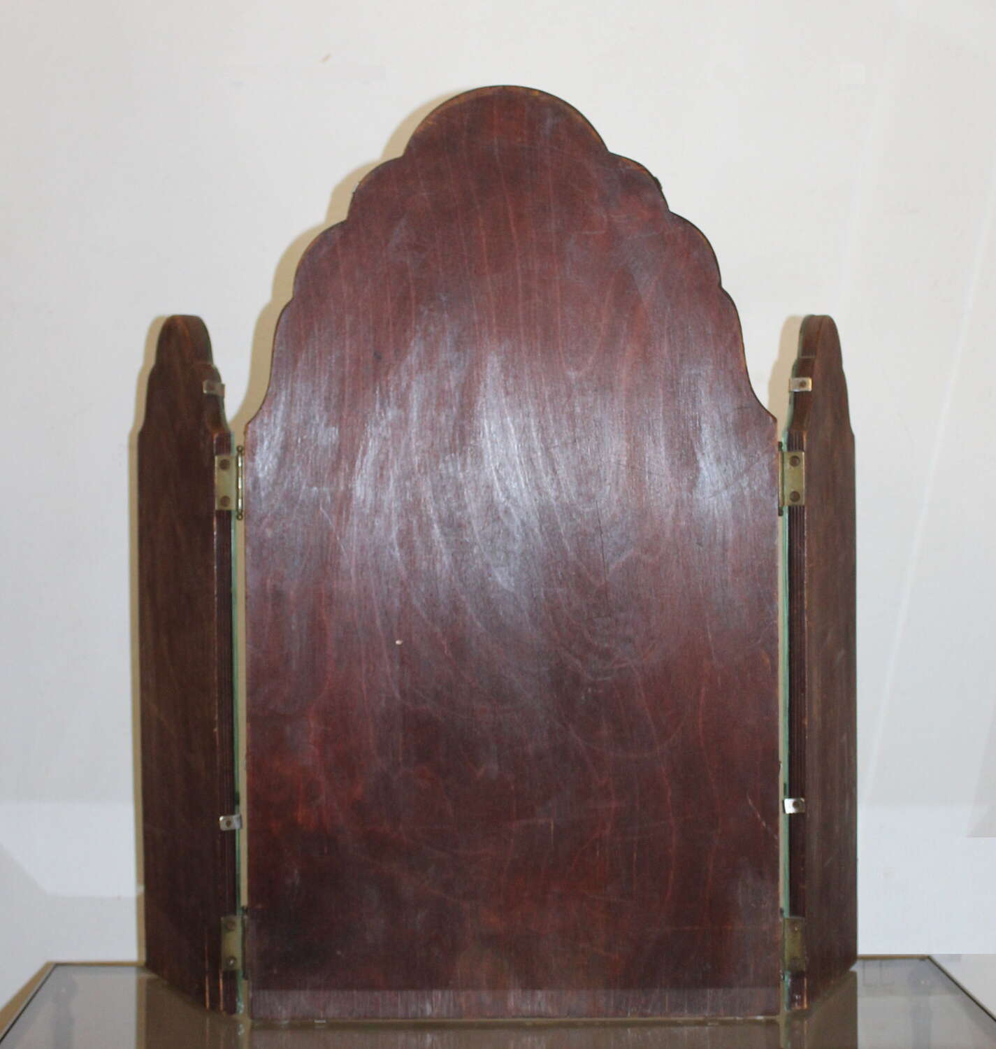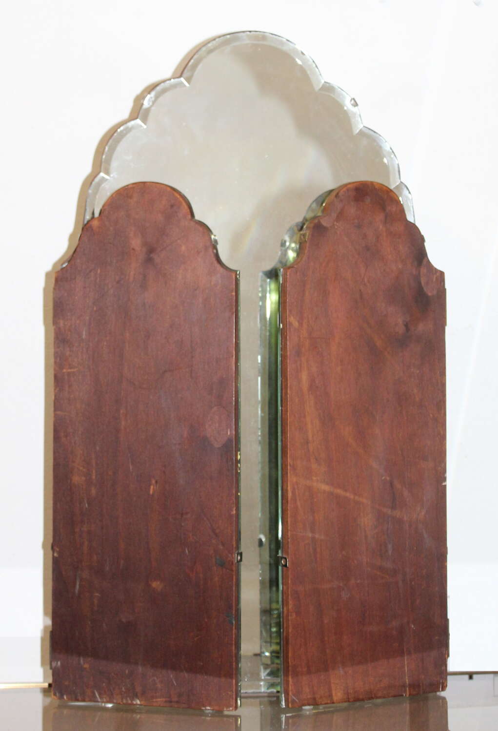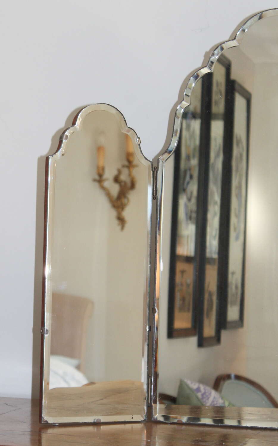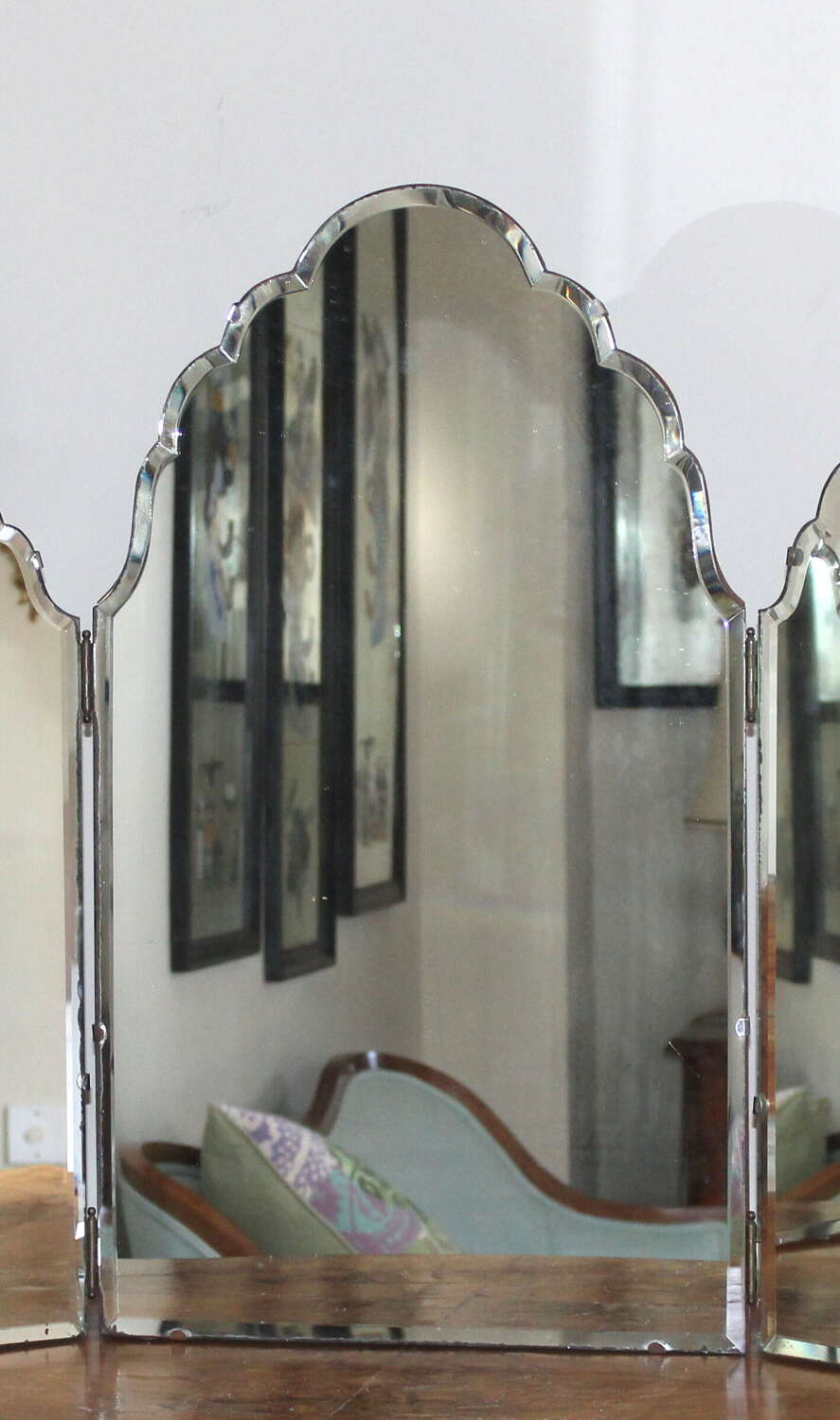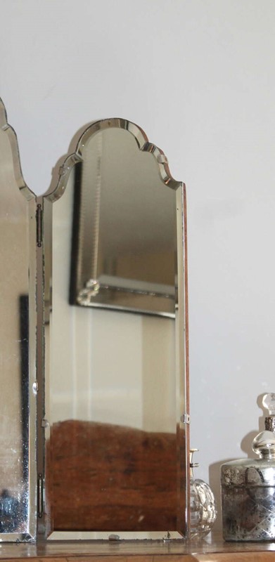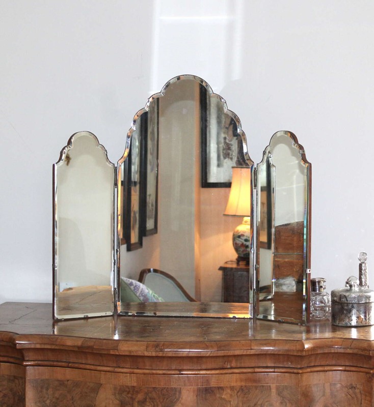 Very attractive, tall, 1940s, triple-glass dressing-table mirror with seven curves to the central mirror and three on each of the two side mirrors. The bevelled edge, which goes all the way around each section, catches the light and enhances the shape. The glass is held on to a simple wooden back with silver metal clips and there are little clear pads under the base of the mirror to protect the surface it will be resting on. There is a little age and very slight wear around the outer edges of the three mirrors but they all give an excellent reflection. Folded, this mirror measures 39cm wide, fully extended 76cm across and we have photographed it with the sides angled to give a width of about 65cm.
