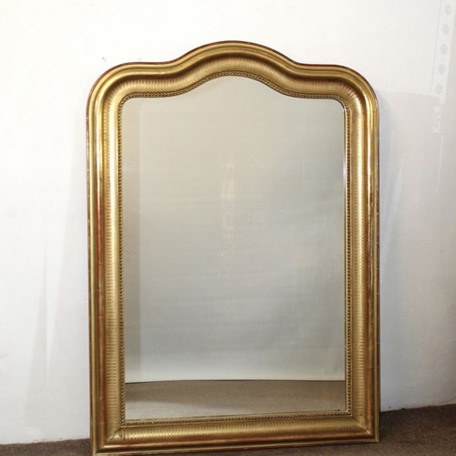 Antique French archtop mirror, circa 1880, with gently outcurving, beautifully etched, gilt frame decorated with a geometric design enclosing waterlilly (or lotus) flowers and beaded sight edge. The high cartouche has a central shell with open curling leaves and flowers each side and the gilders used some different colours of gold leaf to denote the different elements of the cartouche. The original glass has some age, mostly in the form of freckling, but still gives a very good reflection.