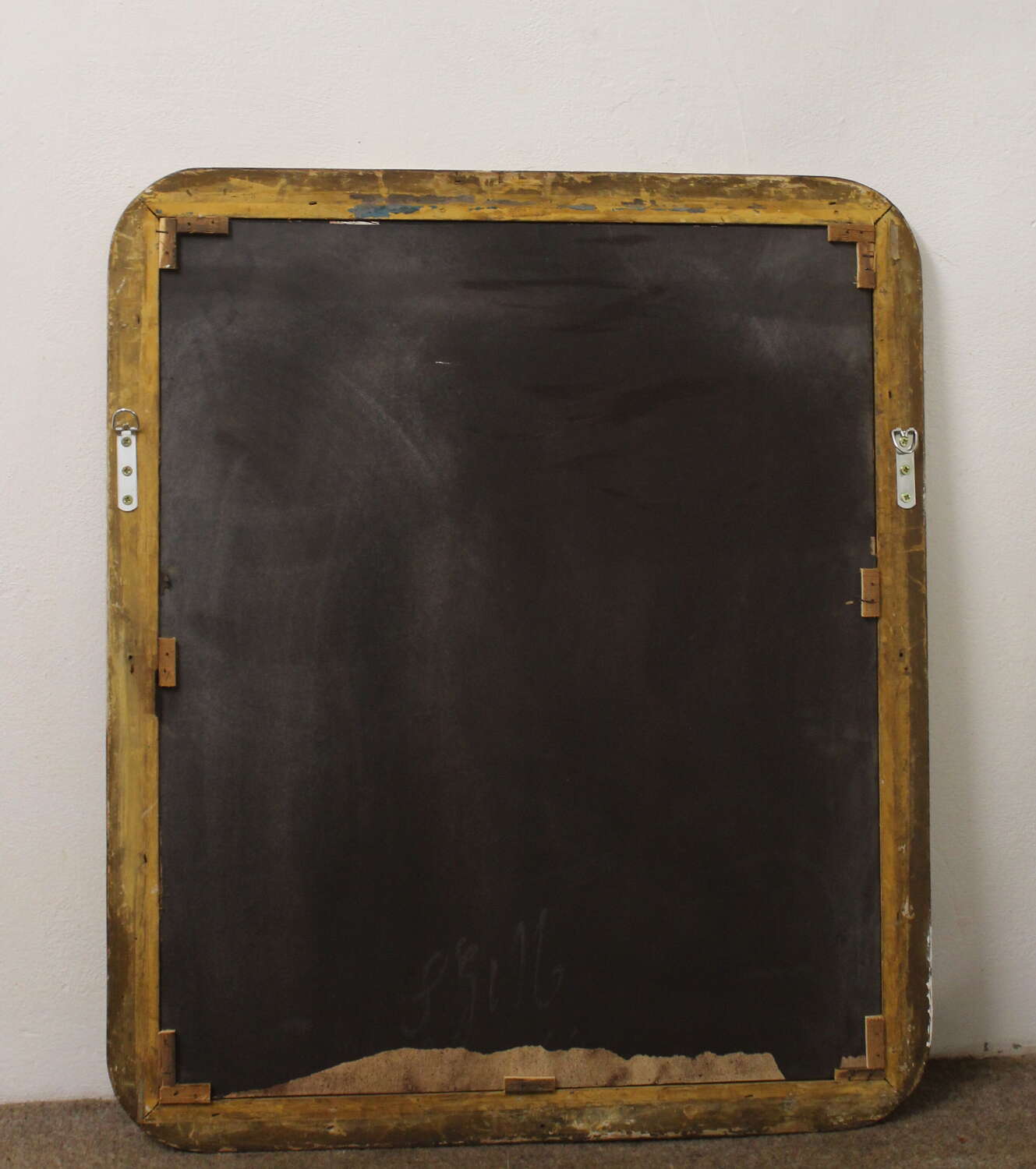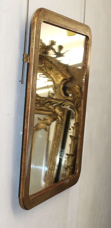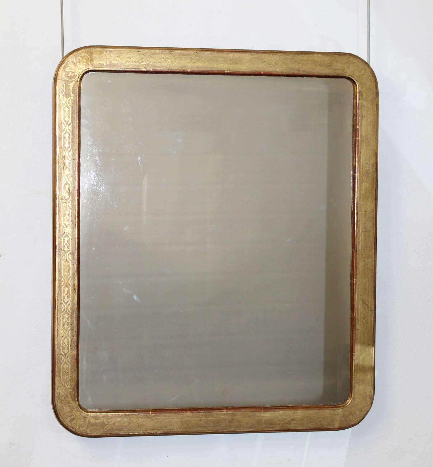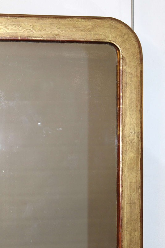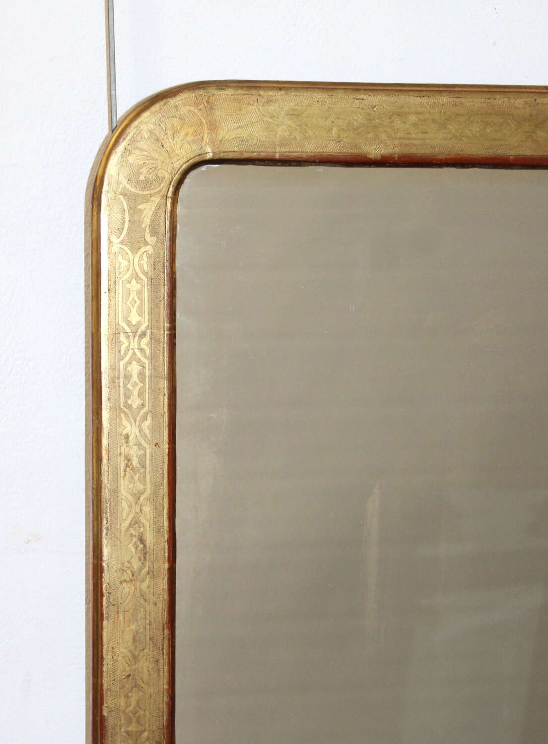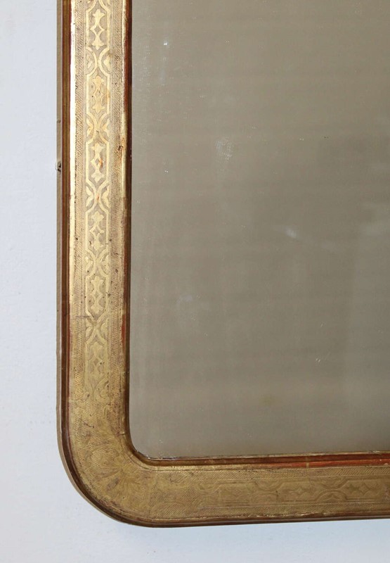 Unusual antique French mirror, circa 1880, with four curved corners. The beautifully etched gilt frame has a partly geometric, partly foliate design which changes into a fanned leaf at each corner. Where the mirror has been dusted for more than 150 years, the gilding has thinned on the outer and inner edges, giving a narrow terracotta border on each side of the gold etching. Photographed on a rare, sunny, day the etching is the same colour all the way around the frame and just as visible on all four sides. The mirror plate from the same period has only a hint of age and gives an excellent reflection. This mirror can be hung landscape as well as portrait (as photographed).