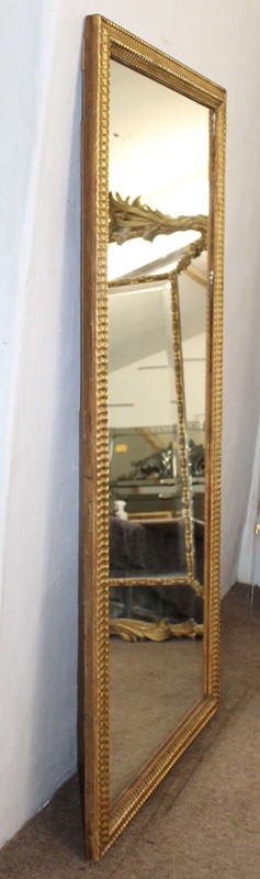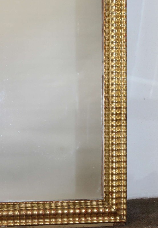Antique French mirror, circa 1890, with narrow, burnished gilt frame which has a partly rippled, partly woven design. Although the frame appears to be very bright gold, there is still hints of the terracotta bole showing through the gilding, where the mirror has been cleaned for more than a century. The mirror plate is in very good condition and this mirror would have once formed part of the decorative panelling in an important French house.