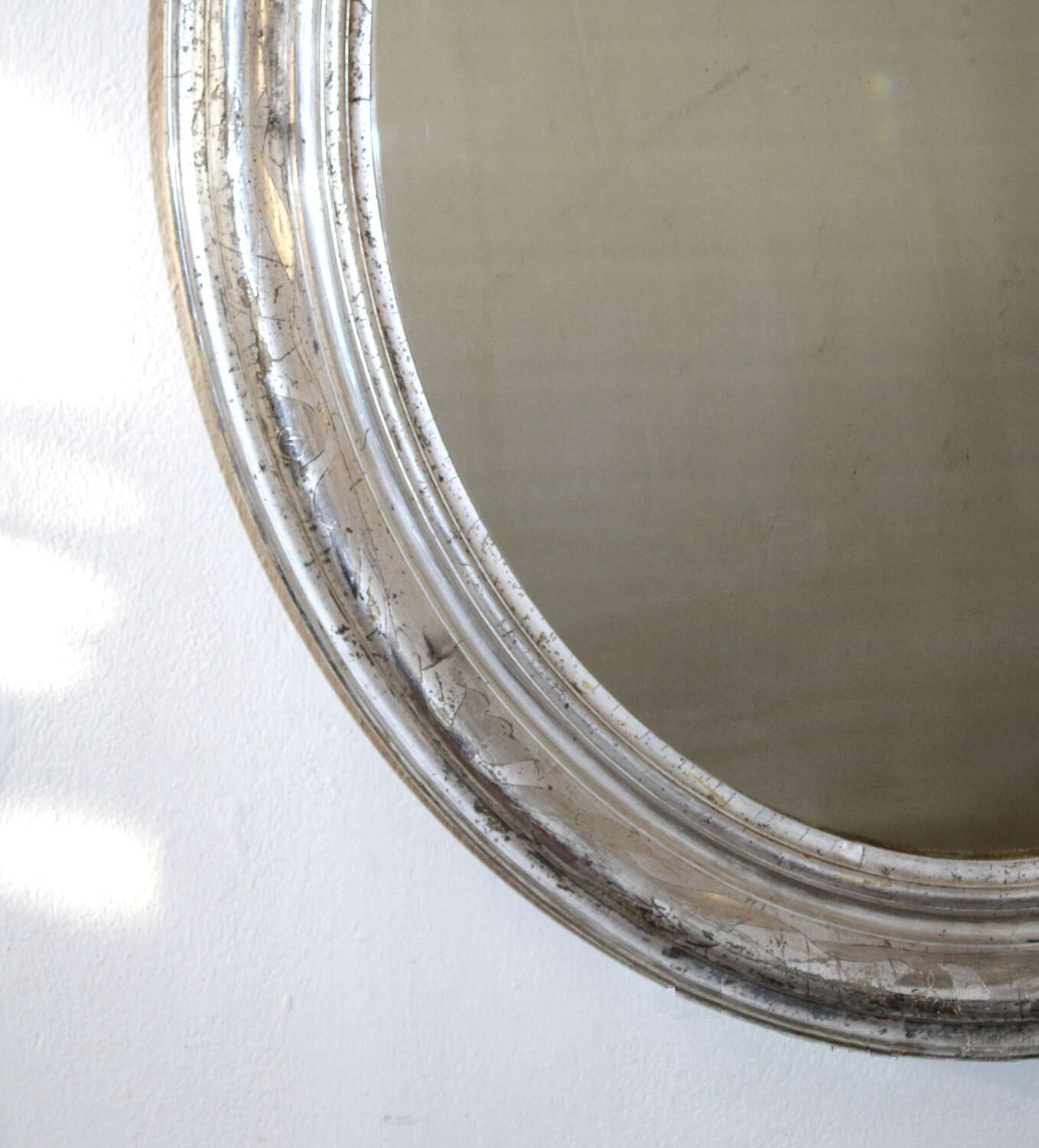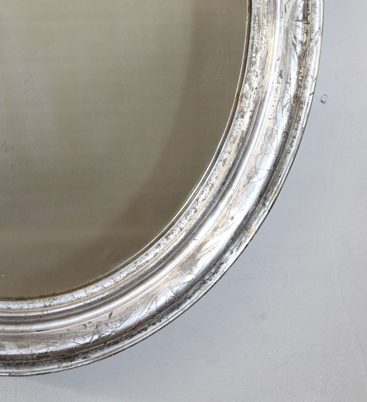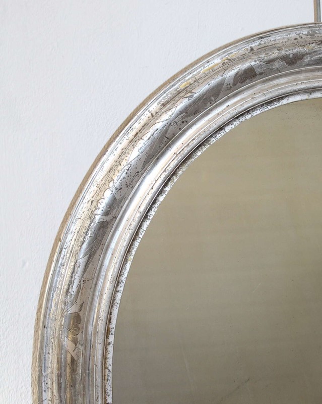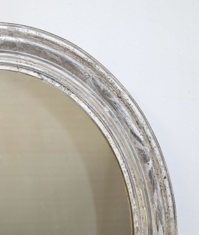 Late 19th century French oval mirror with rare, etched, silverleafed frame decorated with a flower and leaf design. After over 100 years of dusting, the silverleaf has developed an attractive patina which helps reveal the design. The original mirror glass is in very good condition with just a very little light age and gives an excellent reflection.