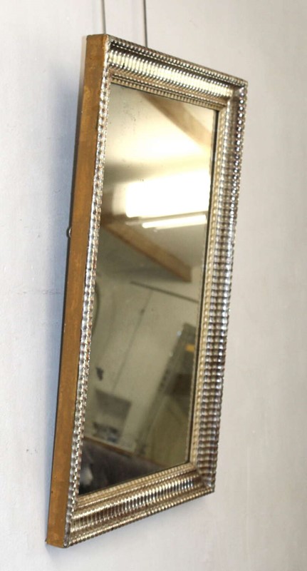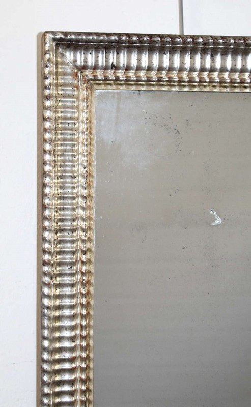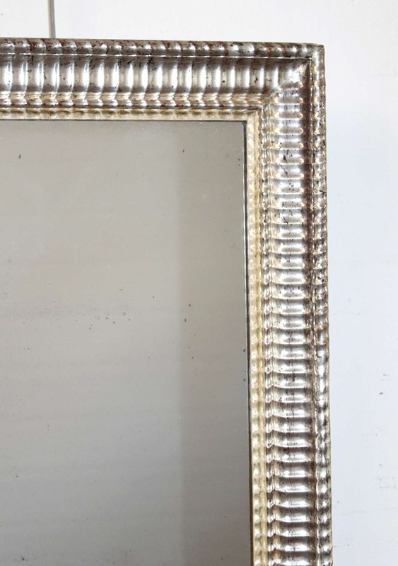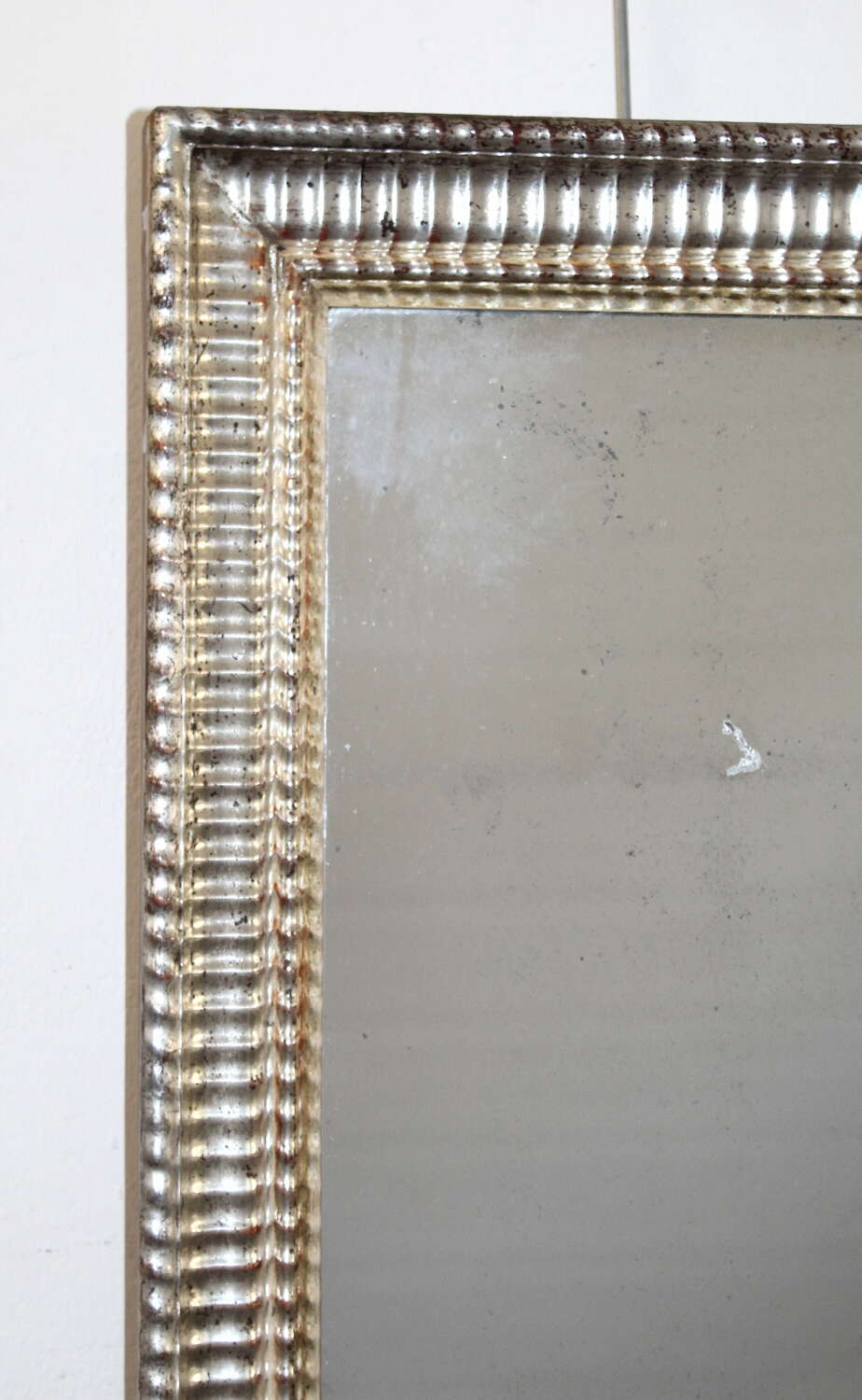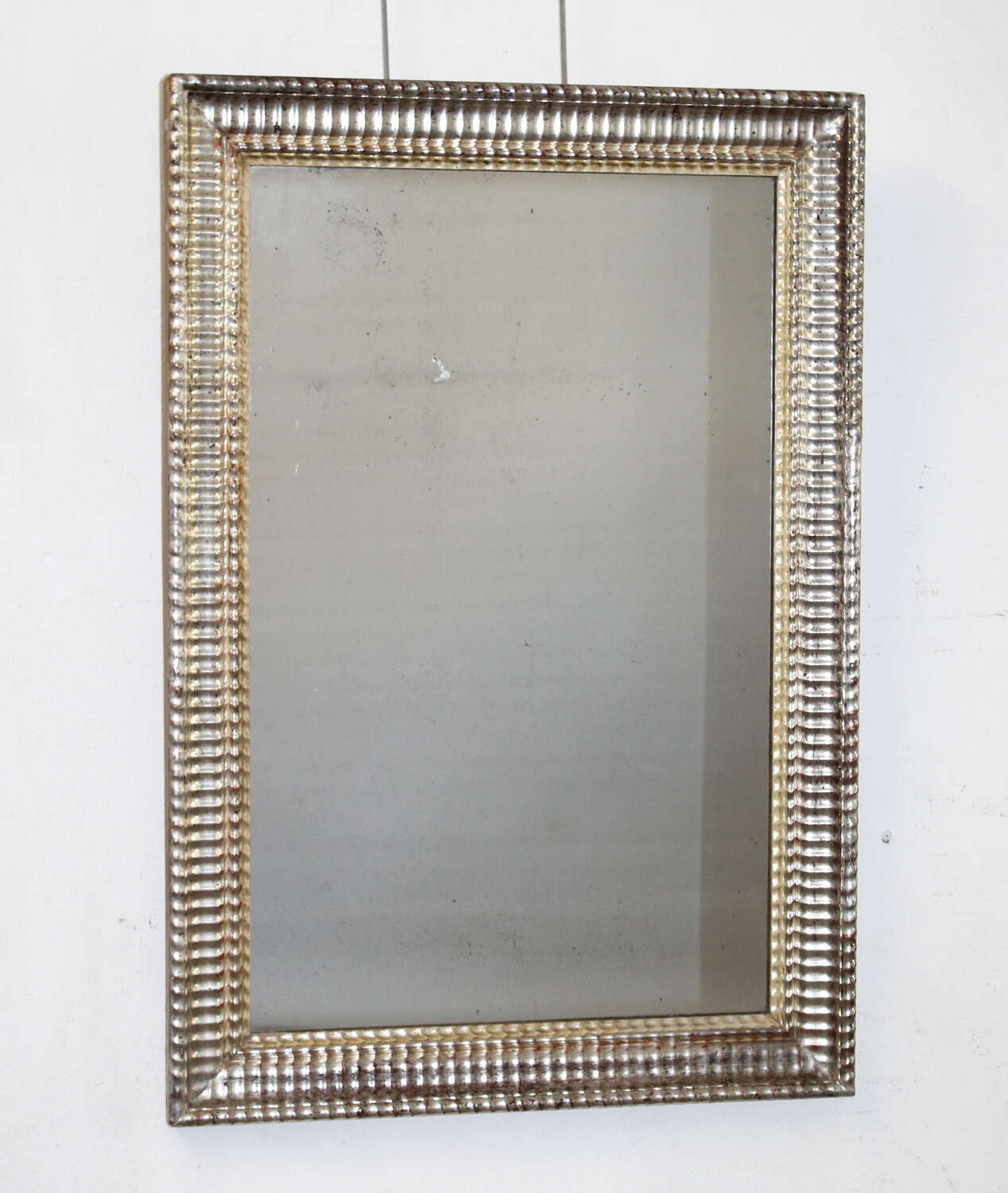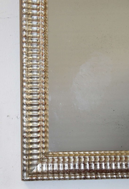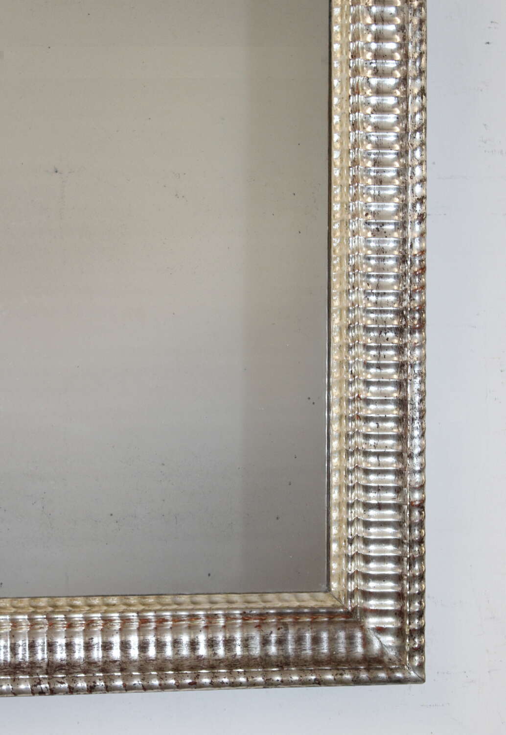 Antique French mirror, circa 1840, with silverleafed rippled frame. Where this mirror has been dusted for almost two hundred years, the silverleaf has thinned along the inside edge revealing the cream gesso and hints of terracotta bole beneath. The original mercury glass has some age but sparkles where it catches the light and gives a good reflection. This mirror can be hung portrait (as photographed) or landscape.