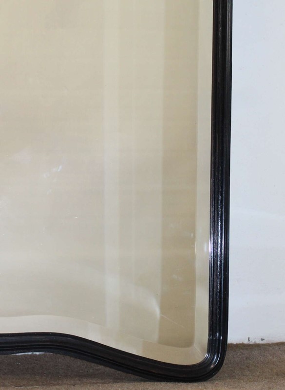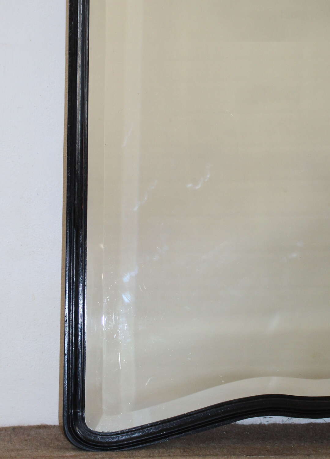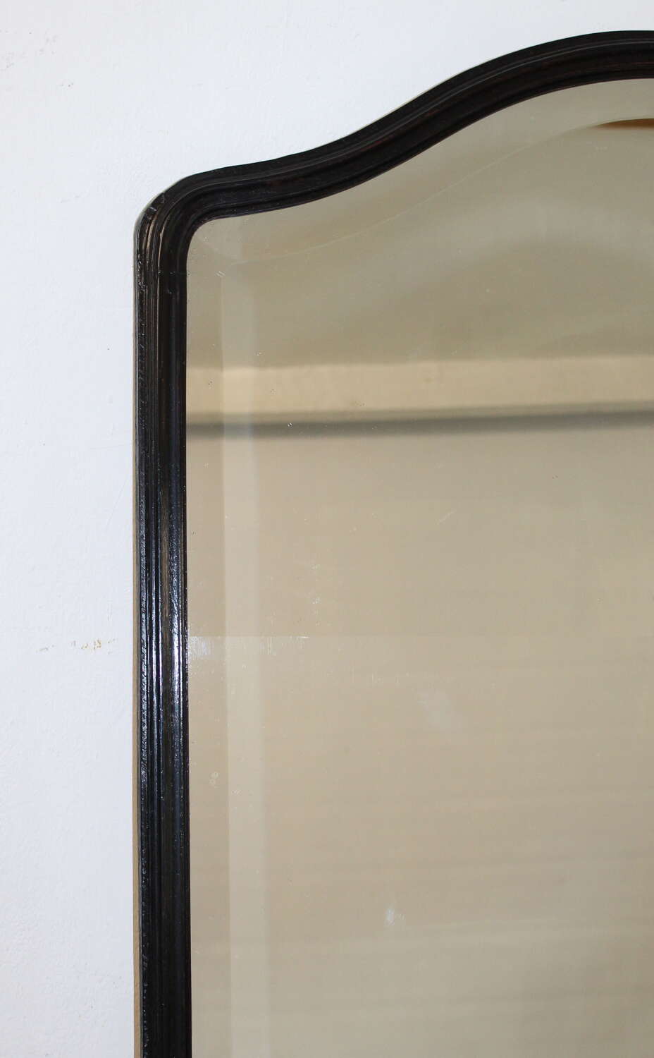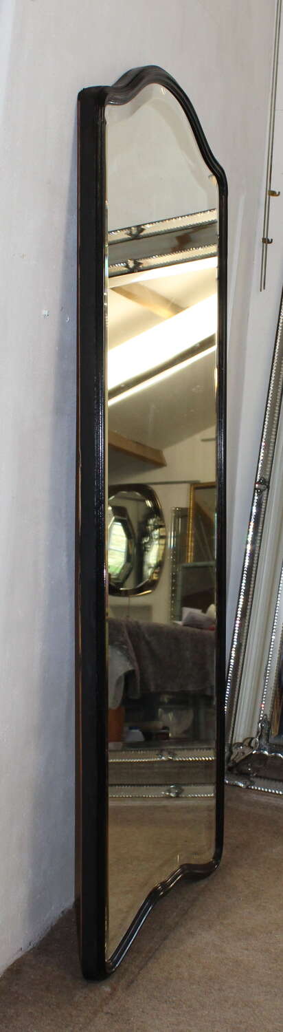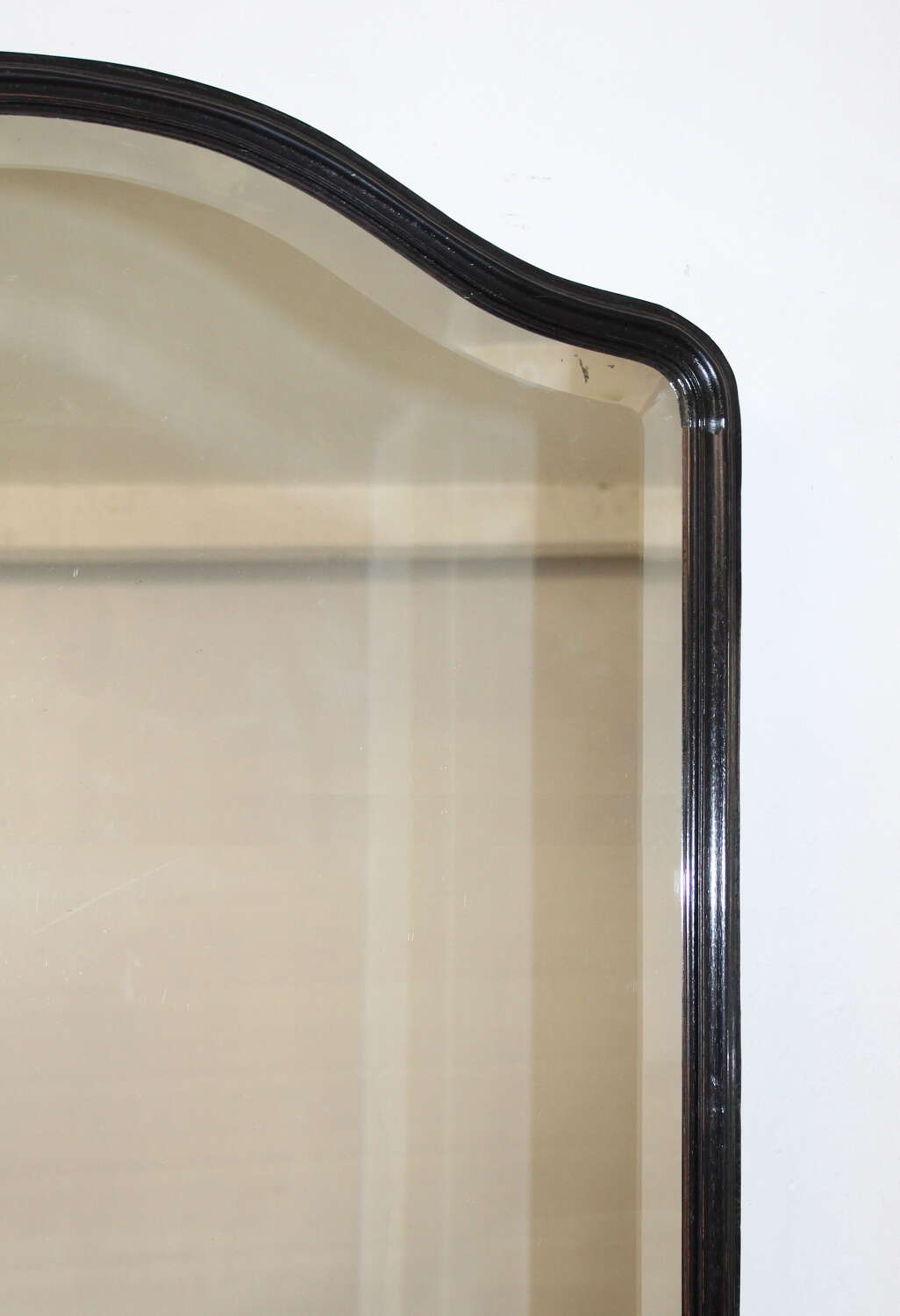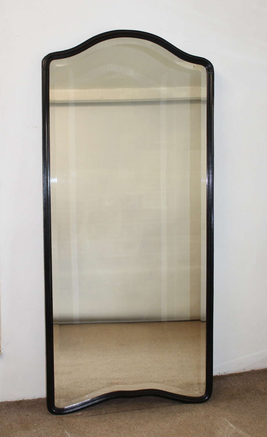 19th century French full-length mirror, circa 1890, with ourcurving top and incurving, undulating base and narrow Japanned frame. The mirror glass has a wide bevel which follows the shape of the frame and has just a little, very light age and gives an excellent reflection. The back of the mirror is beautifully panelled.