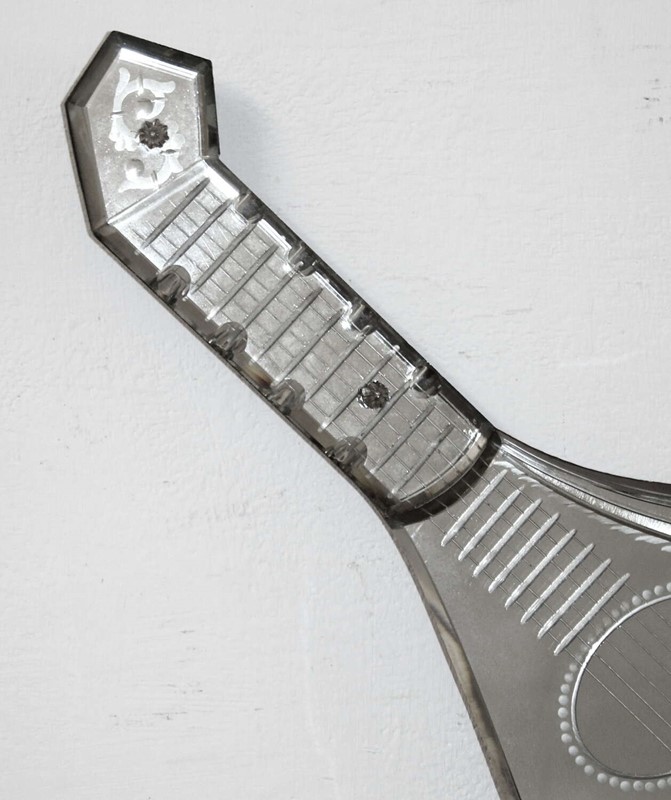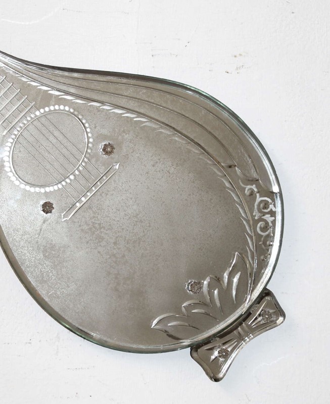 Very unusual, early 20th century, Venetian mirror in the shape of a guitar or mandolin. The details of the musical instrument have been cut and etched into the reverse of the mirror, along with a few decorative curls and flowers, and there is a gentle patina in the glass, which still gives a very good reflection. The mirror is finished with a shaped wooden back.