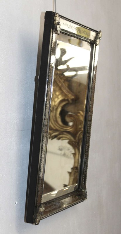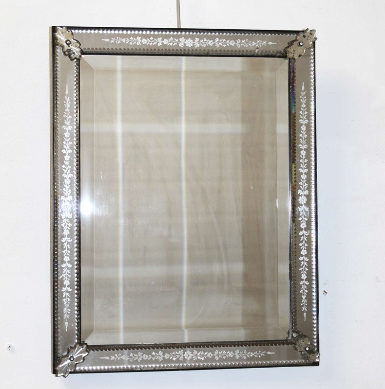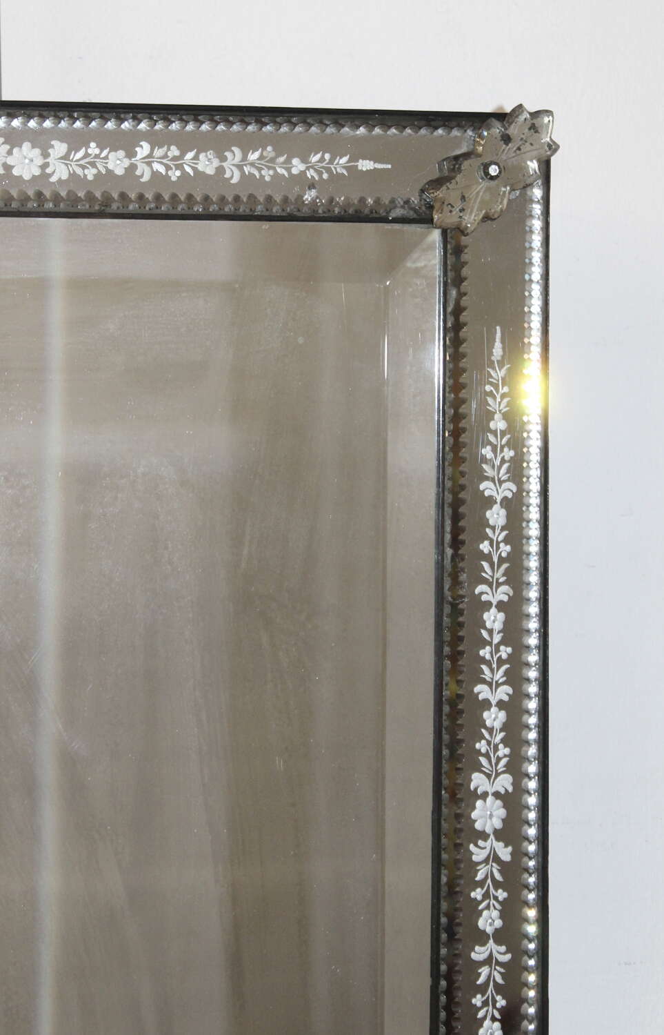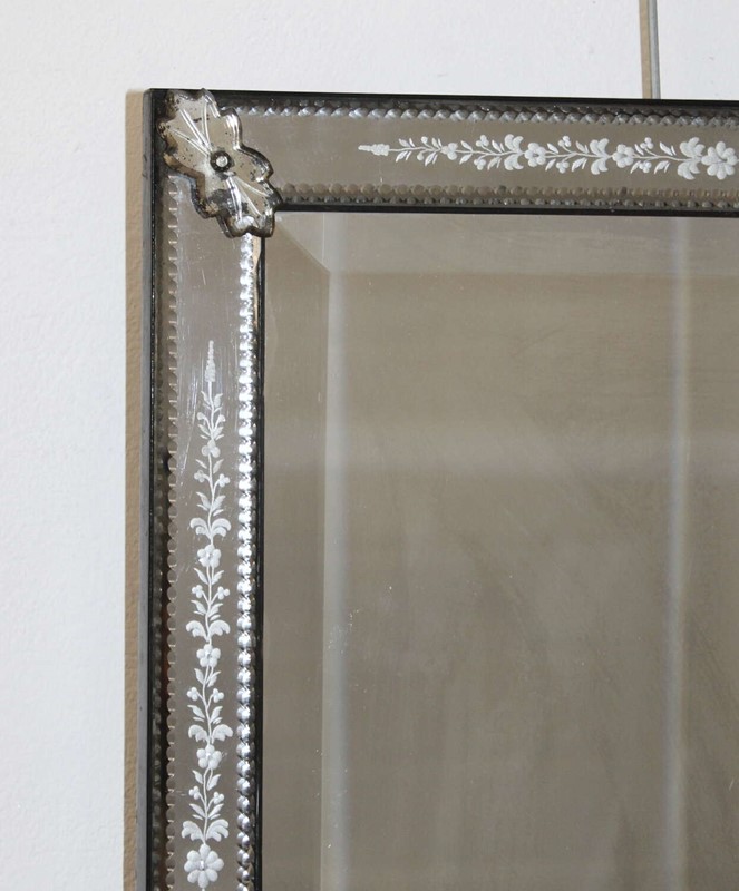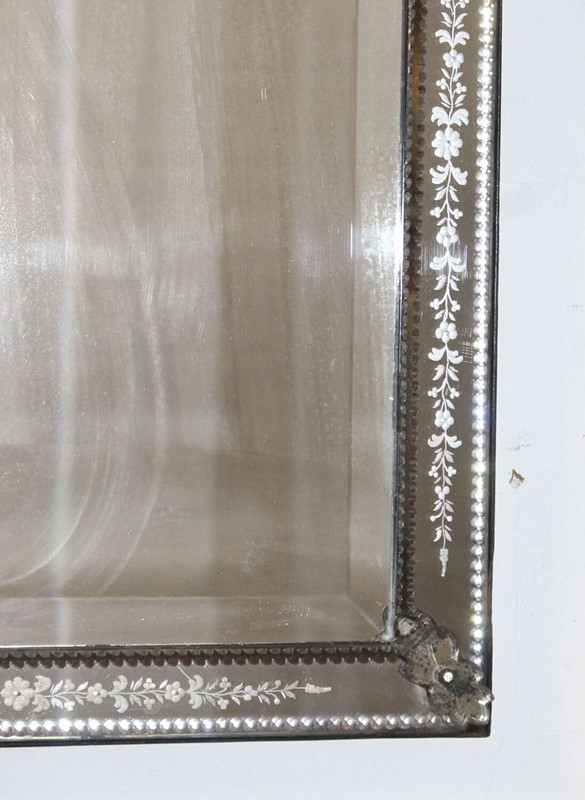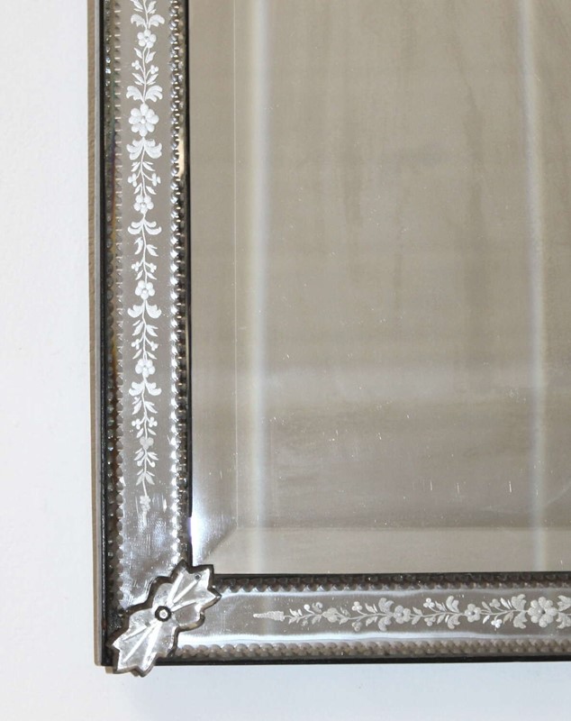 Charming little mid-19th century Venetian mirror with a delicate floral and foliate etching decorating the centre section of the frame and scallop cut edges. Each corner of the mirror has a small cut glass leaf which is secured with a diamond-cut glass-topped screw. There is a little age in the glass leaves and some very light shading in the original, bevelled, central glass but this shows more strongly in the flash photography (which also causes the vertical and horizontal white lines) than in natural light, where the mirror gives a very good reflection.