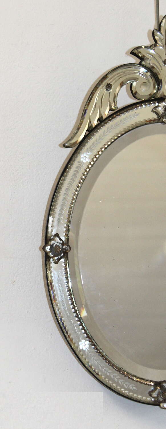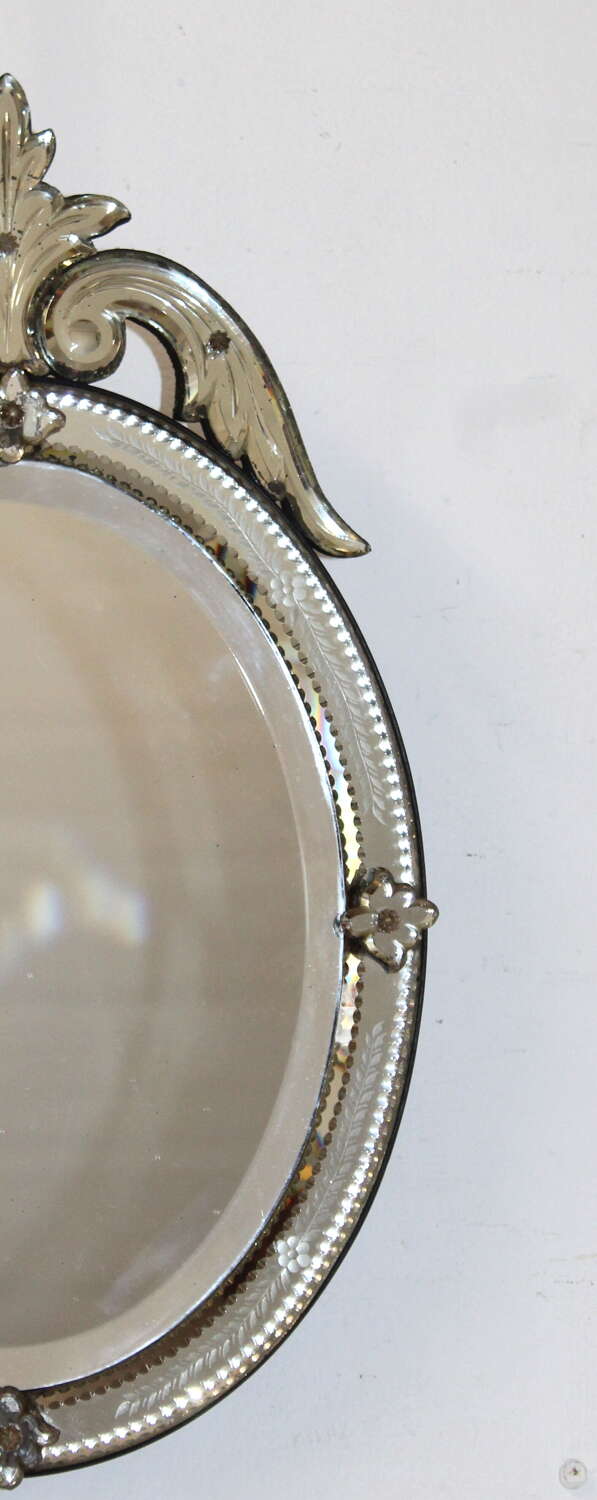 This very pretty little 19th century oval Venetian mirror, circa 1890, has a dainty scallop-cut edged frame decorated mid-frame with a design of leaves running either side of a central flower. Each section of the frame is secured with a small fanned leaf held in place with a little glass flower topped screw. The top of mirror has a high, acanthus leaf cartouche also secured with glass flower topped screws. The original, bevelled, central glass is in very good condition and gives an excellent reflection.