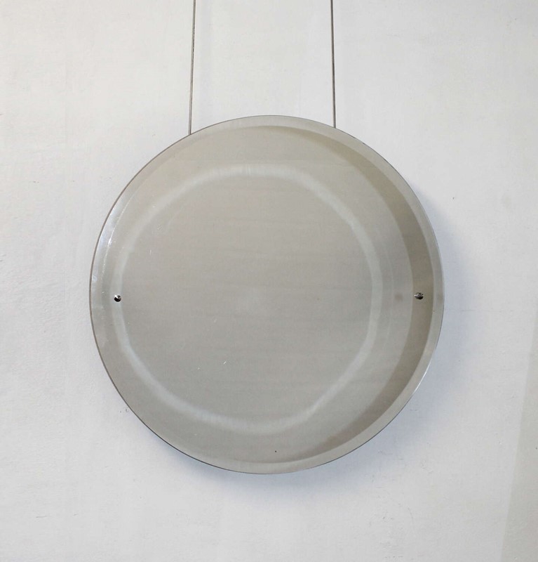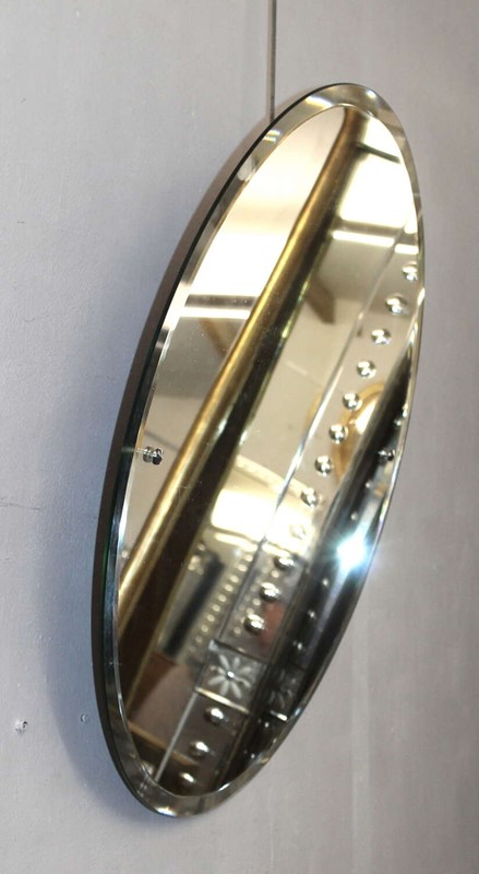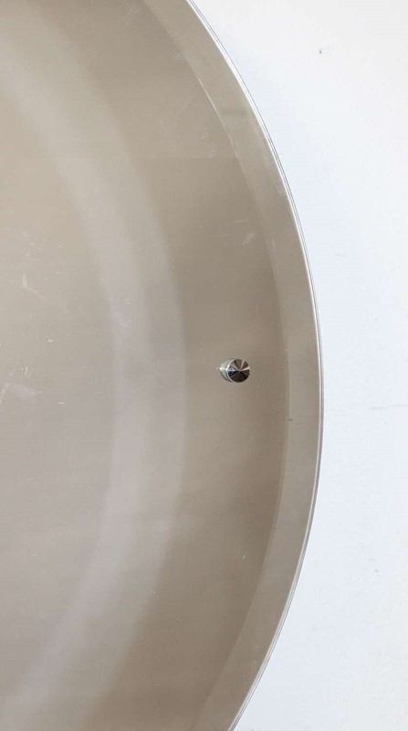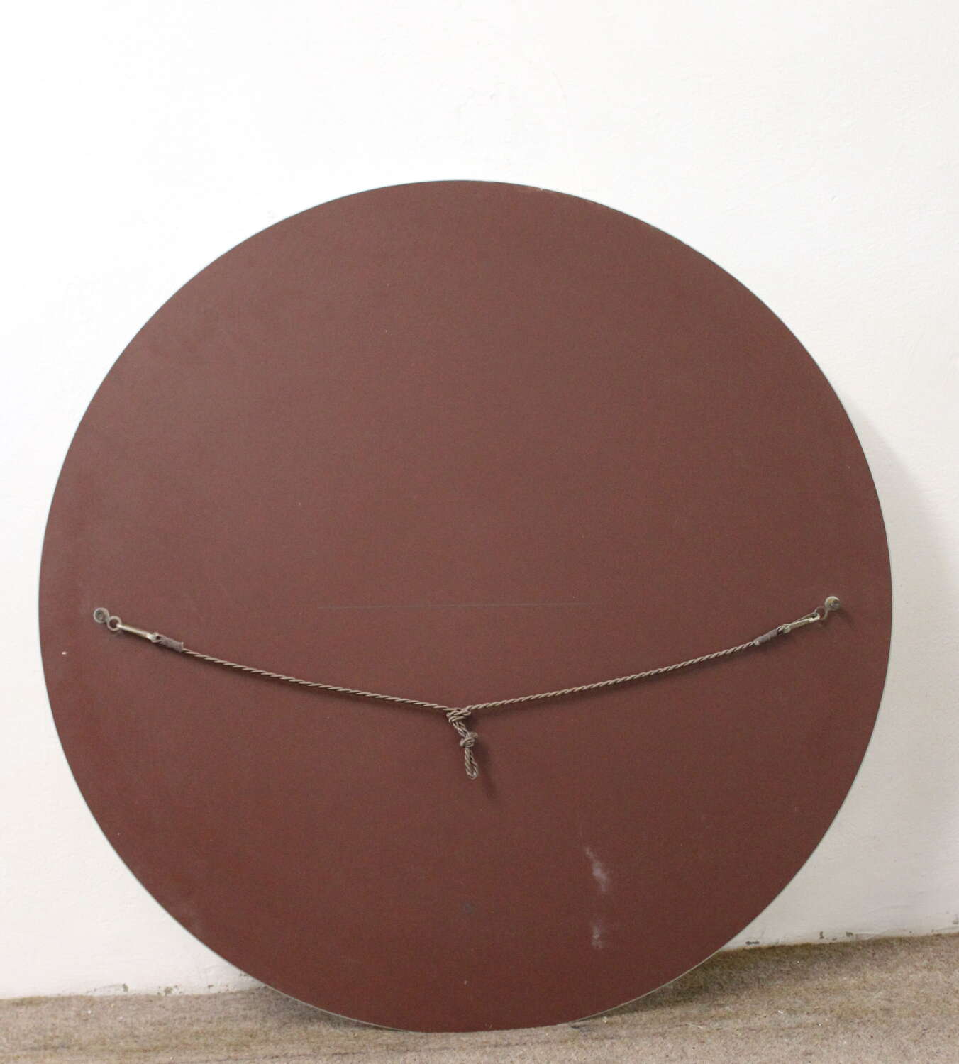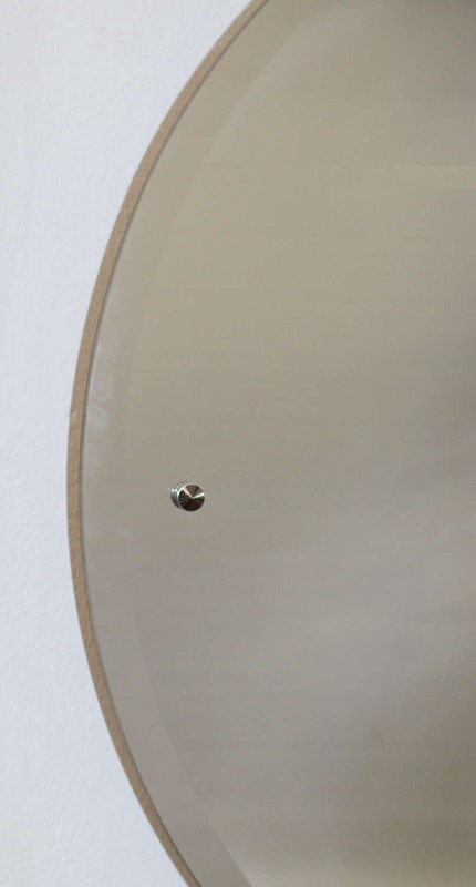 Mid 20th century, frameless, circular mirror with bevelled glass in very good, original condition. Two silver metal pointed studs on the front of the mirror are linked to the hanging fixtures on the back.