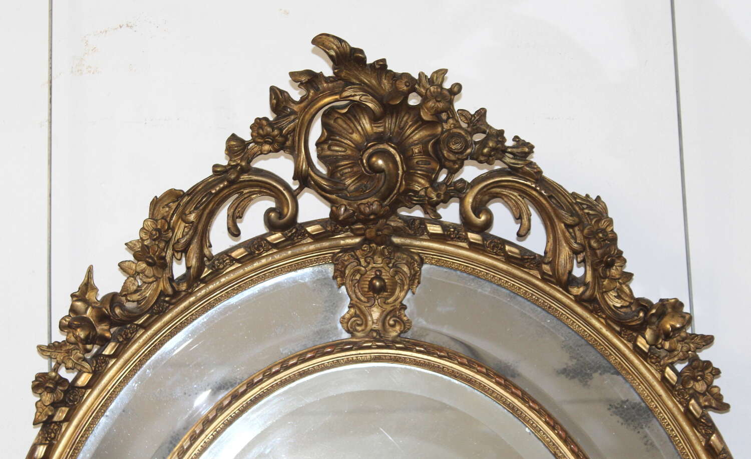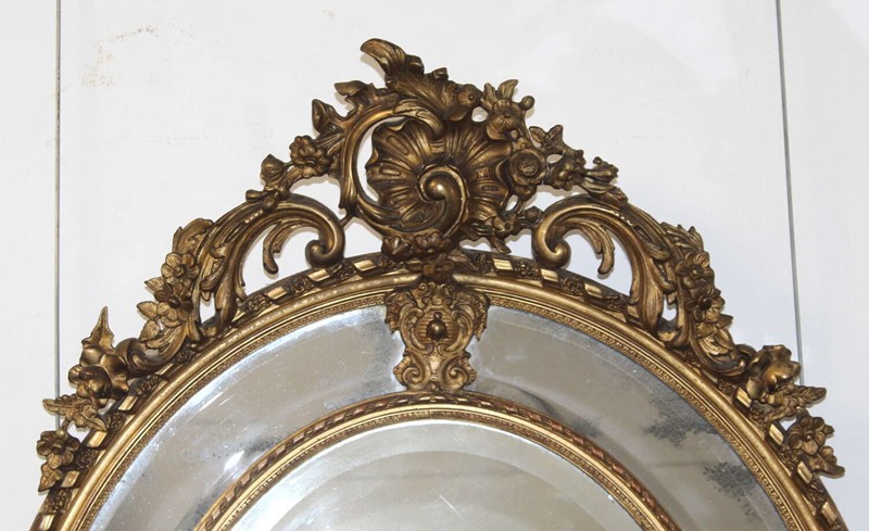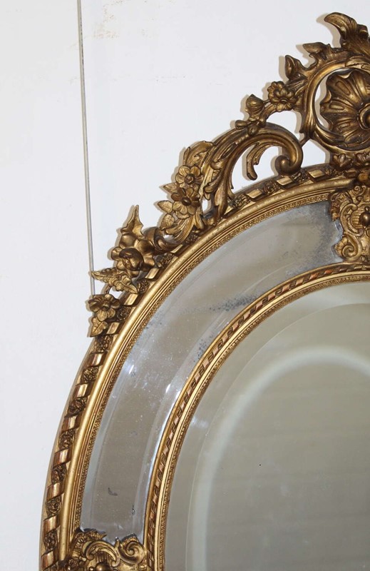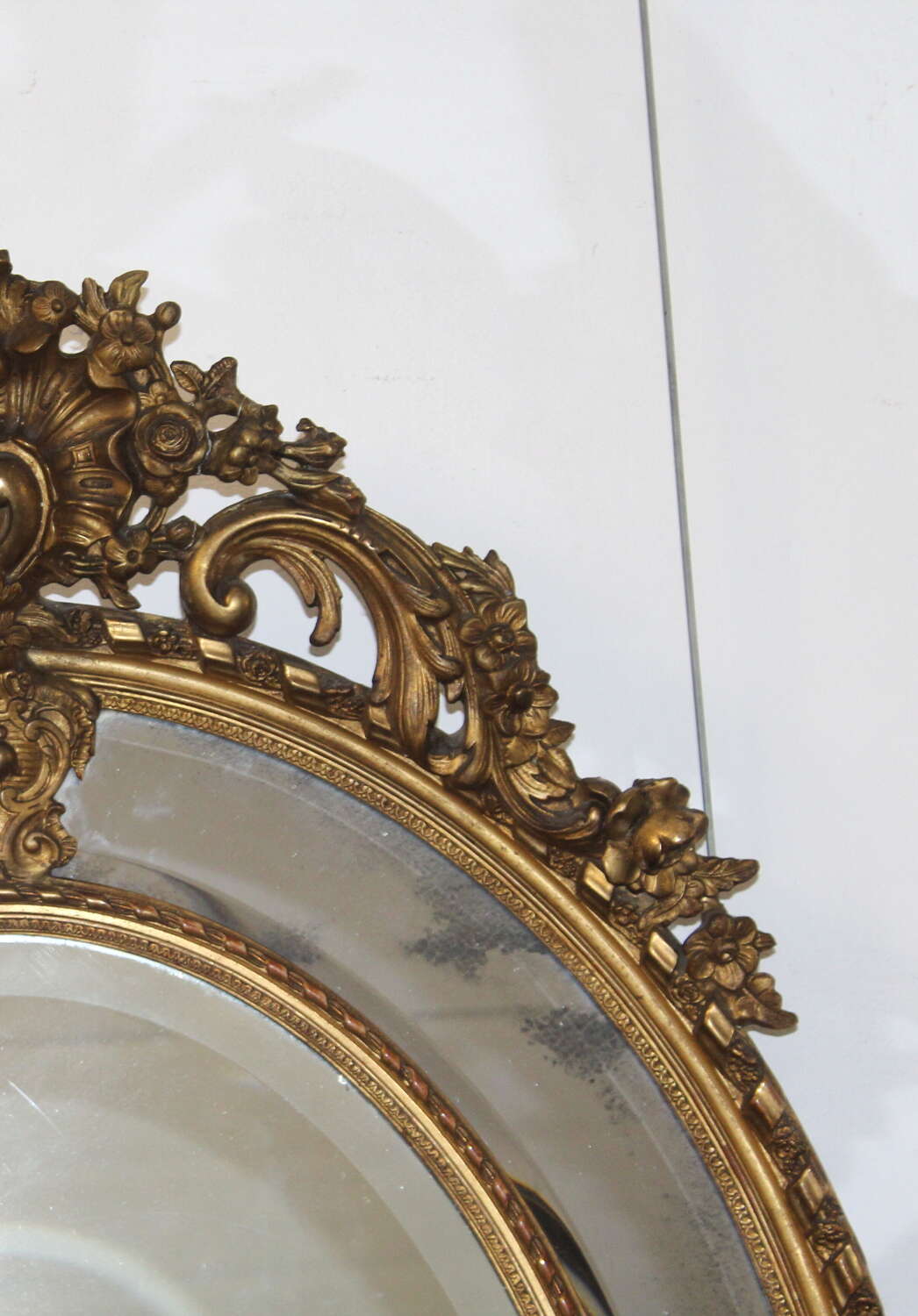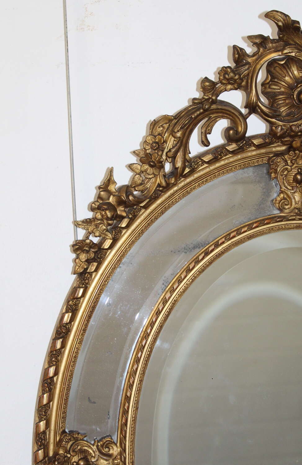 Large, decorative, gilt, antique French margin oval mirror, circa 1840. The outer frame has an alternating ribbon twist and floral design with a delicate row of overlapping leaves on the inside edge and the inner frame has a ribbon twist and overlapping leaf decoration. The two frames are linked with four medallions of curled leaves, ribbons and central bell flowers, the mirror is topped with a wide floral and foliate cartouche and pierced acanthus leaves decorate the base. The gilding on this mirror has darkened over the ages and is a pleasing brown-gold. Each section of the mirror has bevelled, mercury glass and the outer sections have some foxing, mainly towards the bottom of the mirror, but the central bevelled glass is very good and gives an excellent reflection.