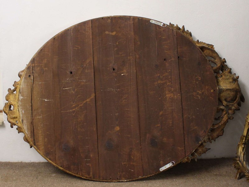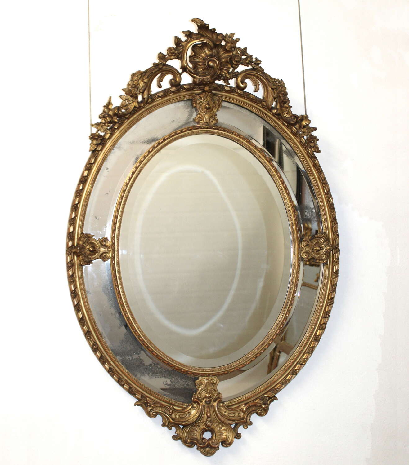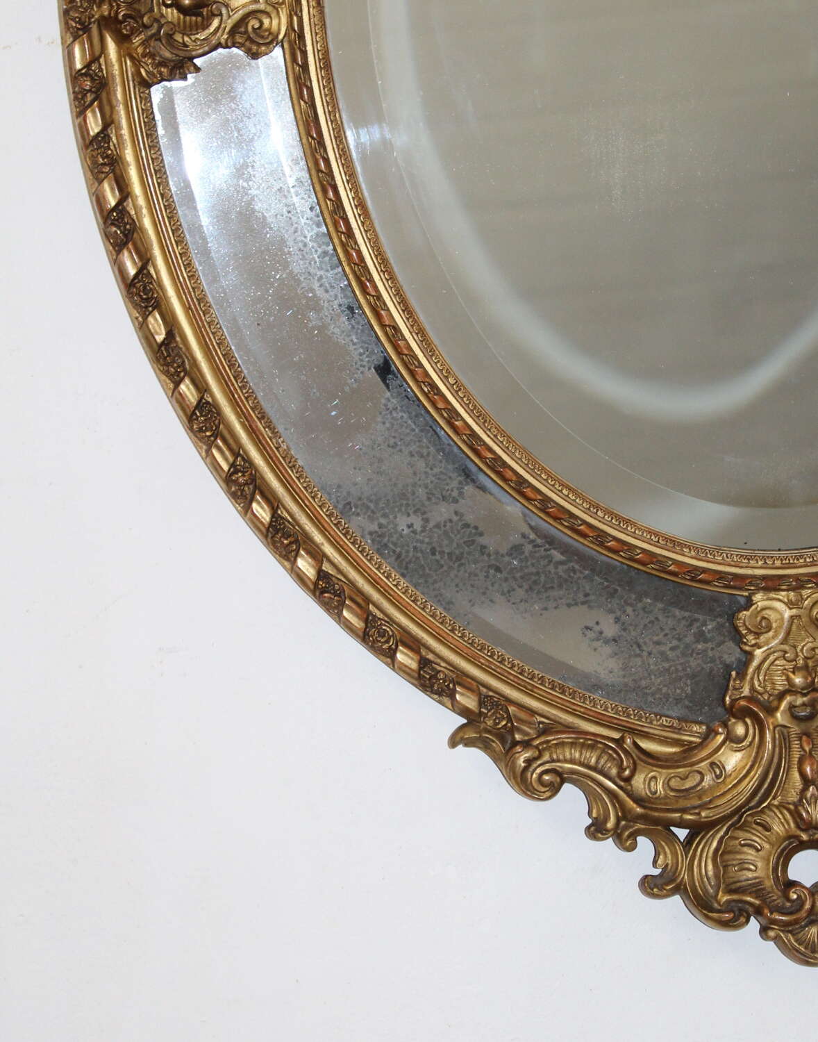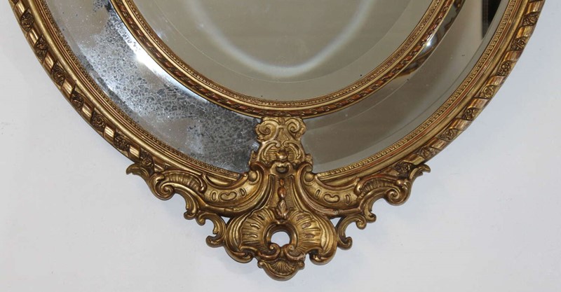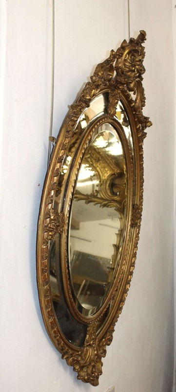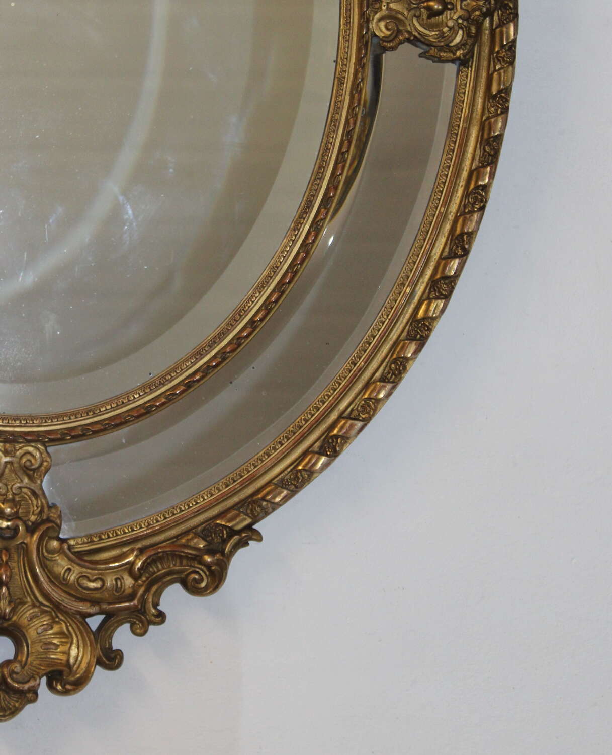 Large, decorative, gilt, antique French margin oval mirror, circa 1840. The outer frame has an alternating ribbon twist and floral design with a delicate row of overlapping leaves on the inside edge and the inner frame has a ribbon twist and overlapping leaf decoration. The two frames are linked with four medallions of curled leaves, ribbons and central bell flowers, the mirror is topped with a wide floral and foliate cartouche and pierced acanthus leaves decorate the base. The gilding on this mirror has darkened over the ages and is a pleasing brown-gold. Each section of the mirror has bevelled, mercury glass and the outer sections have some foxing, mainly towards the bottom of the mirror, but the central bevelled glass is very good and gives an excellent reflection.