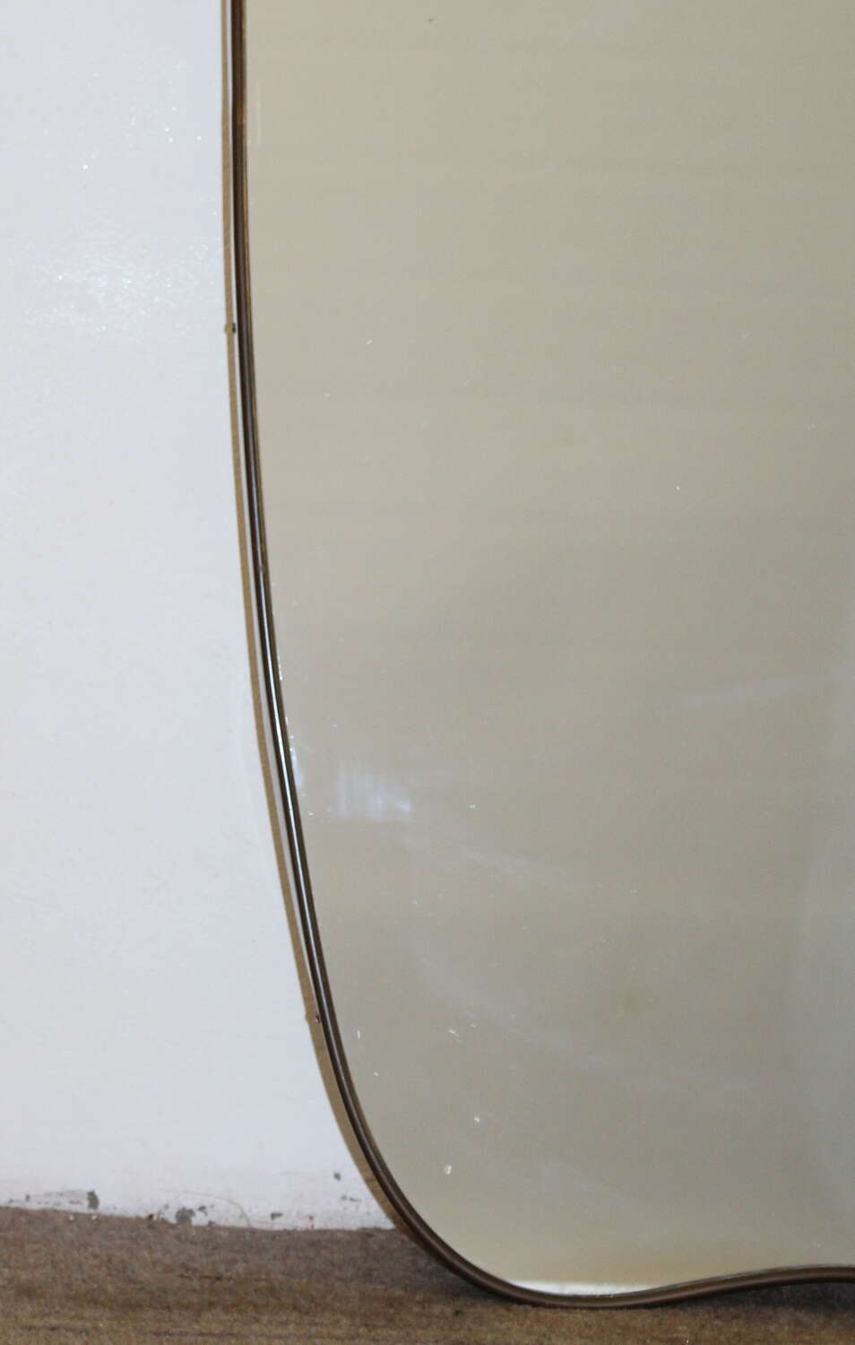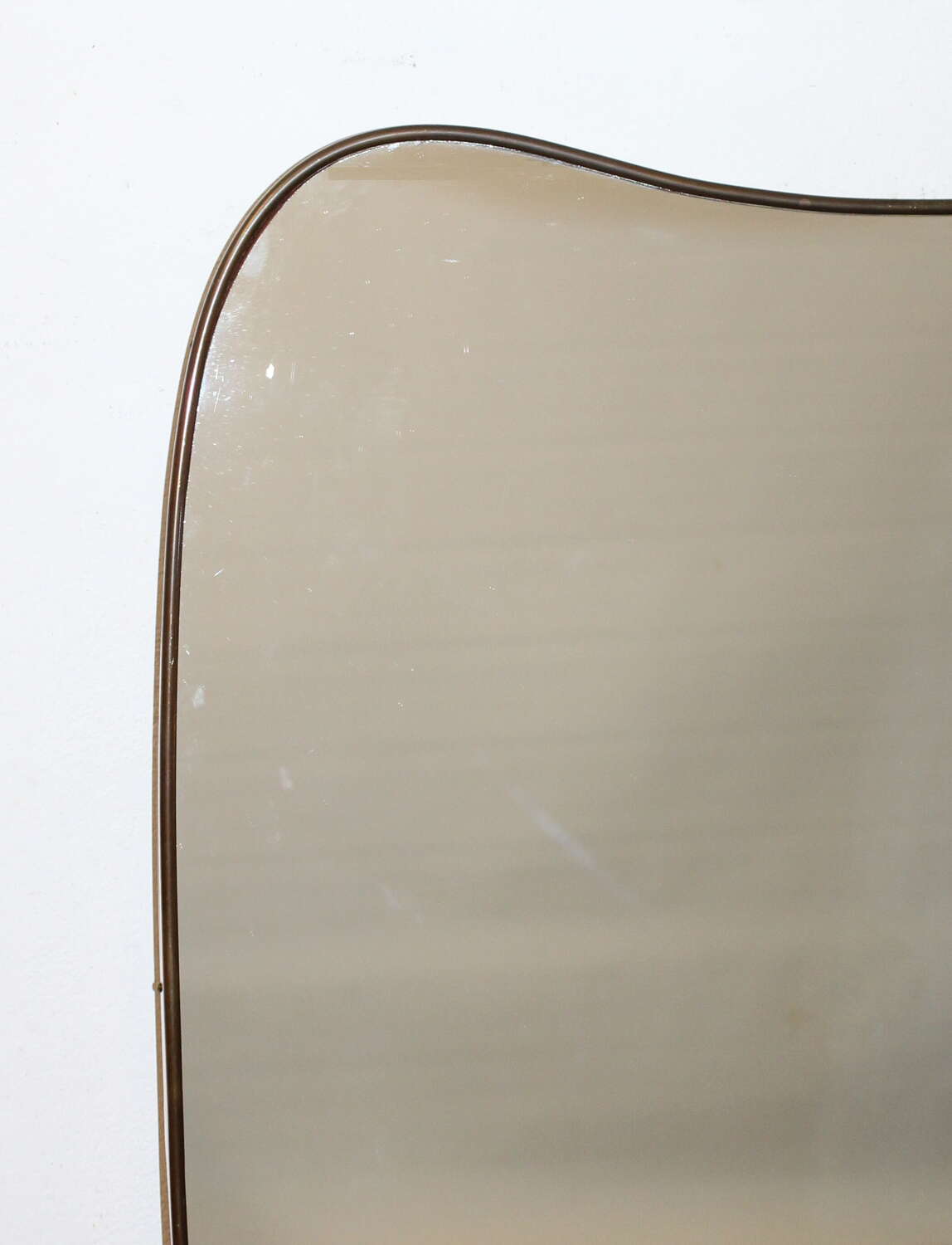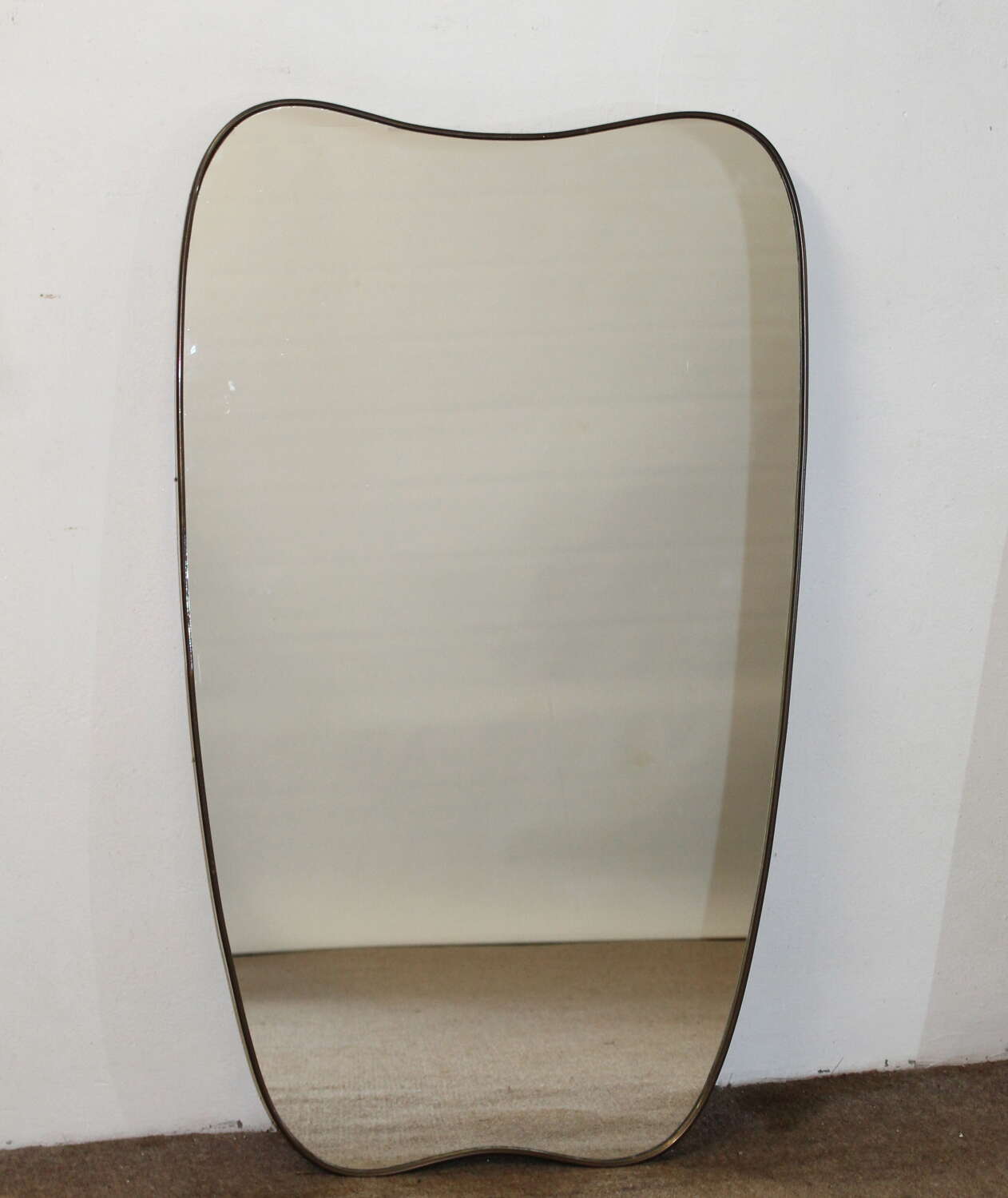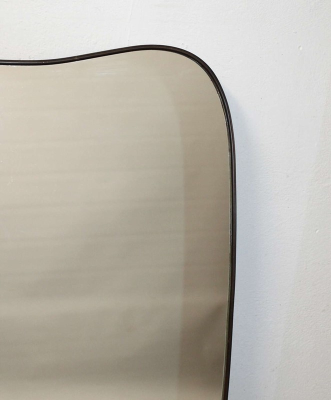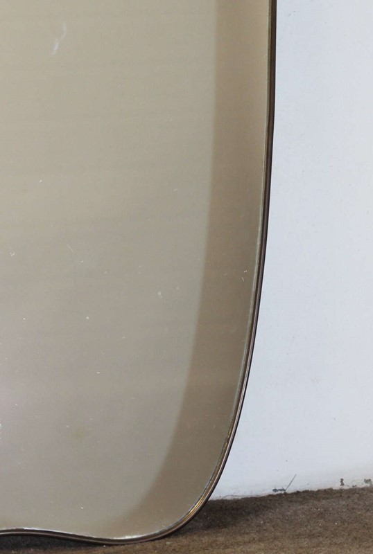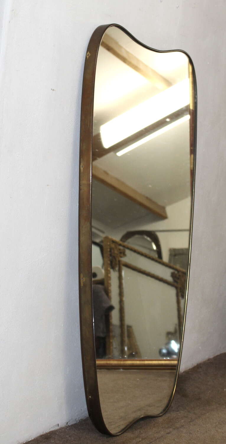 Narrow, elegant, brass-framed Mid-Century Modern Italian mirror with incurving top and base set between curved corners and tapering sides. The wooden back and depth of the brass frame indicates the mirror's originality and the mirror plate is in excellent condition, giving a very good reflection.