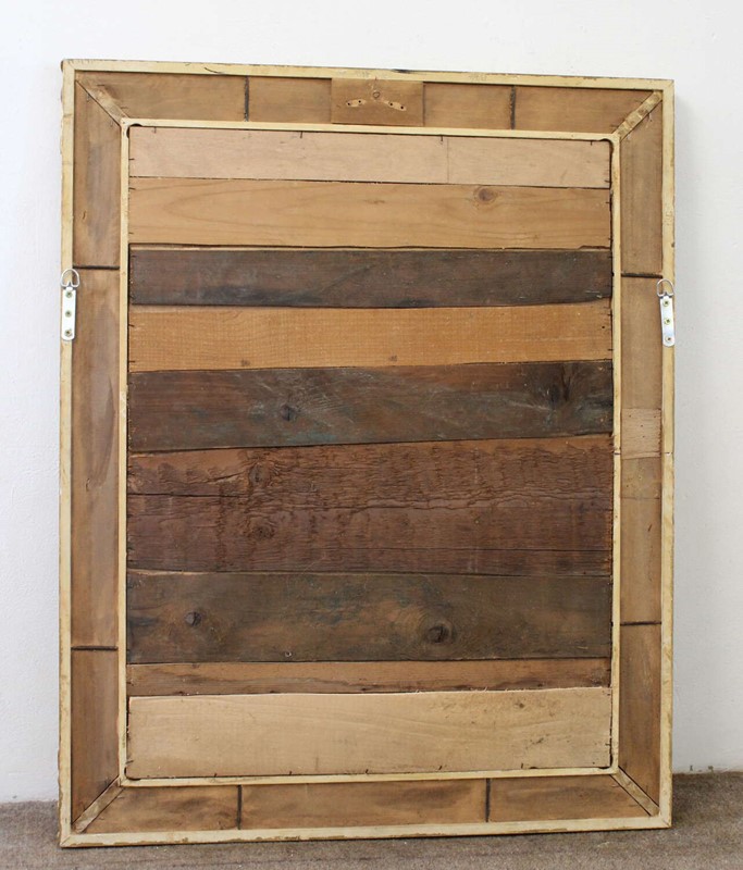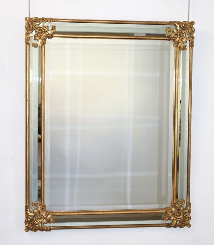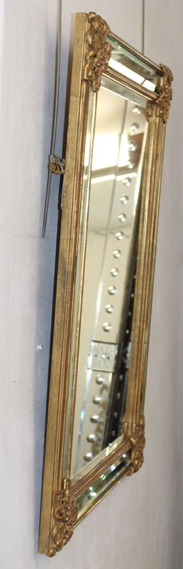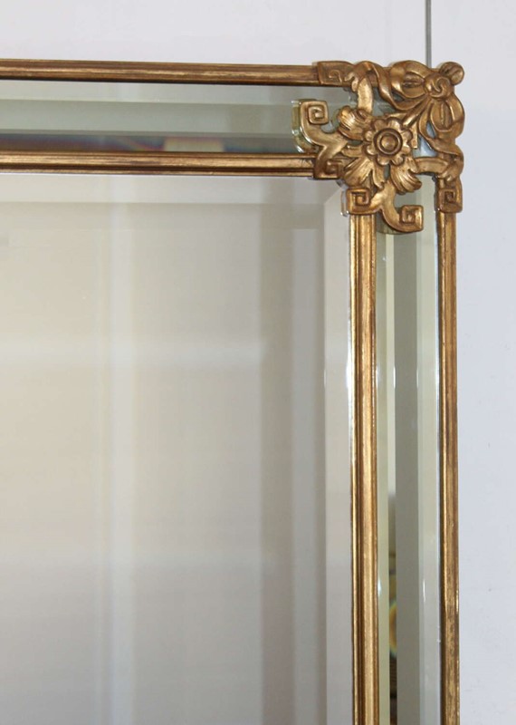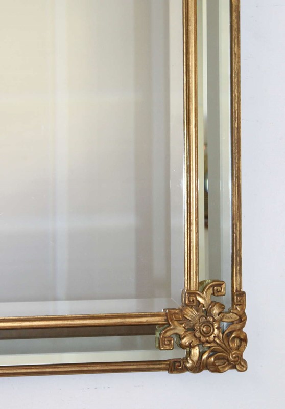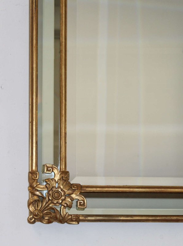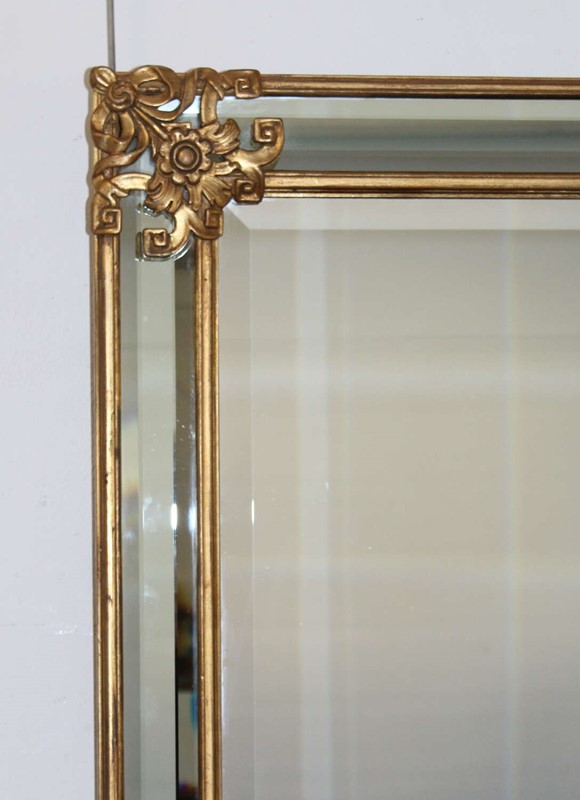 Mid-20th century French margin mirror with narrow gilt inner and outer frames linked with ribbon and floral decorative corners. The glass between the gilt frames has a wide bevel which catches the light and the central mirror glass is also bevelled and gives an excellent reflection. This elegant mirror can be hung portrait (as photographed) or landscape.