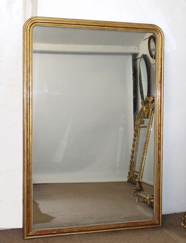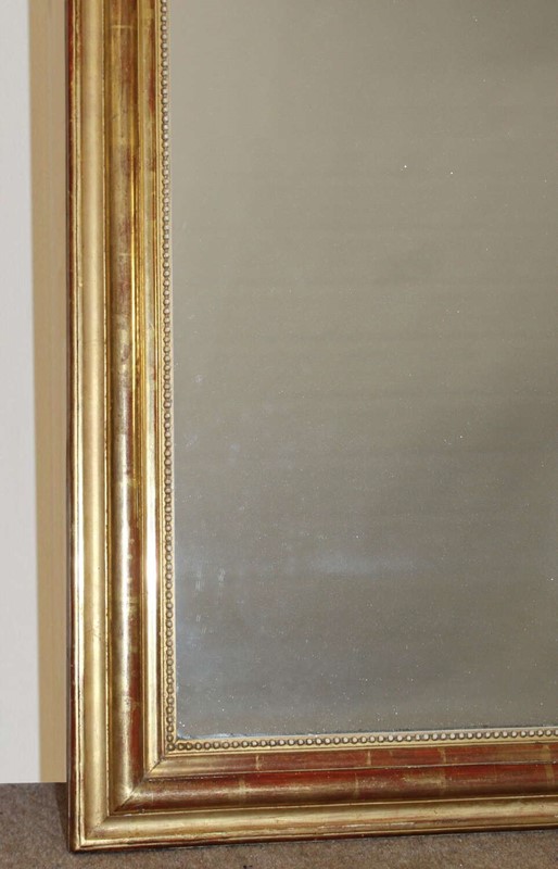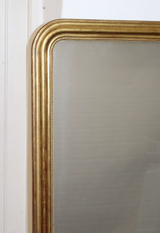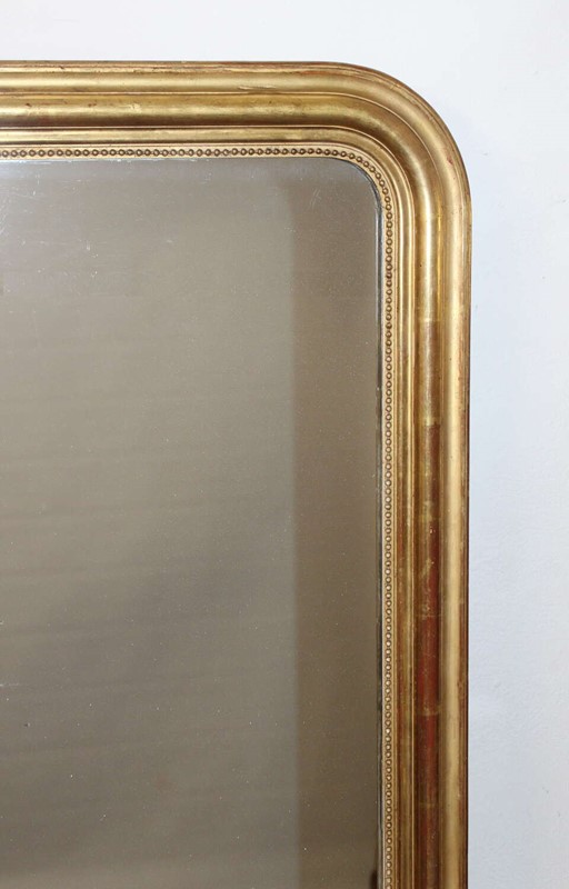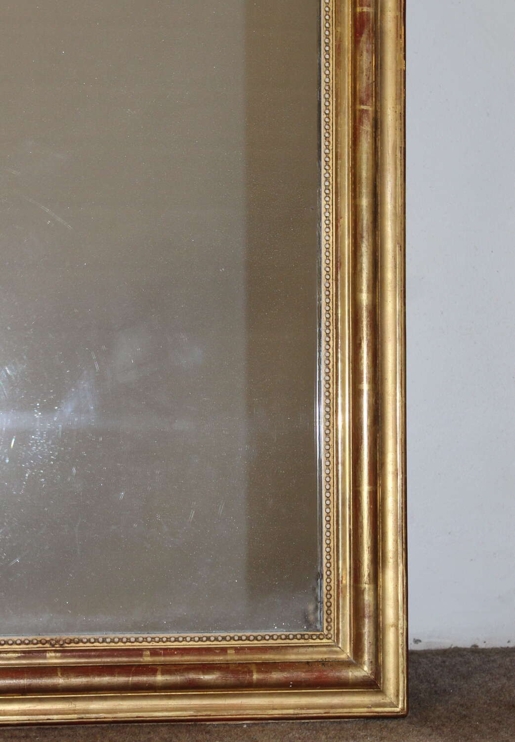 Very large antique French archtop mirror, circa 1840, with layered, watergilt frame. Where the mirror has been dusted for almost 200 years, the gilding has thinned (in the more reachable areas!) revealing the warm, terracotta bole beneath. What makes this mirror particularly stunning is the original mercury glass, in excellent condition, with sparkles across the whole mirror.