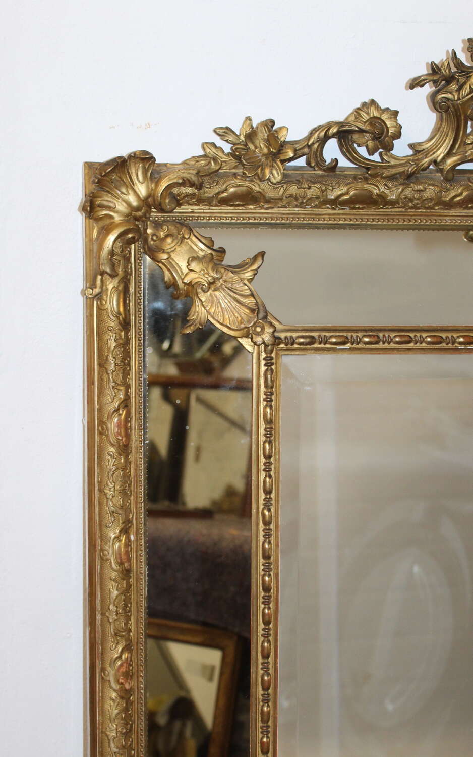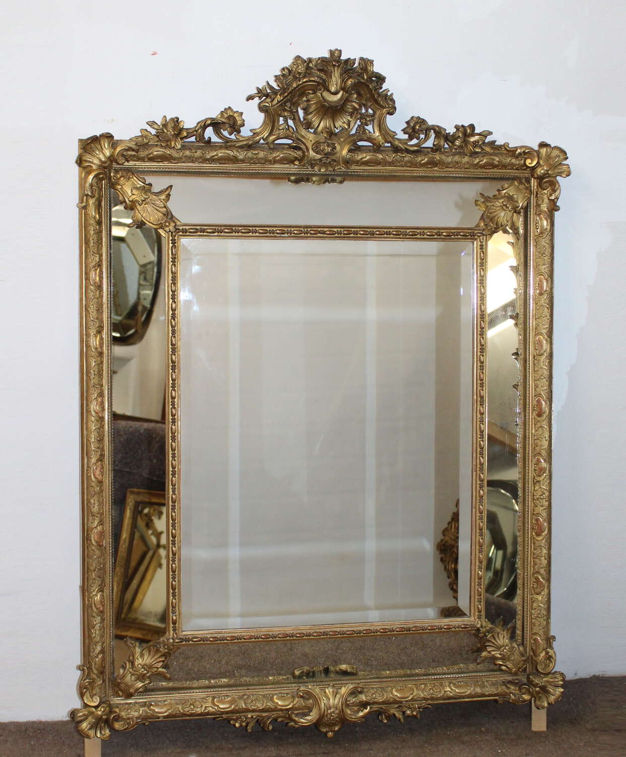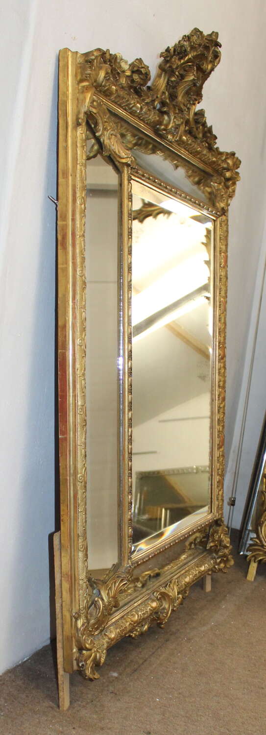Magnificent 19th century French cushioned mirror, circa 1880. The outer frame is decorated with an elegant, raised, scrolling leaf design surrounding burnished trefoil medallions and the inner frame has alternating narrow and long beading. The two frames are linked with a winged leaf design leading to a fanned leaf on the outside edge and the mirror is topped with a wide floral and foliate cartouche with a smaller floral and foliate decoration along the base. Each section of the mirror has original glass in excellent condition with a bevelled central plate. This superb mirror would have graced a very important house in France and was purchased at auction near Biarritz. (The supporting wooden legs would be removed before hanging.)