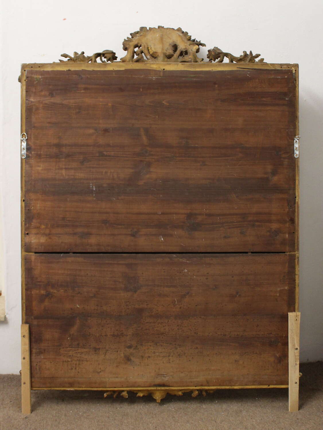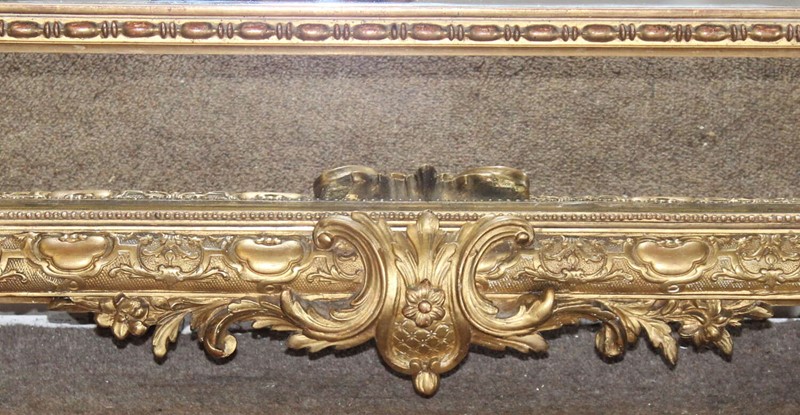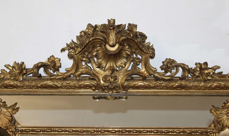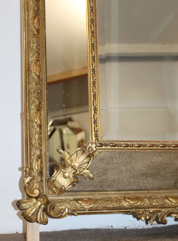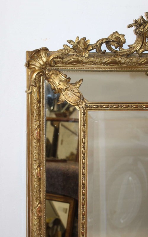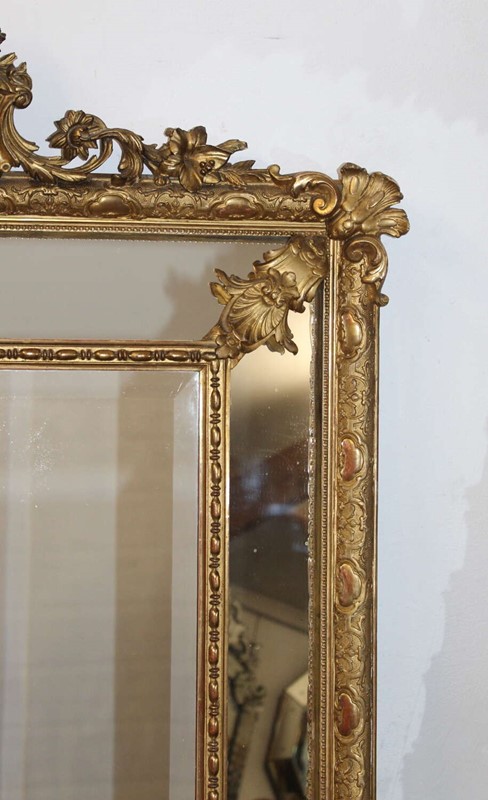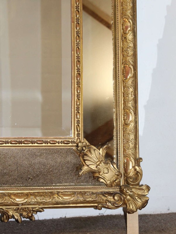 Magnificent 19th century French cushioned mirror, circa 1880. The outer frame is decorated with an elegant, raised, scrolling leaf design surrounding burnished trefoil medallions and the inner frame has alternating narrow and long beading. The two frames are linked with a winged leaf design leading to a fanned leaf on the outside edge and the mirror is topped with a wide floral and foliate cartouche with a smaller floral and foliate decoration along the base. Each section of the mirror has original glass in excellent condition with a bevelled central plate. This superb mirror would have graced a very important house in France and was purchased at auction near Biarritz. (The supporting wooden legs would be removed before hanging.)