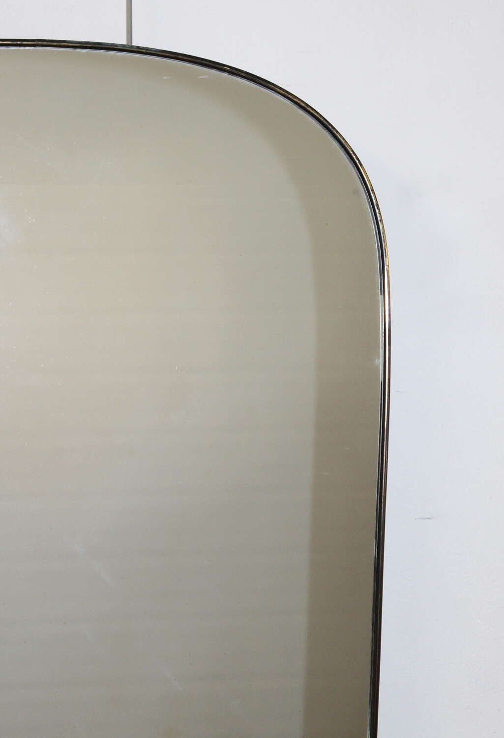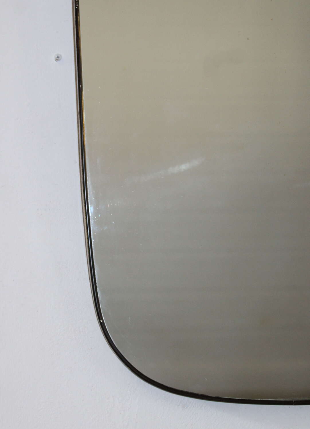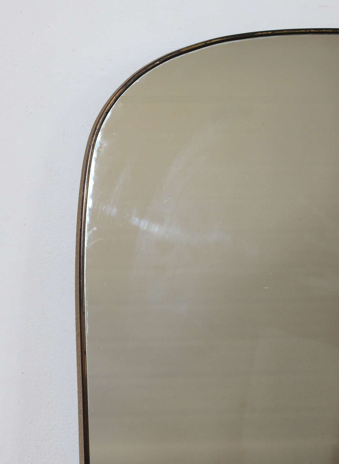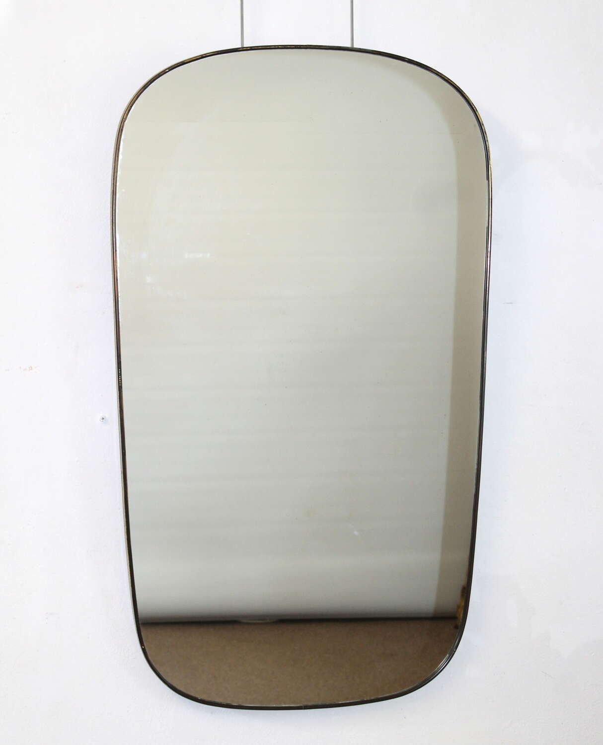 Mid-Century Modern Italian mirror with brass frame and four-curved corners and gently tapering sides, circa 1960. The original glass is in very good condition with just a hint of age and gives an excellent reflection. At the widest point the mirror measures 64cm and narrows to 55cm.