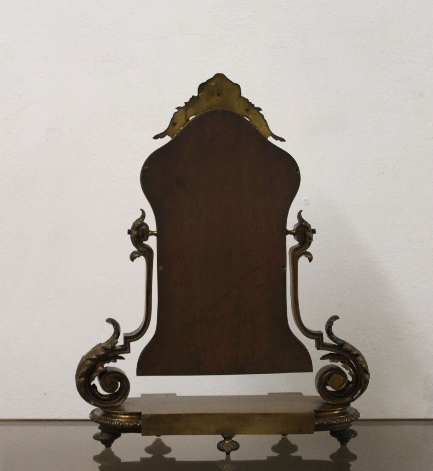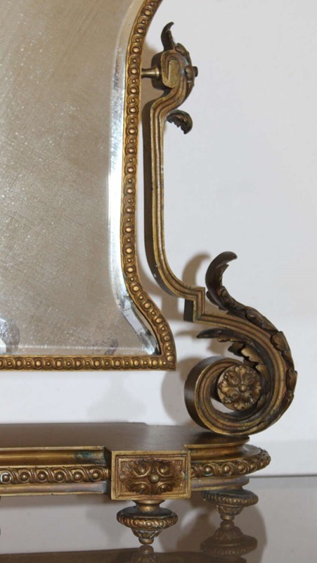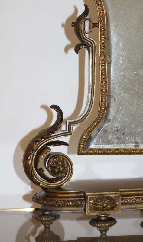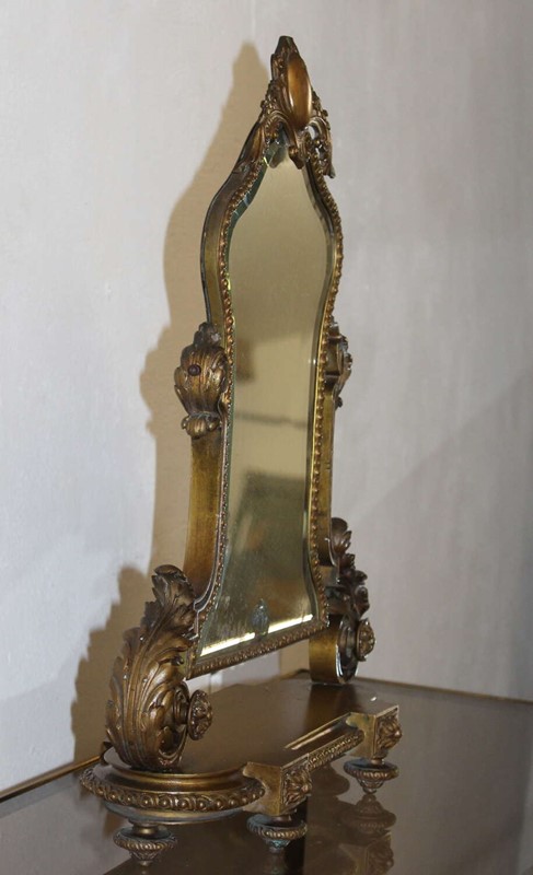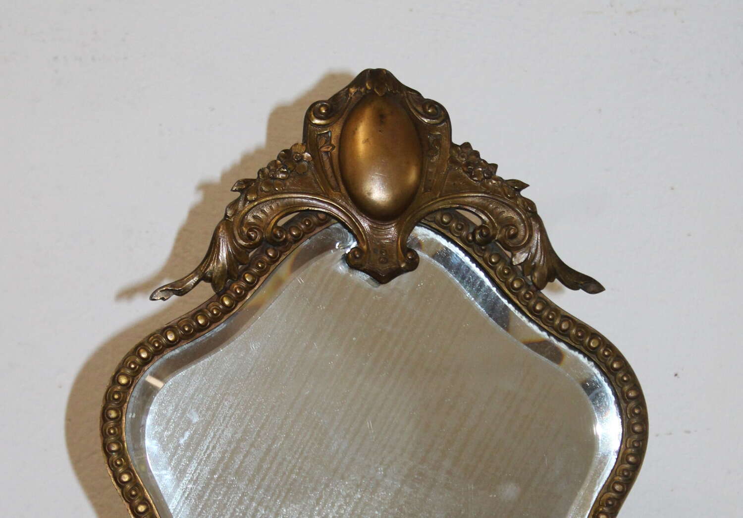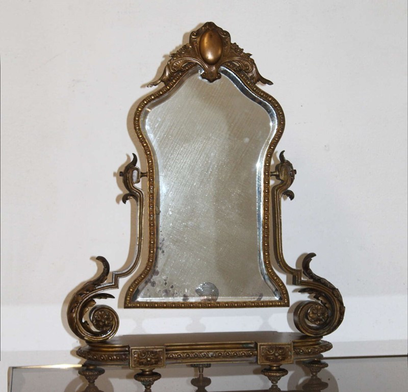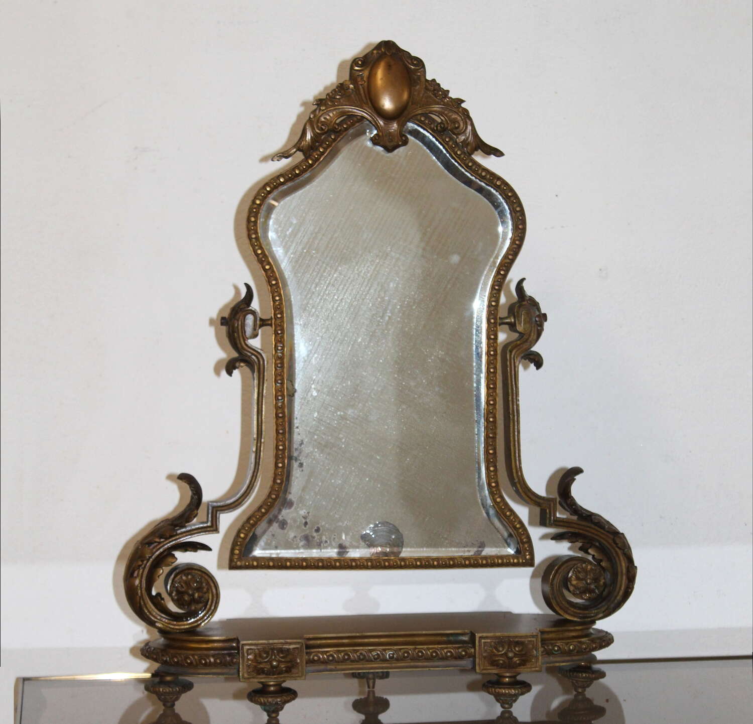 19th century French solid bronze dressing table mirror, circa 1880, with small, curvy, bevelled mirror decorated with a ribbon twist and beaded frame and topped with a floral and foliate cartouche. The tilting mirror is suspended between two stepped acanthus leaf decorated supports with a central rosette, set into an elongated oval base decorated along the front and side edges with matching ribbon twist and beading as well as rosettes within rectangles. Five tapering circular feet support the base. The original, bevelled, mirror has age and wear but complements the decorative look of this original piece.