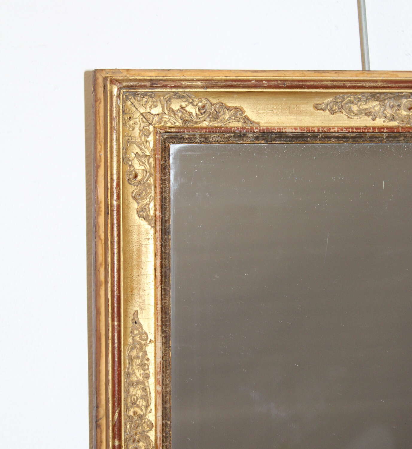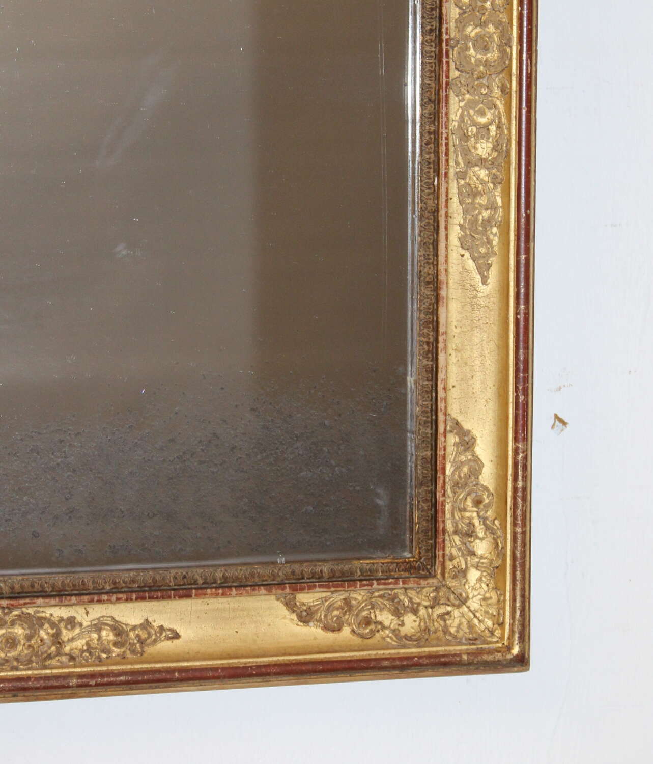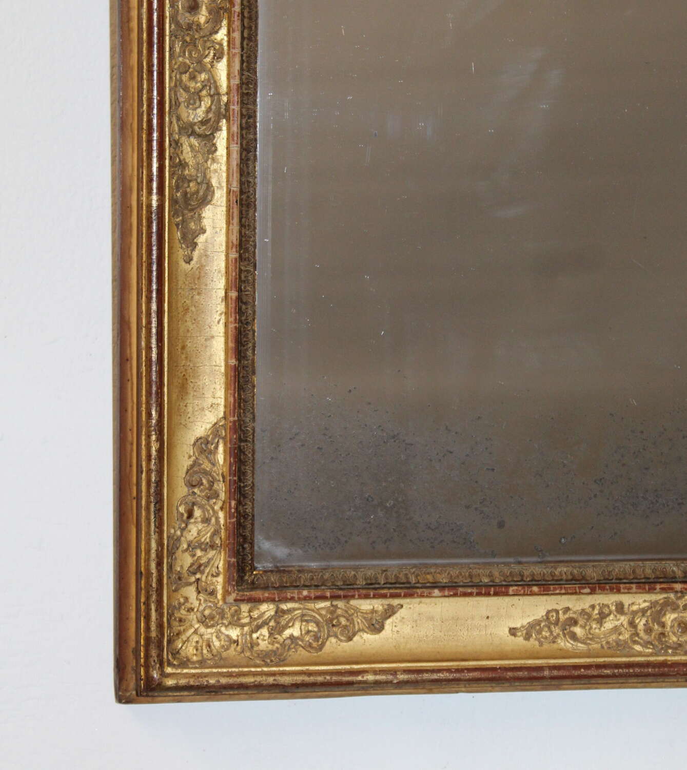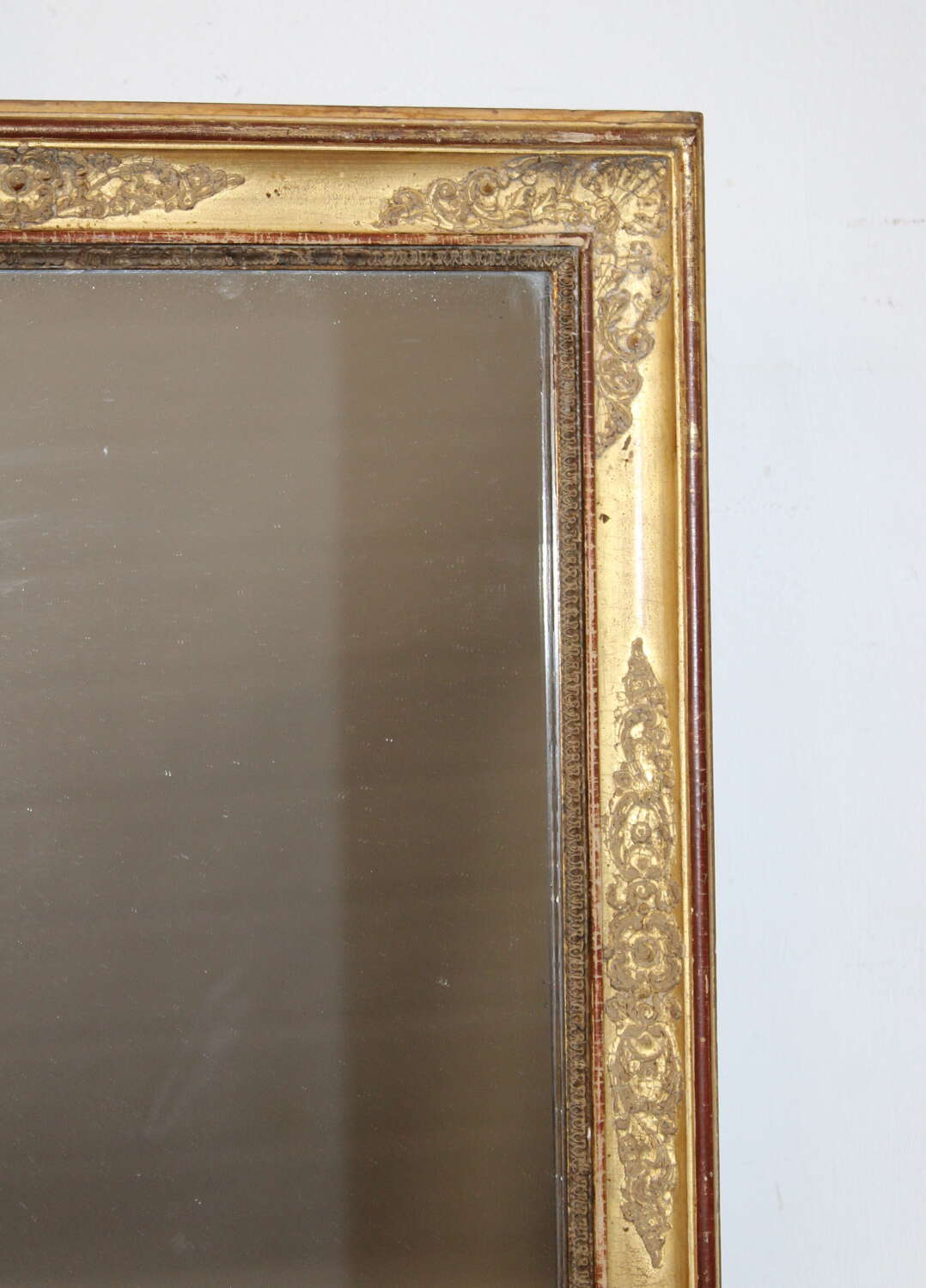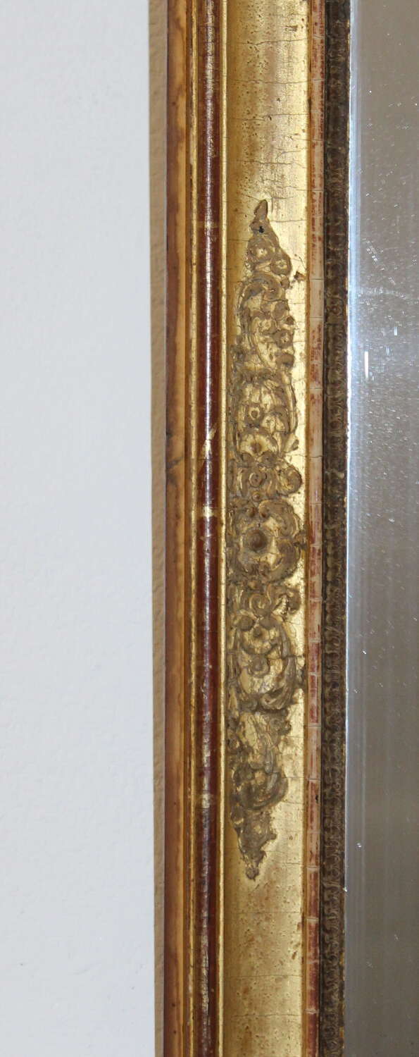 Early 19th century French mirror with a layered gilt frame. The gently incurving central section is decorated with a raised, intricate design of curling acanthus leaves and stems set between two raised, narrow gilt bands which have worn slightly revealing the terracotta bole beneath the gold leaf. The original mercury glass has gentle age towards the base of the mirror, which sparkles when it catches the light and still gives a very good reflection.