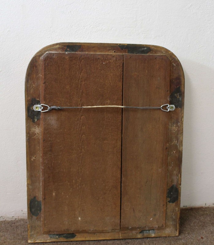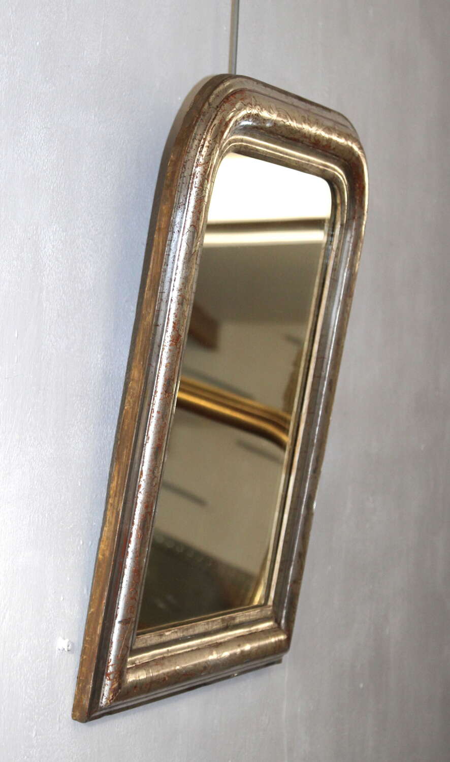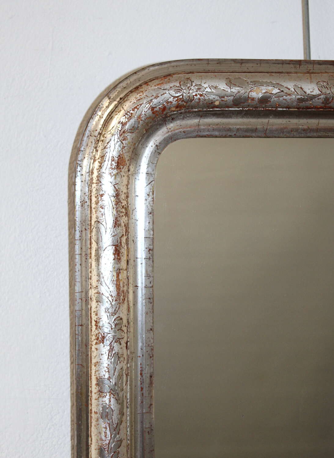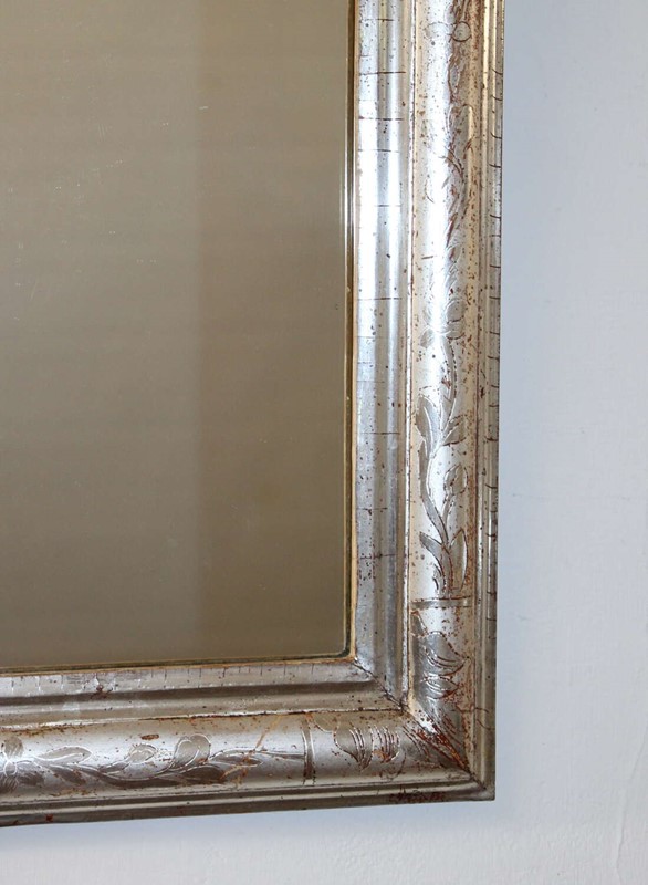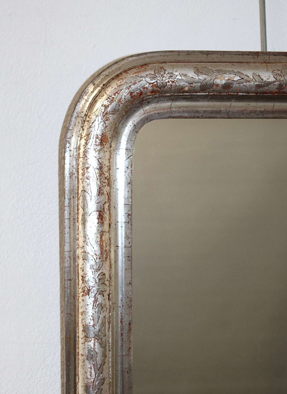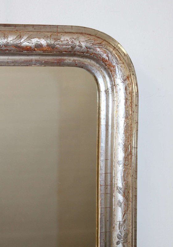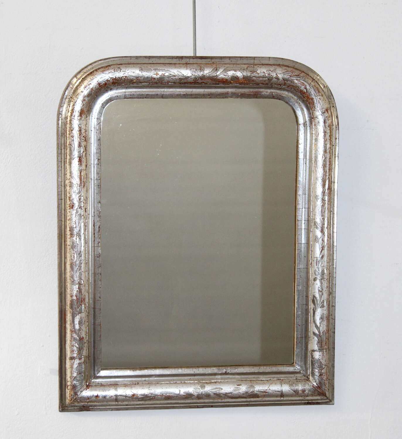 Small antique French archtop mirror, circa 1880, with etched silverleafed frame. Instead of the usual black base beneath the silverleaf, this mirror has a warm terracotta bole under the silver and, through more than 100 years of cleaning, the silverleaf has thinned a little allowing the etched leaf and flower design to show more clearly, lifted by the hints of terracotta beneath. The design changes at each lower corner which has an etched, fanned acanthus leaf. The original glass is in very good condition, gives an excellent reflection and this attractive little mirror would work well in a small bathroom.