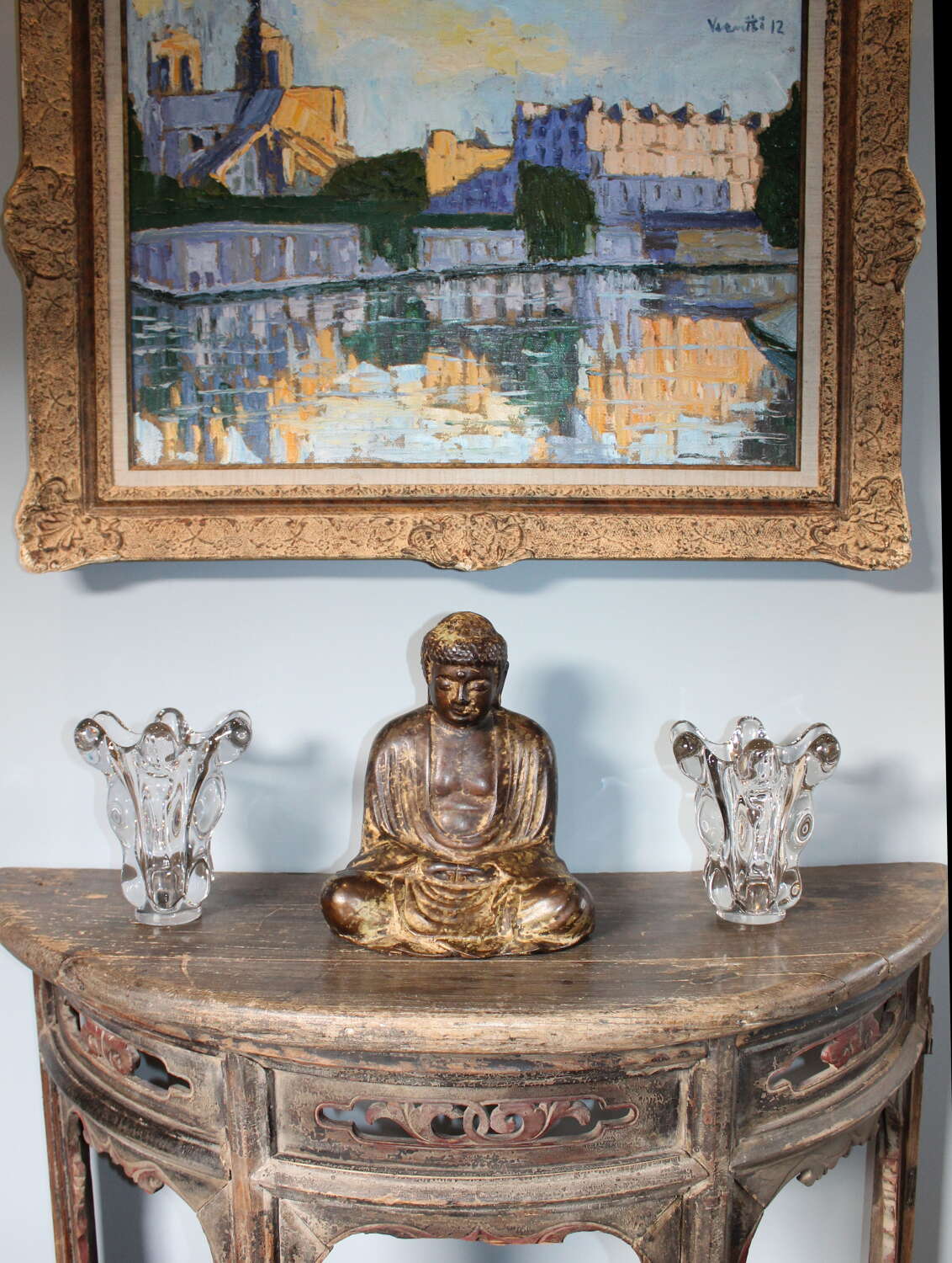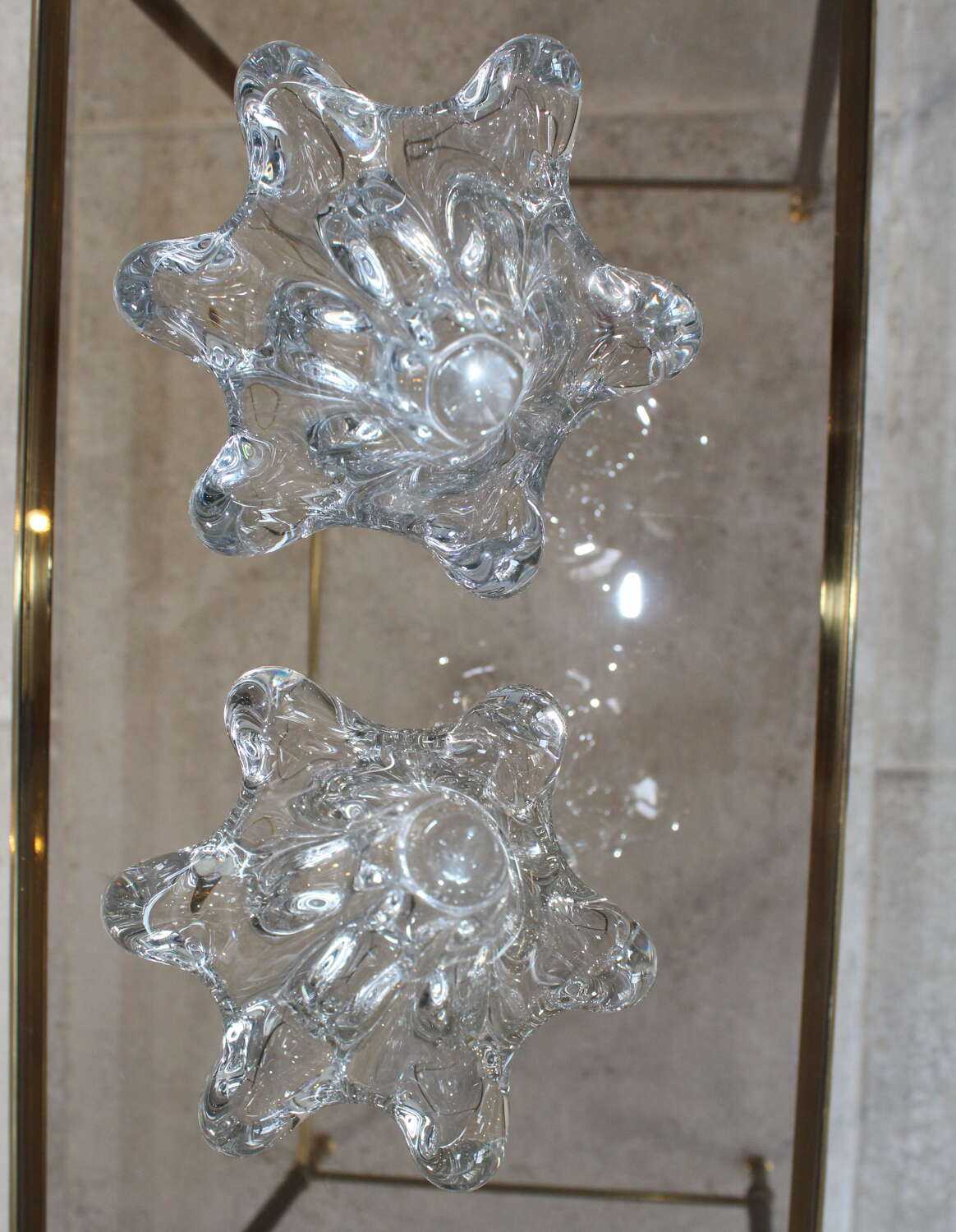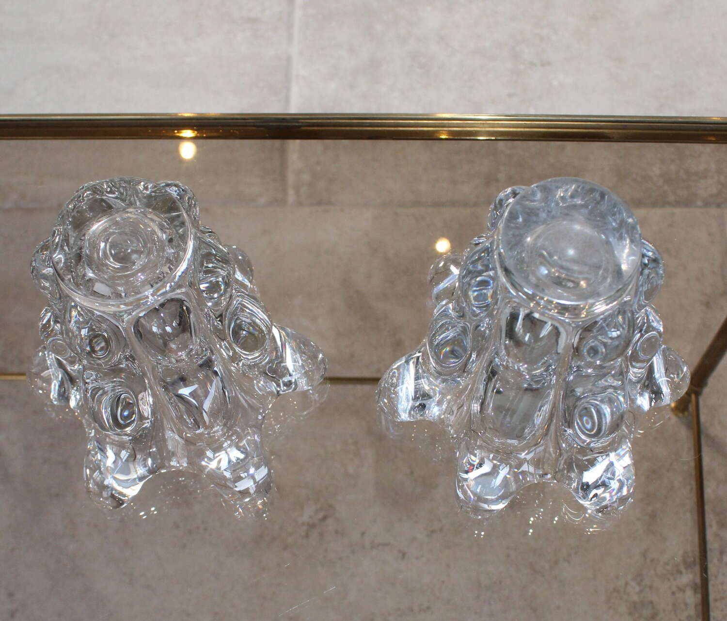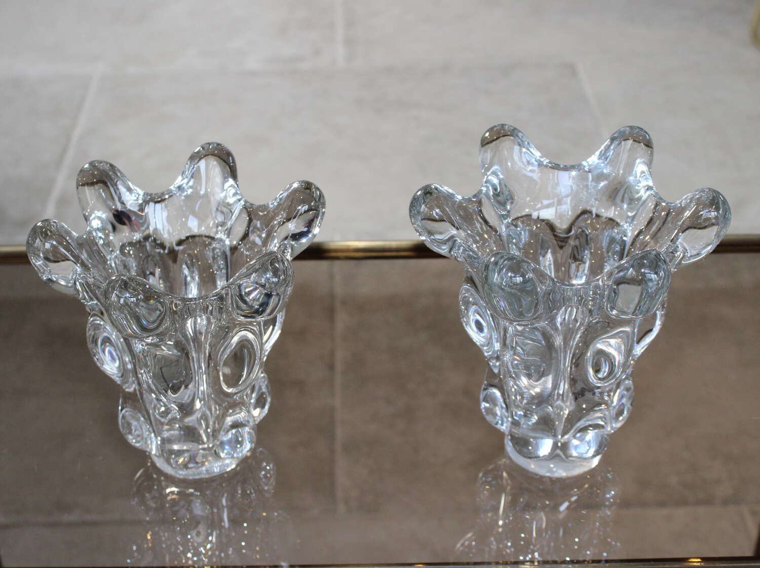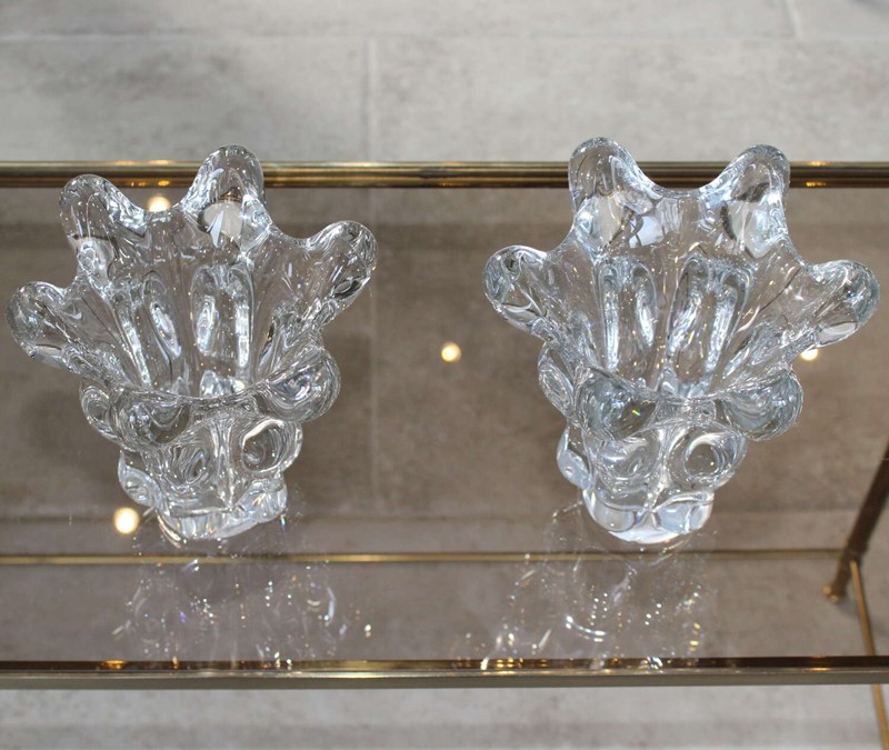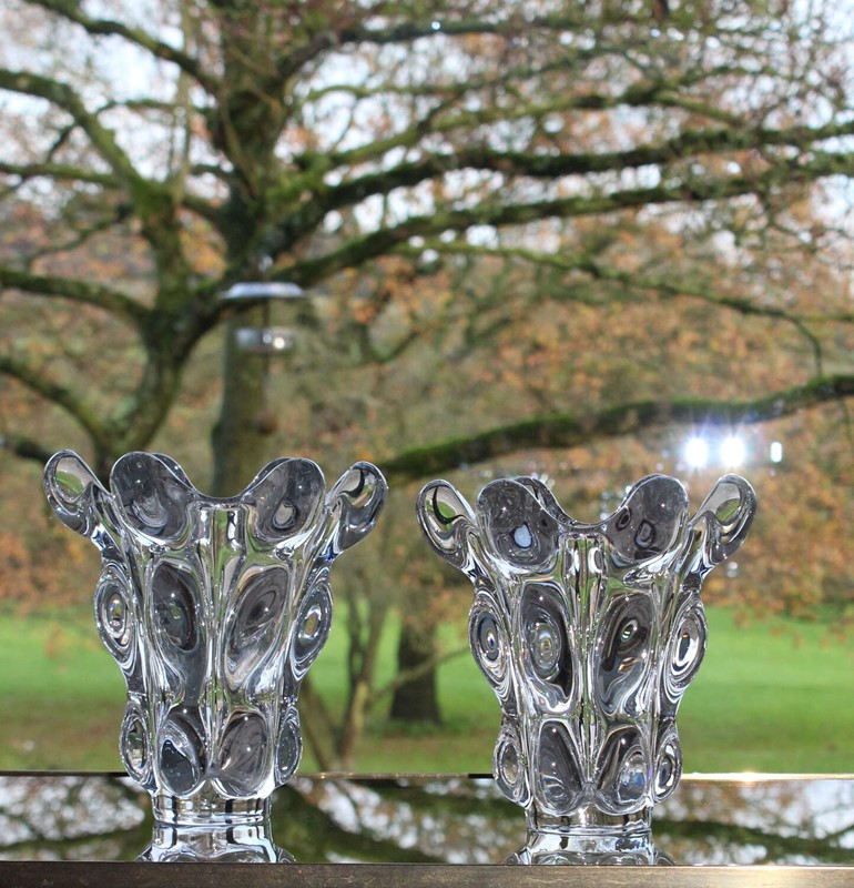Small matched pair of very sculptural, Vintage, French Art Crystal vases, circa 1970. The wonderfully undulating sides are very tactile and catch the light creating oval patterns inside the glass. One vase is one centimeter taller and half a centimeter wider than the other as they measure 17.5cm high by 17cm diameter and 16.5cm high by 16.5cm diameter. They are both in very good original condition with no damage, just a little wear to the base.