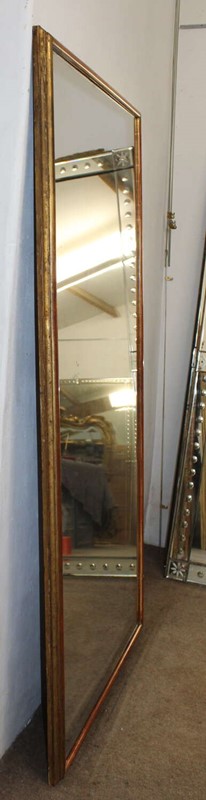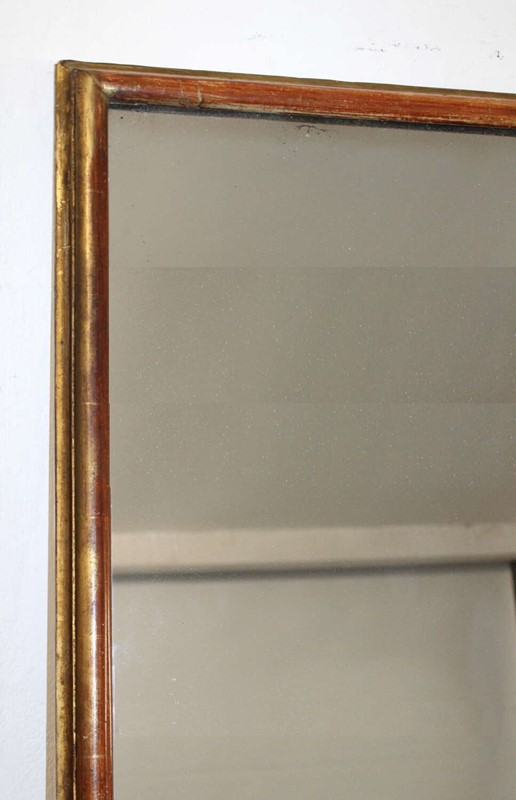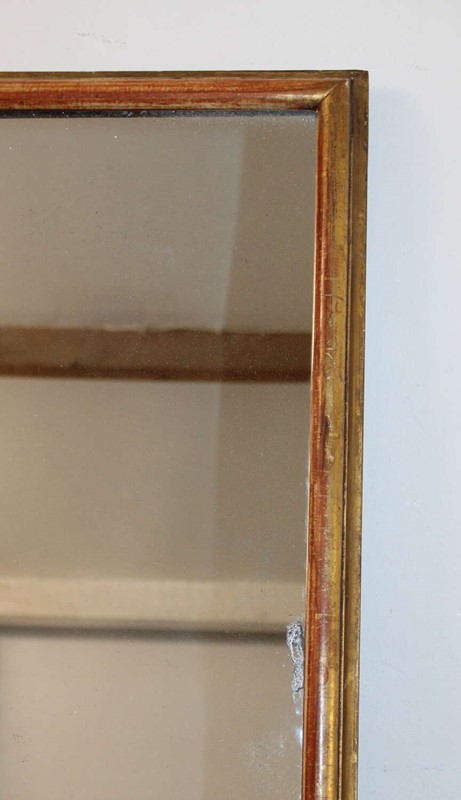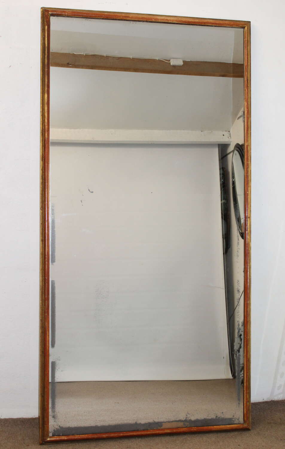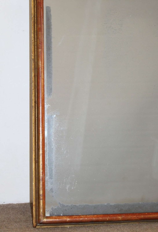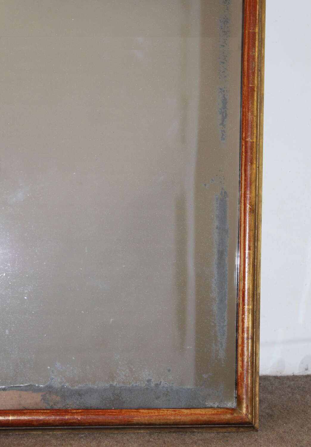 Very large, rectangular, antique French Bistro mirror, circa 1840, with narrow, watergilt frame. Where this mirror has been cleaned for almost 200 years, the gilding has worn revealing the burnished terracotta bole beneath. The original, mercury glass has age around the lower outer edges in the form of narrow bands of foxing, but sparkles beautifully with the central glass clear and giving an excellent reflection. This mirror can be hung portrait (as photographed) or landscape.
