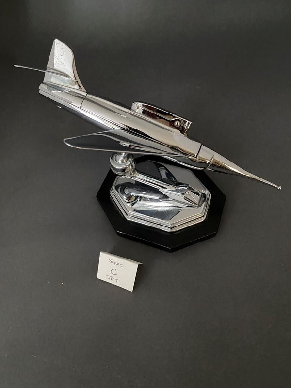 Sonic jet Chrome table Lighter 1950s, Sitting on swivel ball, Swivel ball sitting on cased Spring, Holding the jet in different positions. Removeable lighter, to refill. Chrome shaped base, sitting on black Bakelite base. Chrome Plating in very good order