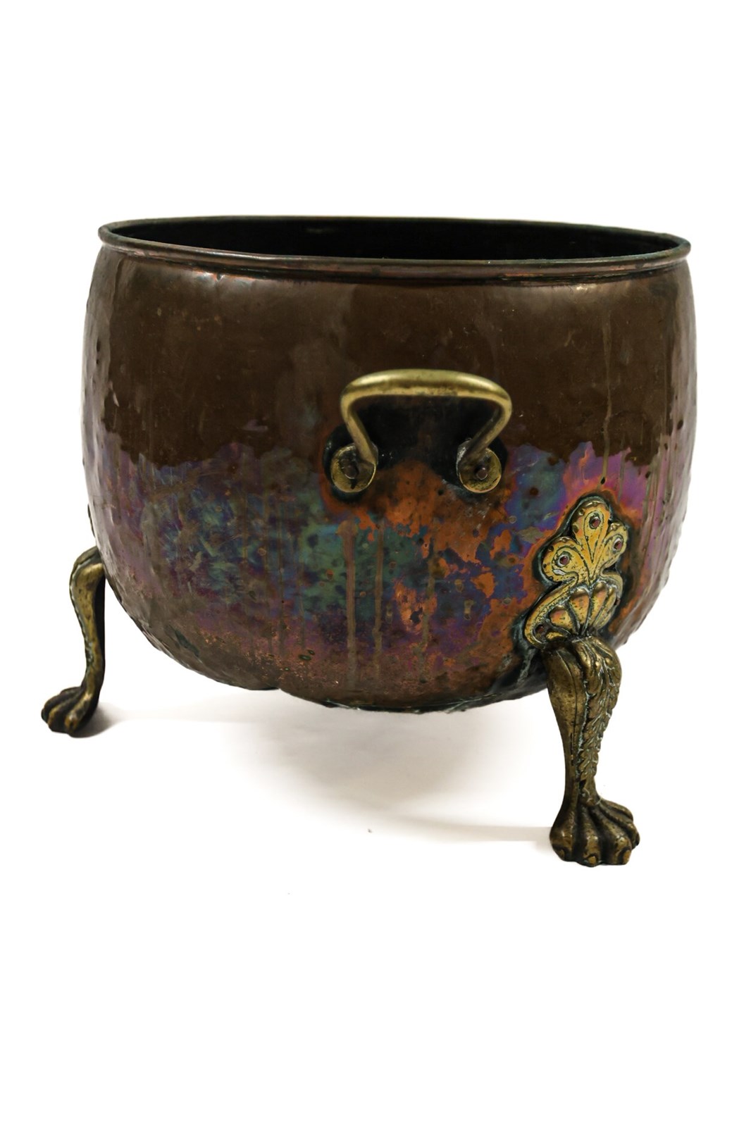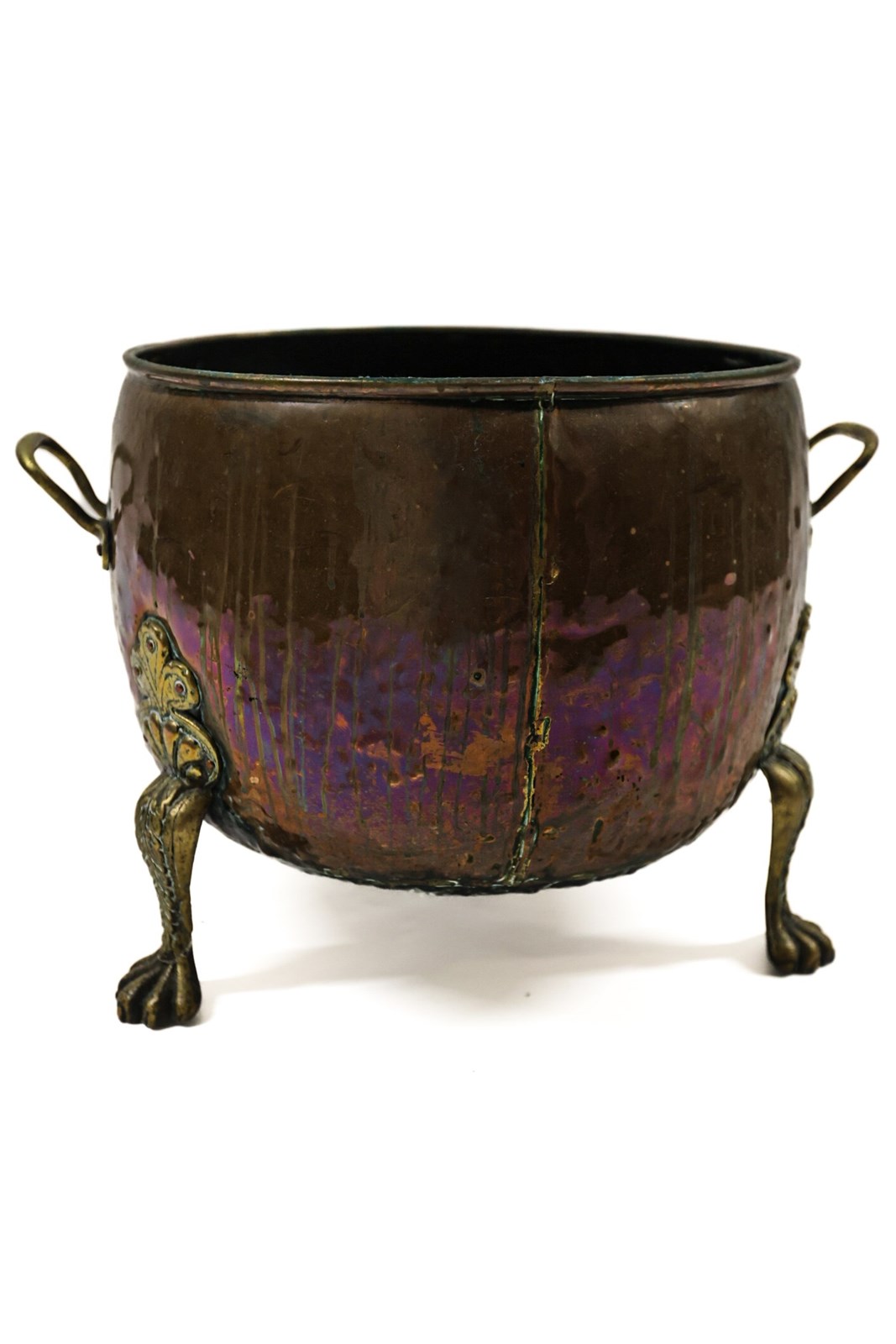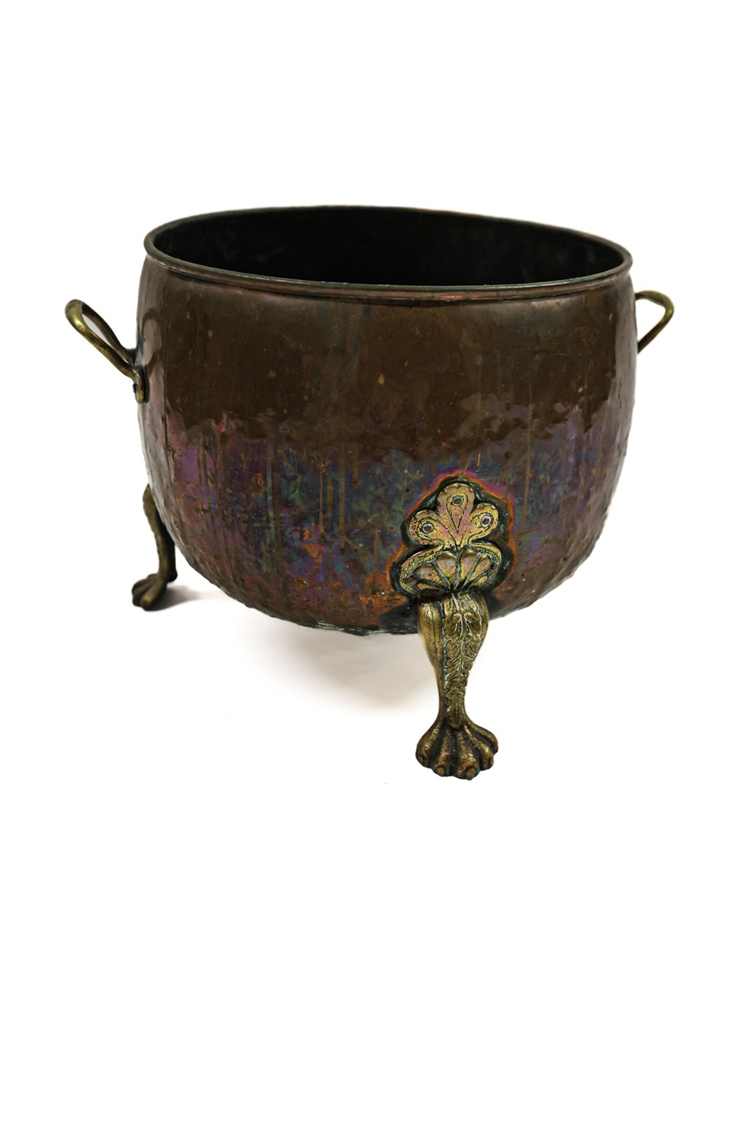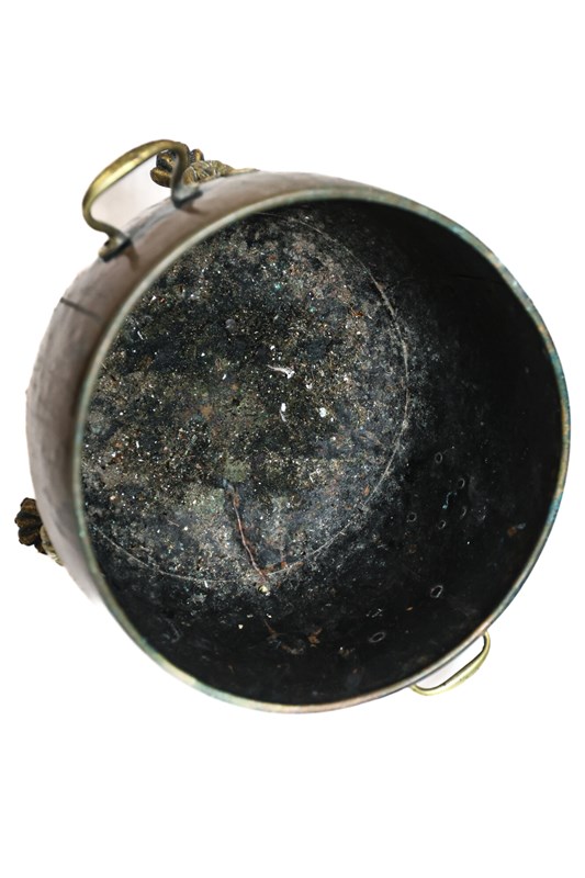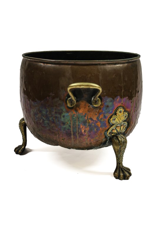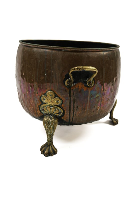 Originally a brass cauldron, used in the kitchen, and would have had a lid, the brass feet have been added at a later date