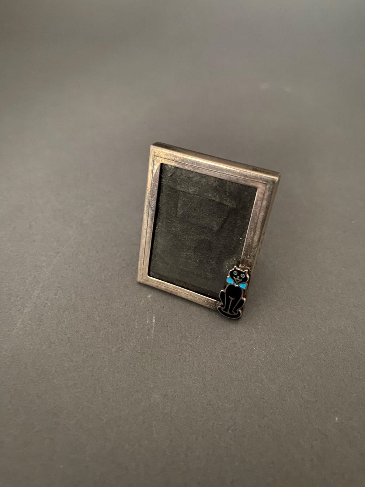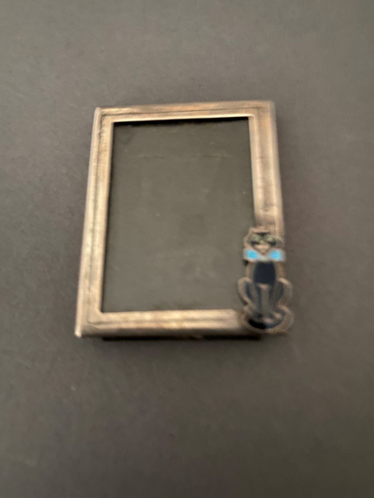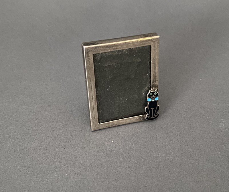 Alfred Dunhill siver Miniature photoframe with Black enamel cat with light blue bow collar, Etched DUNHILL LONDON on top of back. Hallmarks AD London 1939, Black Easel back, Slides down to fit picture. No Dents on frame.