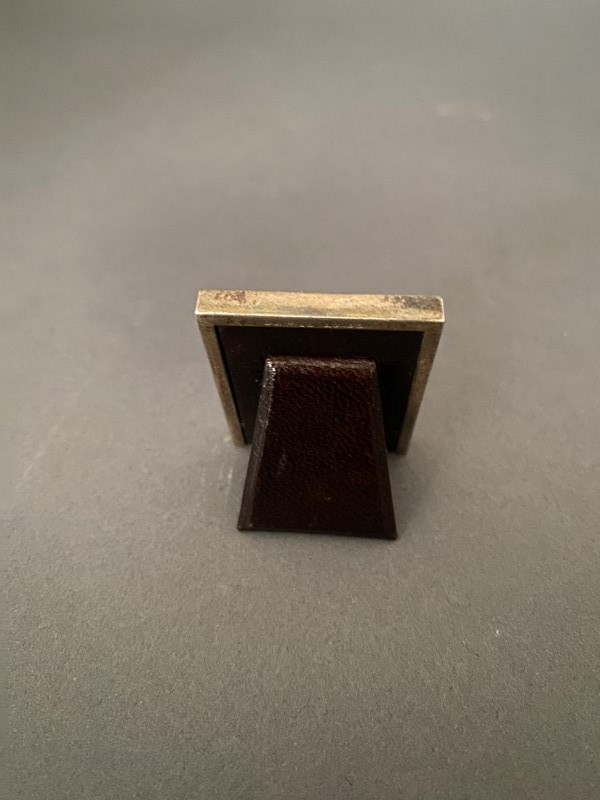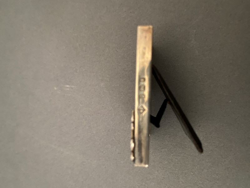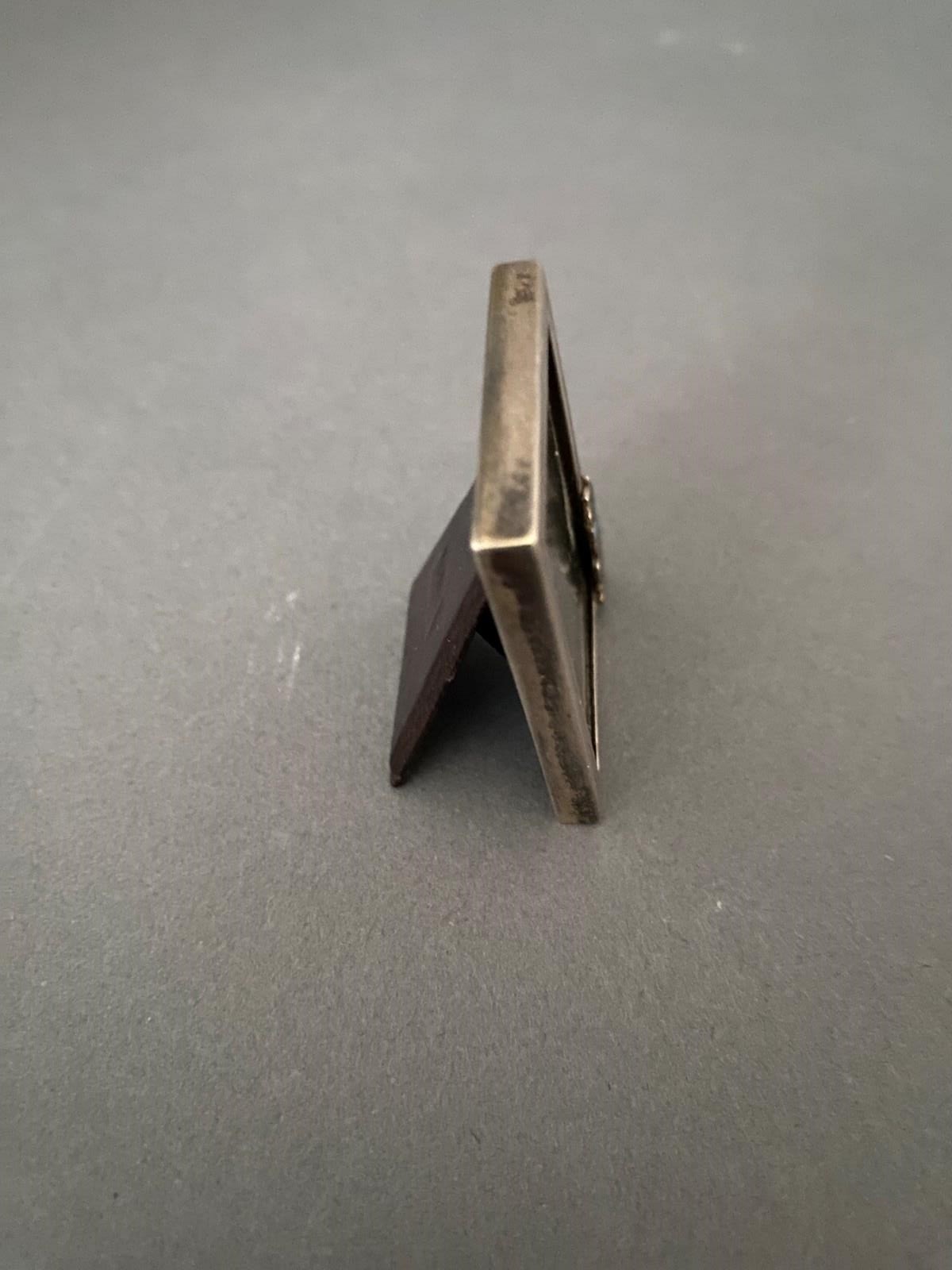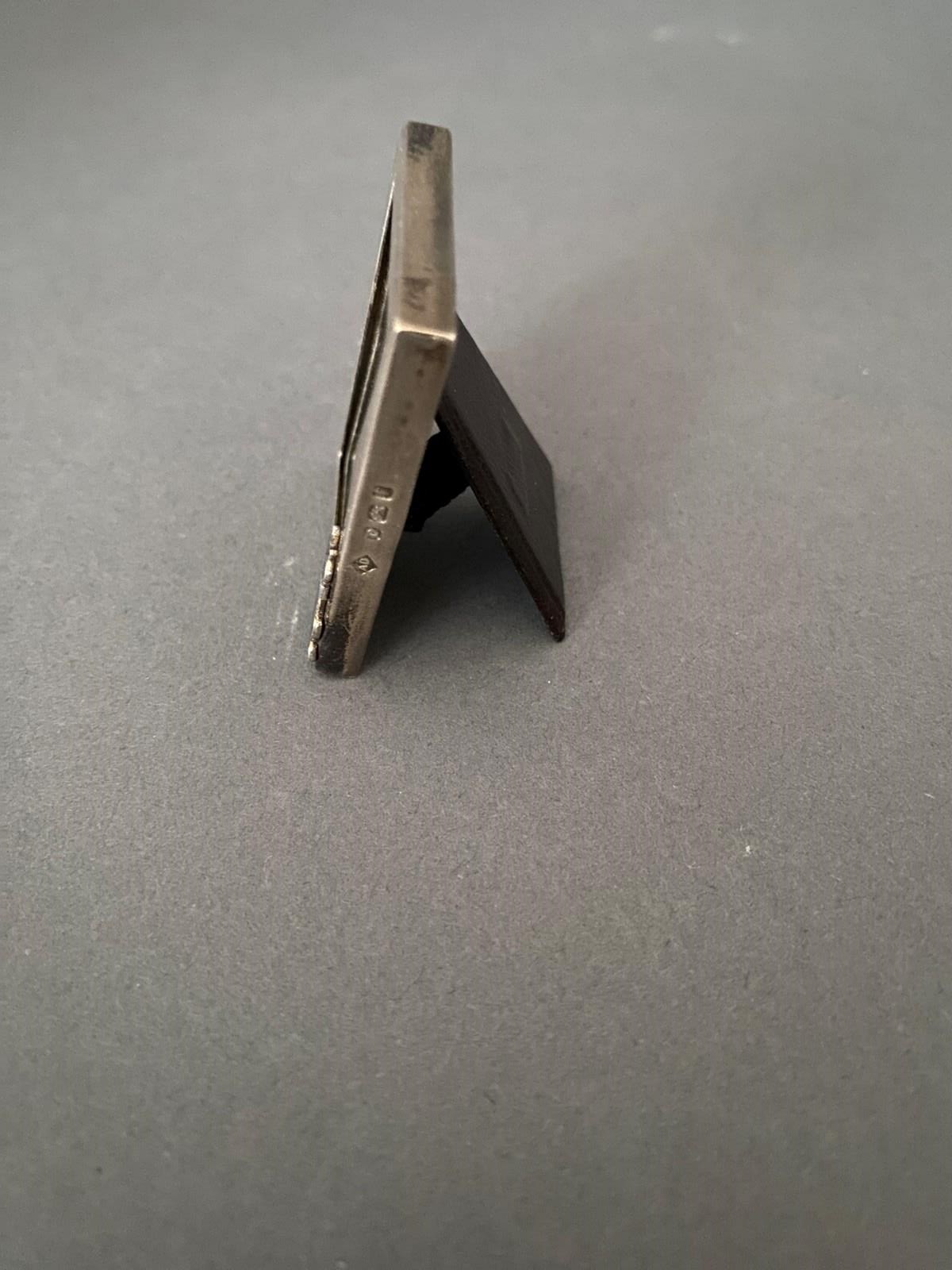 Alfred Dunhill siver Miniature photoframe with Black enamel cat with light blue bow collar, Etched DUNHILL LONDON on top of back. Hallmarks AD London 1939, Black Easel back, Slides down to fit picture. No Dents on frame.
