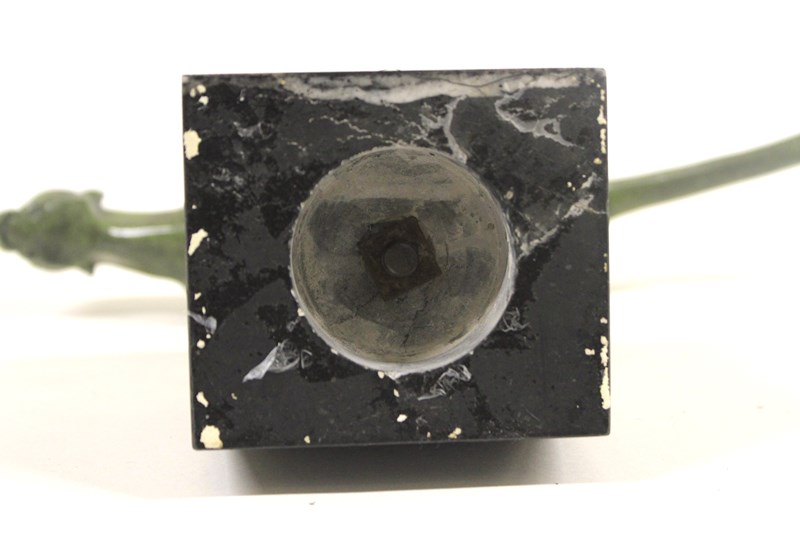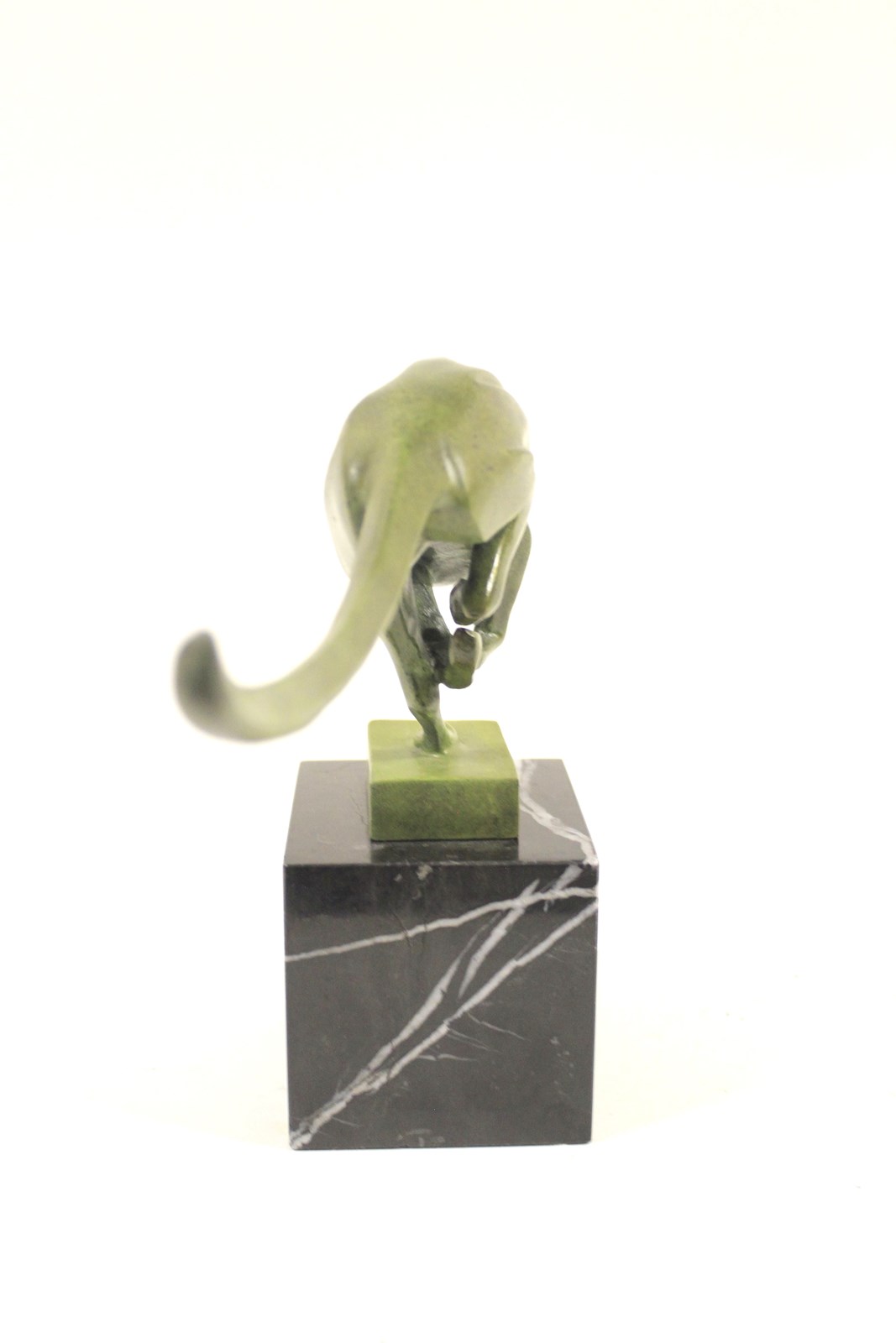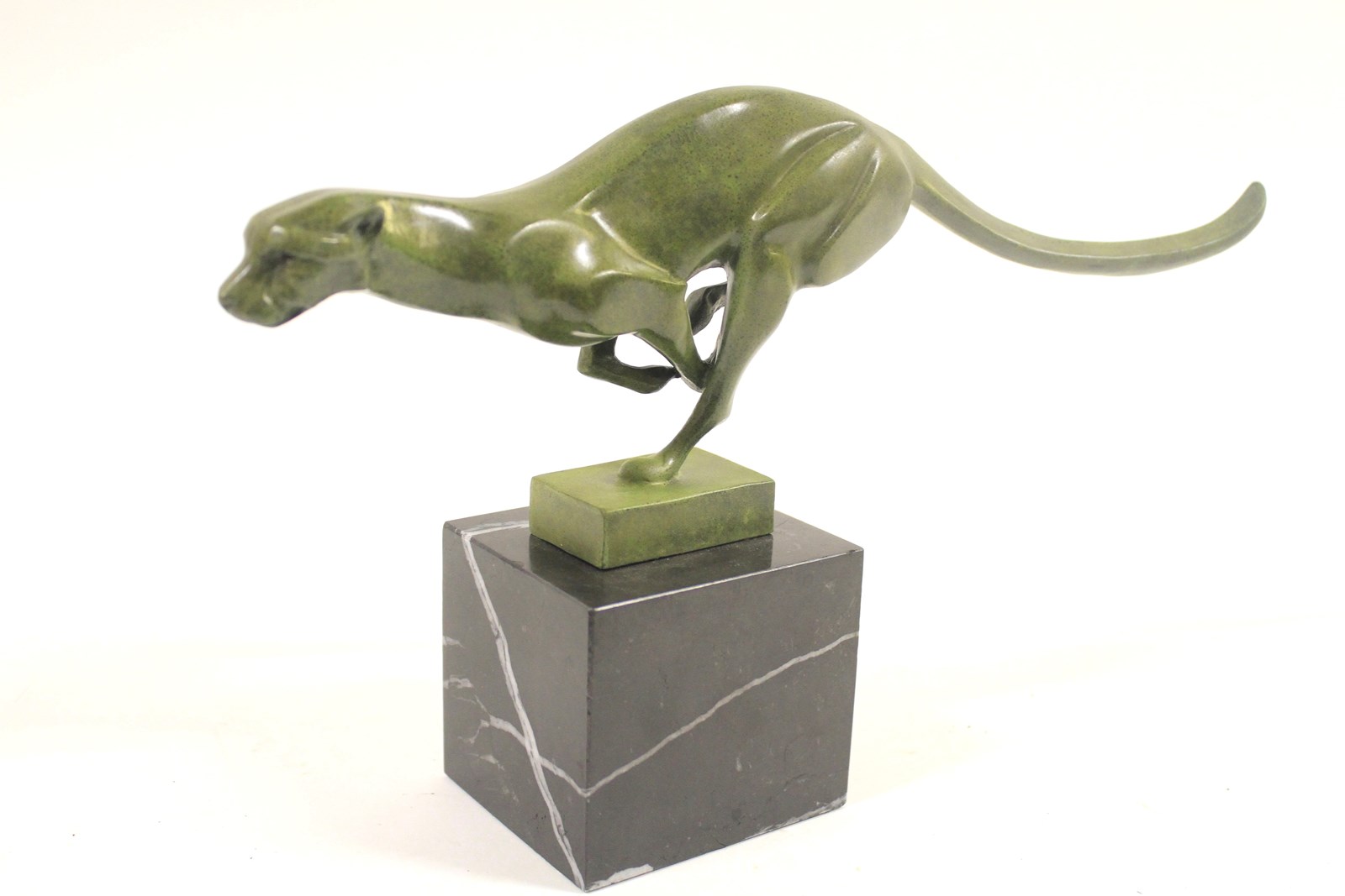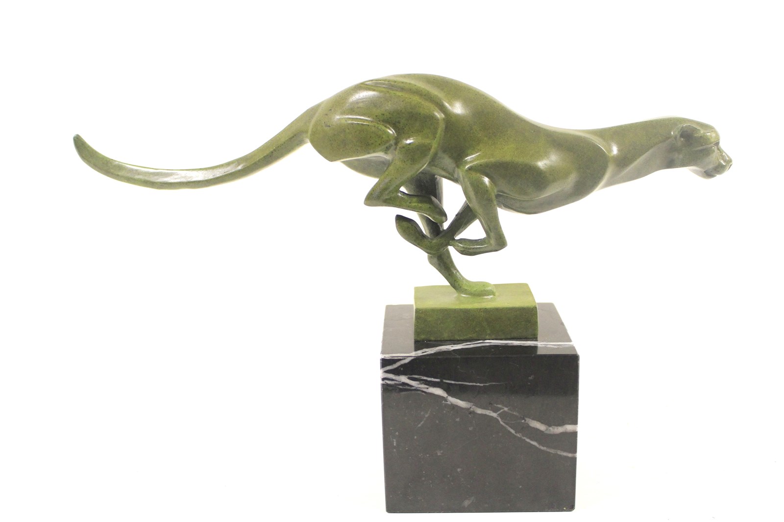 Art Deco Bronze Stylized running Cheetah circa 1930s with green Patination, mounted on Black Marble base, not signed