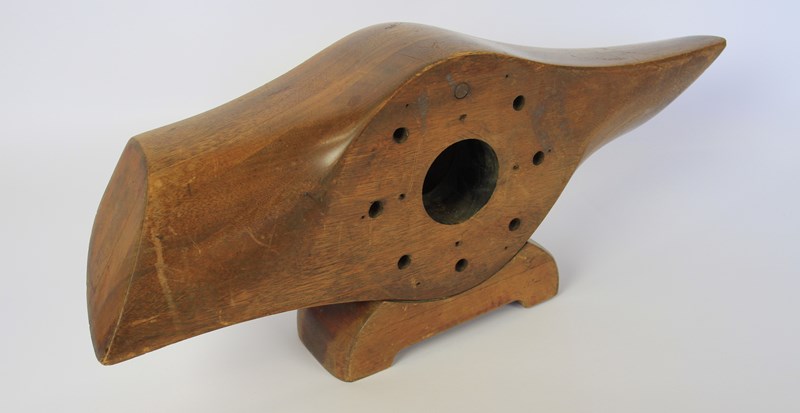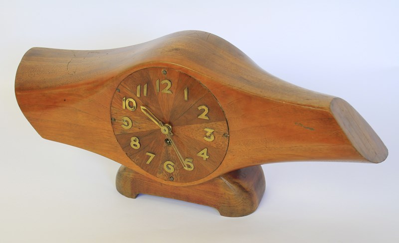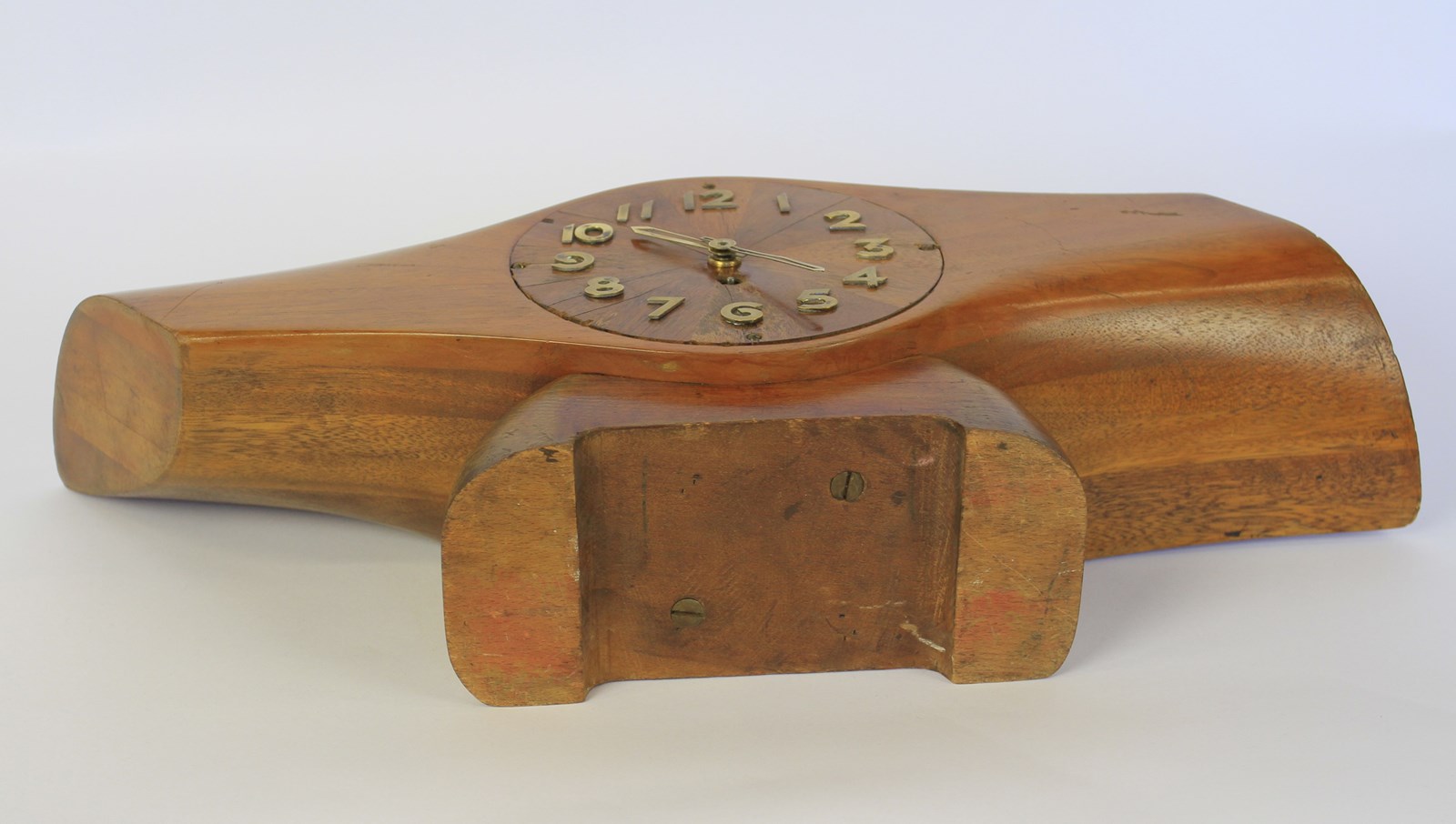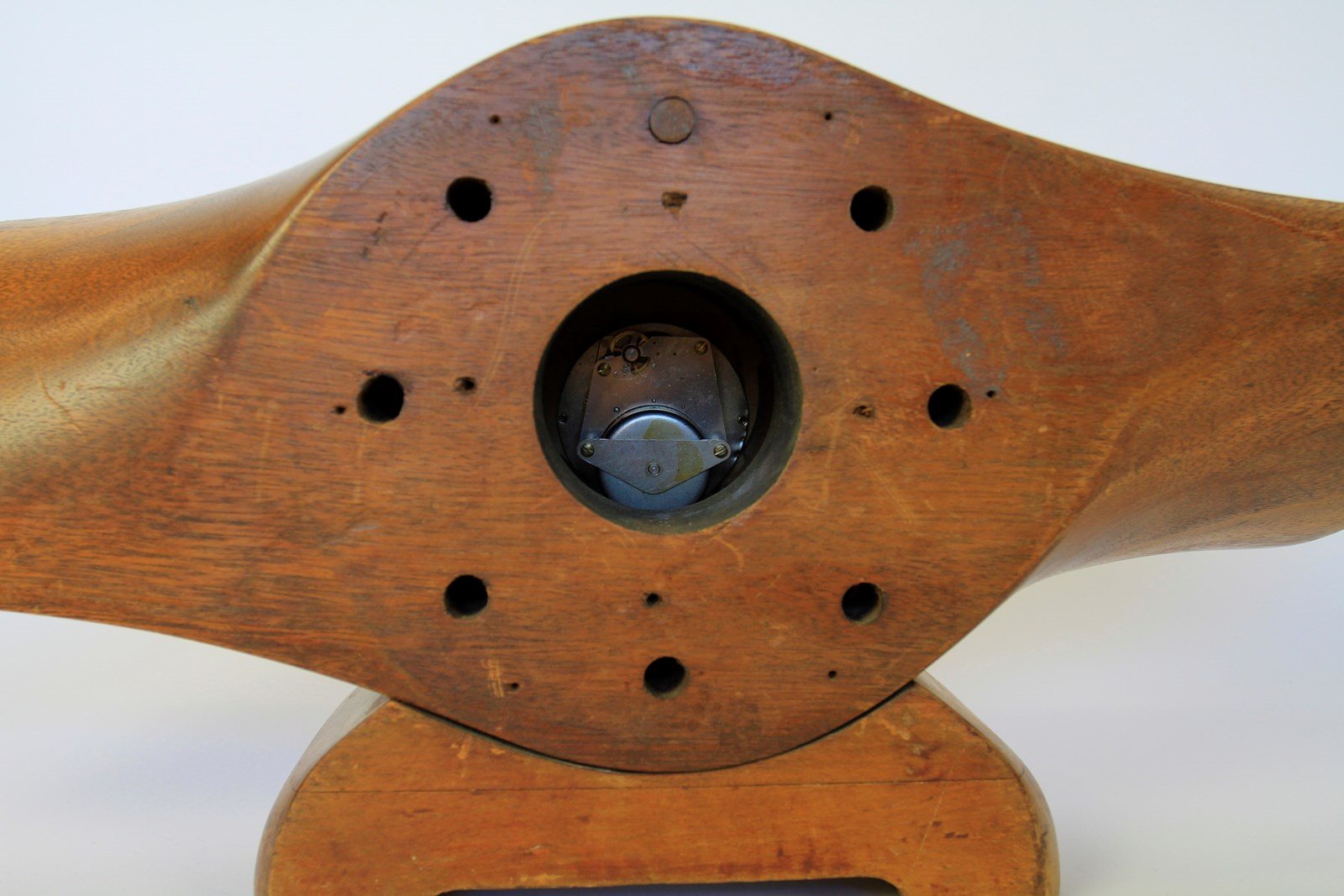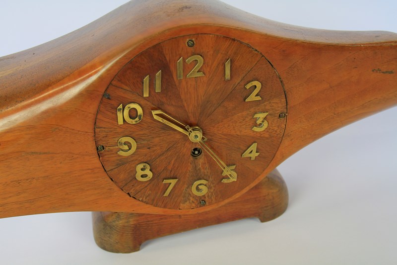 Art Deco Propeller clock circa 1920s. Circular Walnut segmented clock face, with brass hands & numbers, Inset in centre part of a Aeroplane propeller, 30 hour Clock Movement. with key, good working order and recently serviced. All sitting on Arch shaped base