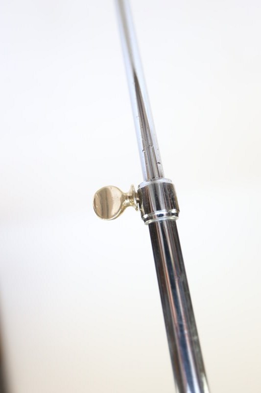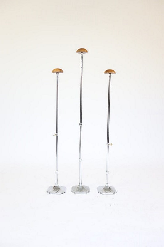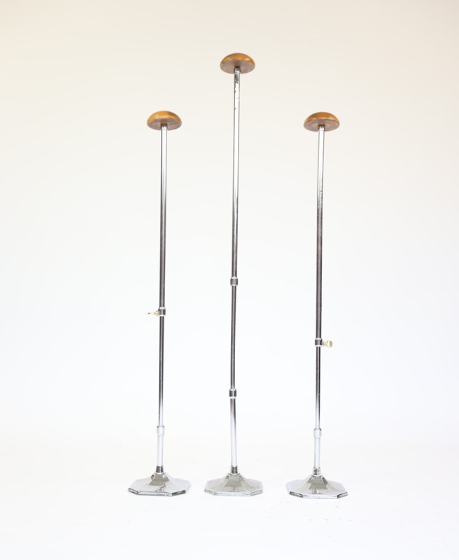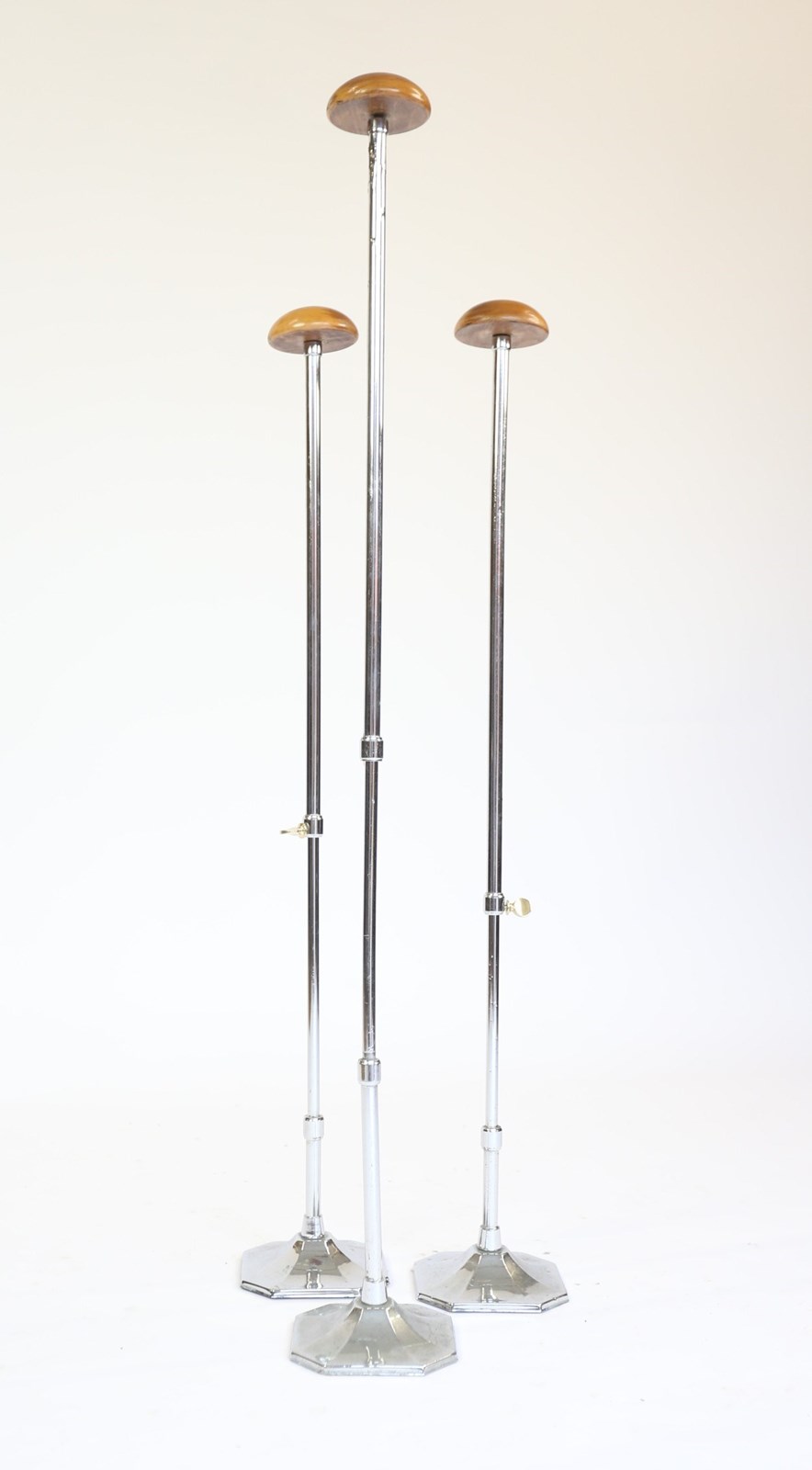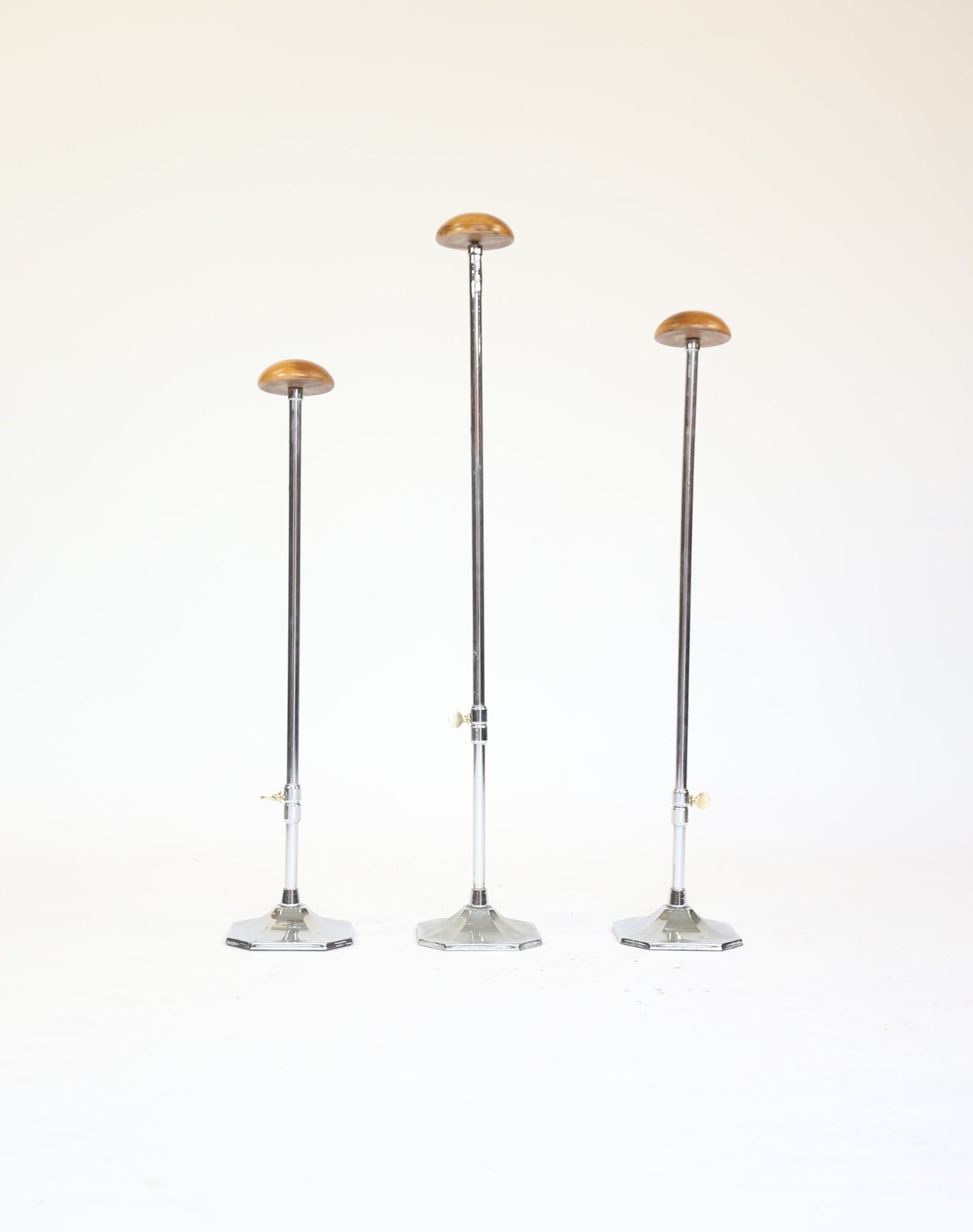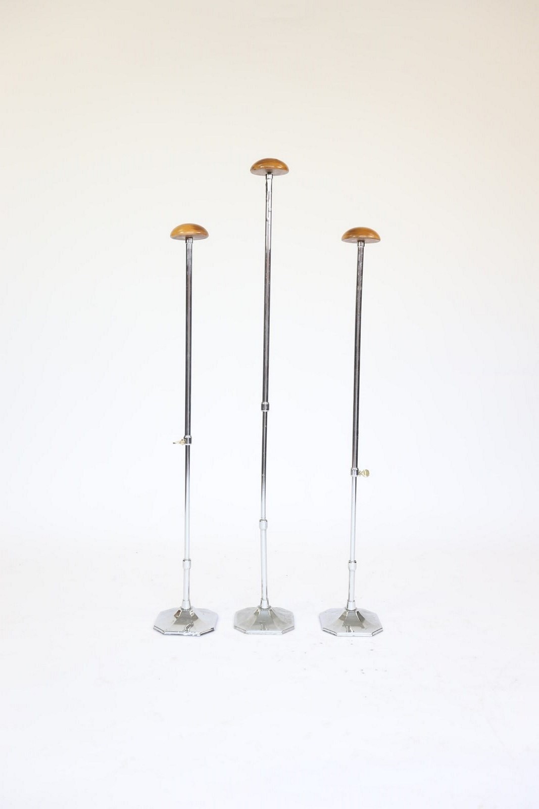 Art Deco Set 3 Chrome & Beech Shop Display Hat Stands. Telescopic Chrome plated Columns, with Brass Pinch Screw, Beech Dome tops to hold hats for Display. Art Deco Shaped Splayed Chrome caps sitting on cast Iron basis, Held by bolts underneath, Chrome Plating In good Original Condition.