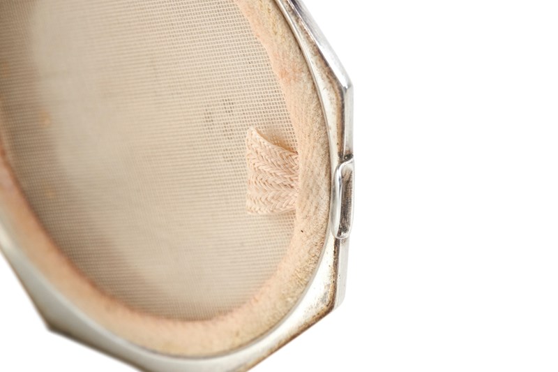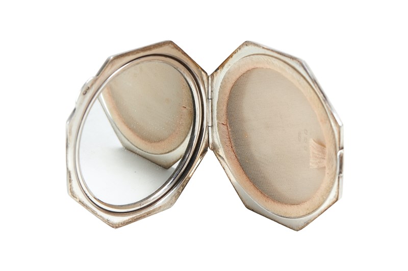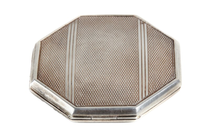 Art Deco Silver Octagonal Powder Compact, Engine turned detail, with Empire State Building on top, HMA initials, interior mirror, no dents or scratches to case. Hallmarked Birmingham 1922 makers mark B & Co.
