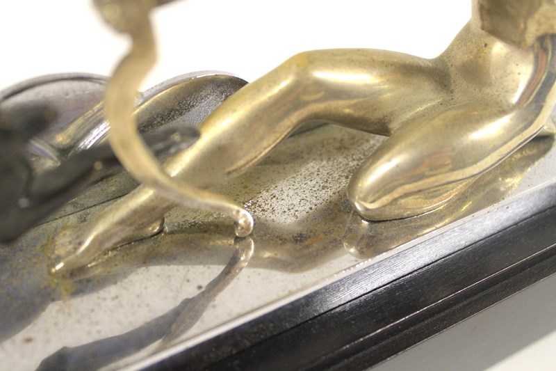 Art Deco Silver Plated Diana the Huntress Figure circa 1930s Silver plated on Bronze, Stylized Bronze figure of a deer, Chrome Plated Base and Stylized Backround [some pitting to the chrome base]. Mounted on Ebonised Hardwood stand. Green Baize on base